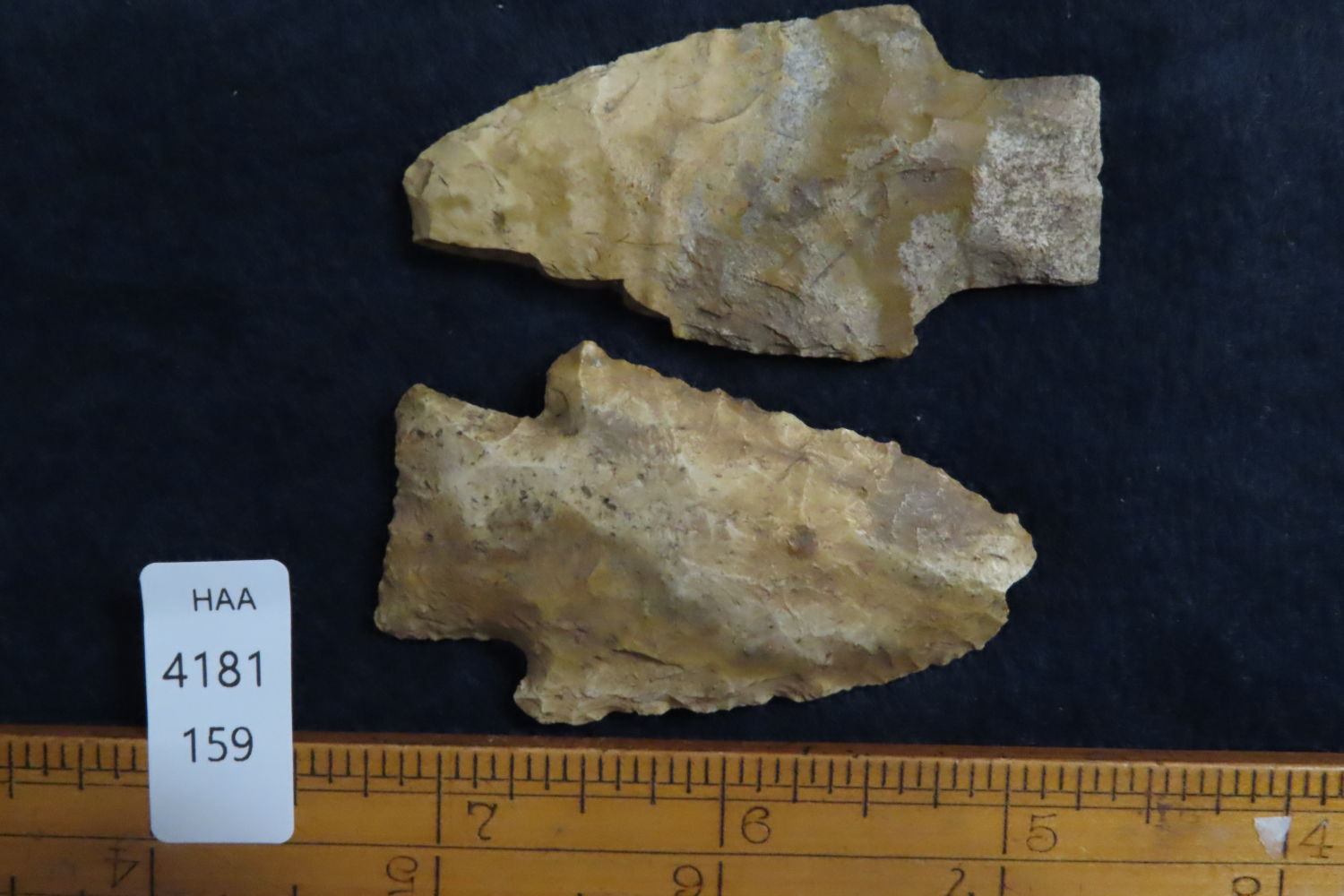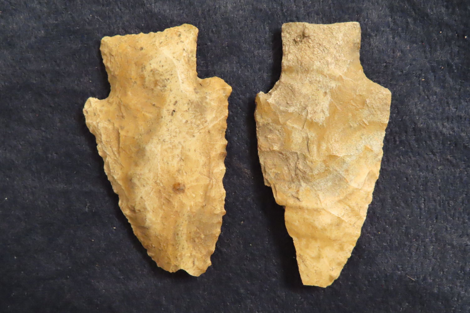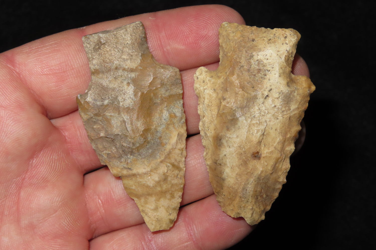 Lot of 2 Arrowheads, longest is 2 7/16″, found by Ronald and Eileen Hubbard at the Kinderhook, IL hog lot.