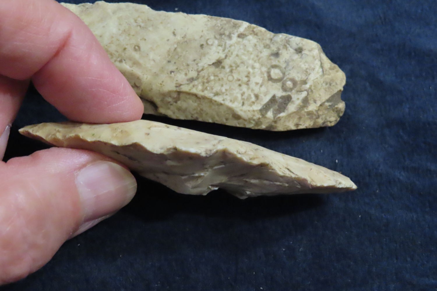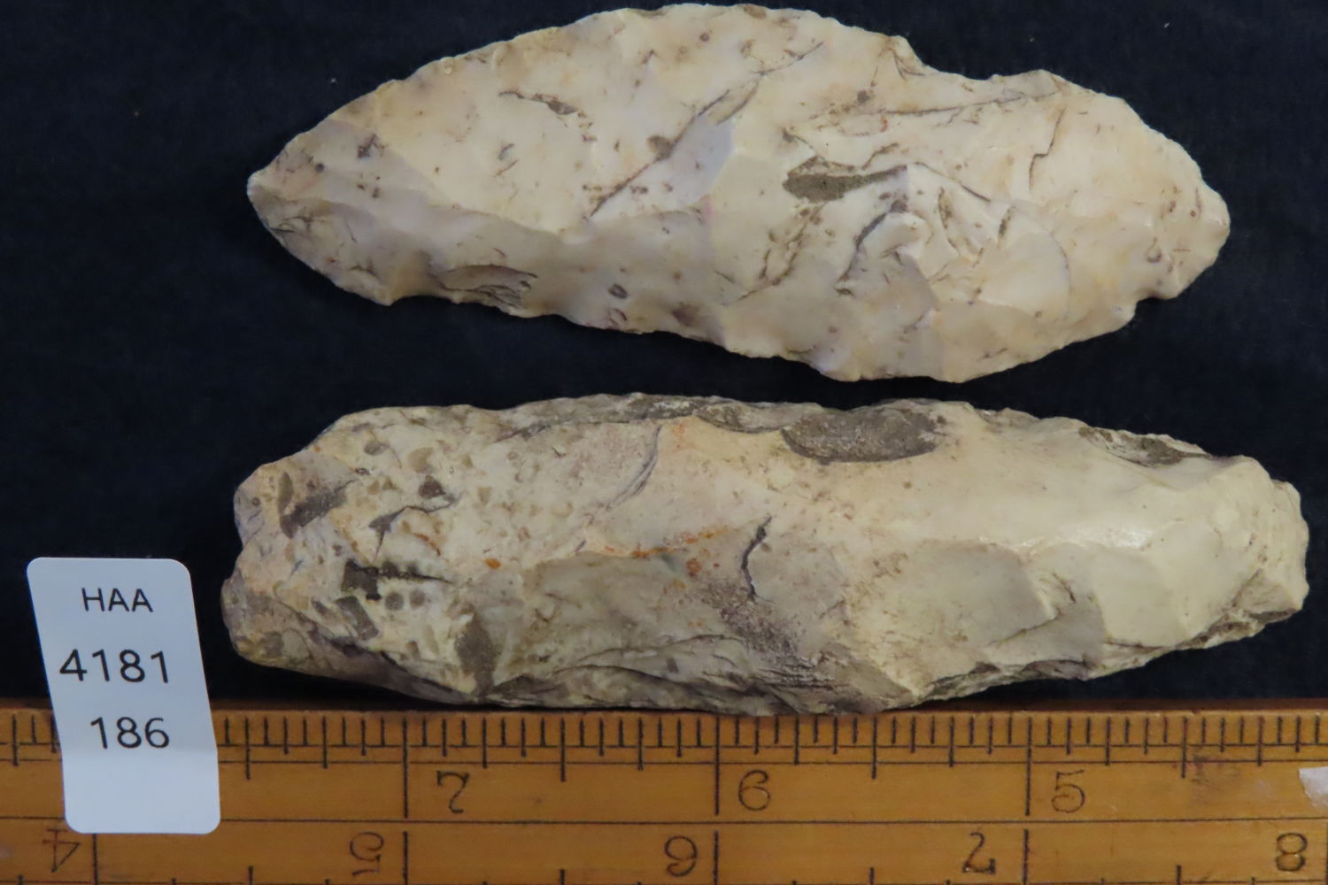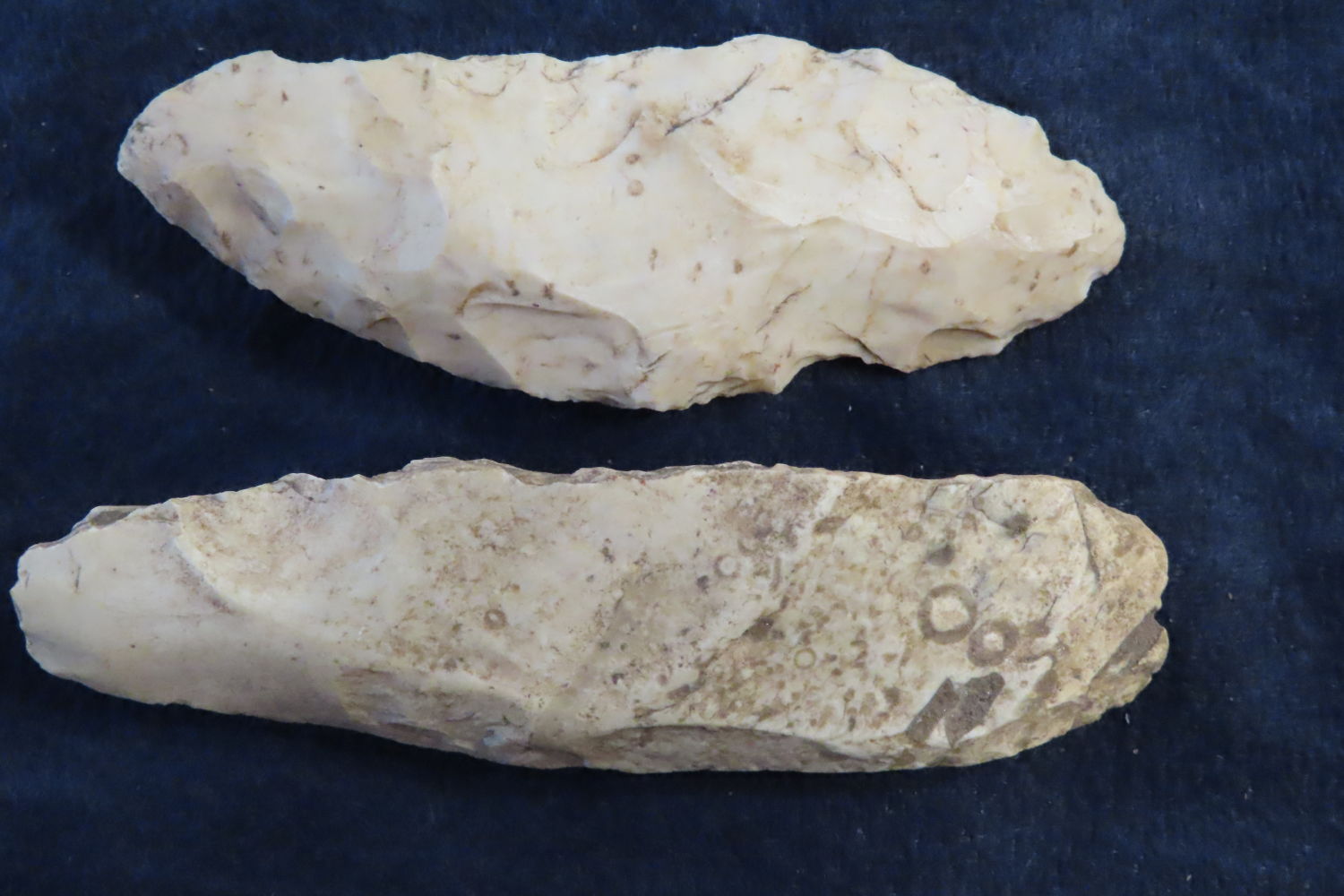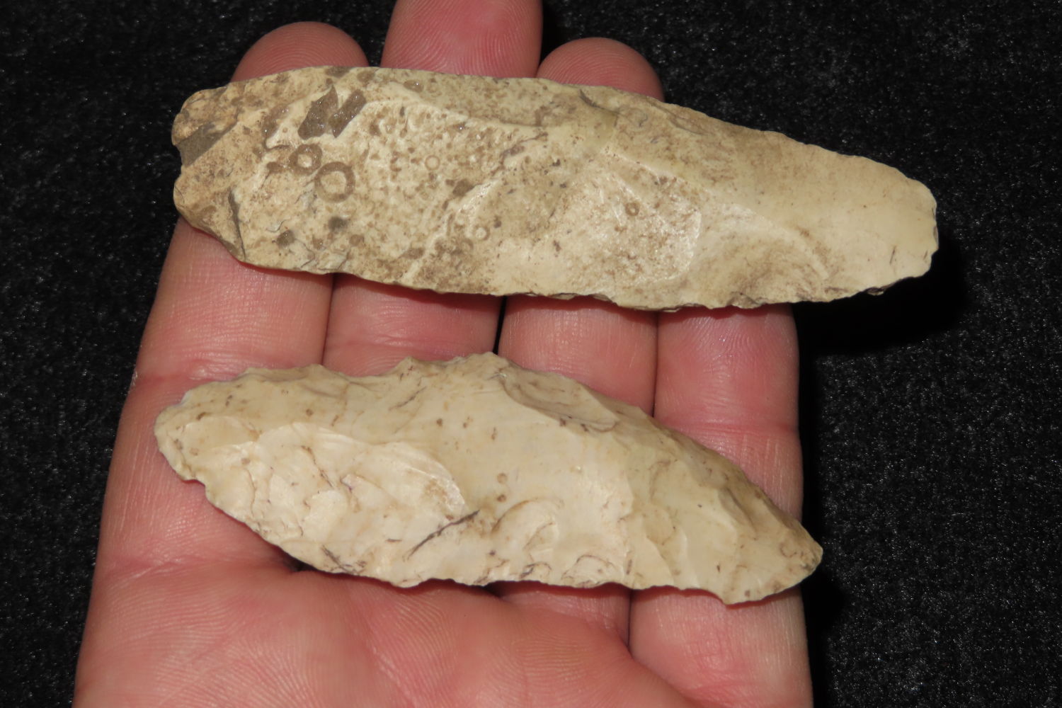 Lot of 2 Blades/Scrapers, Longest measures 3 1/2″, found by Ronald and Eileen Hubbard at the Kinderhook, IL hog lot.