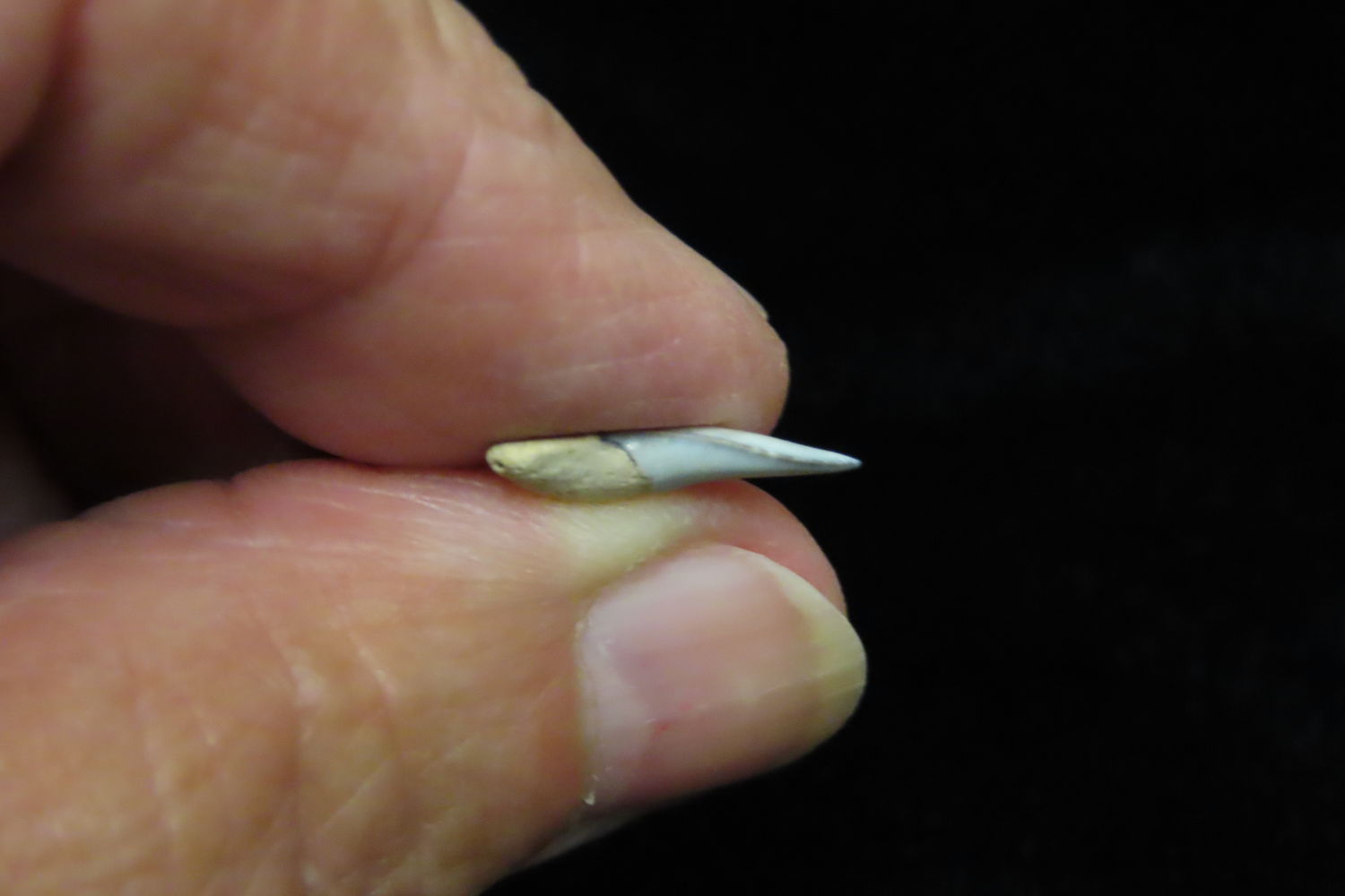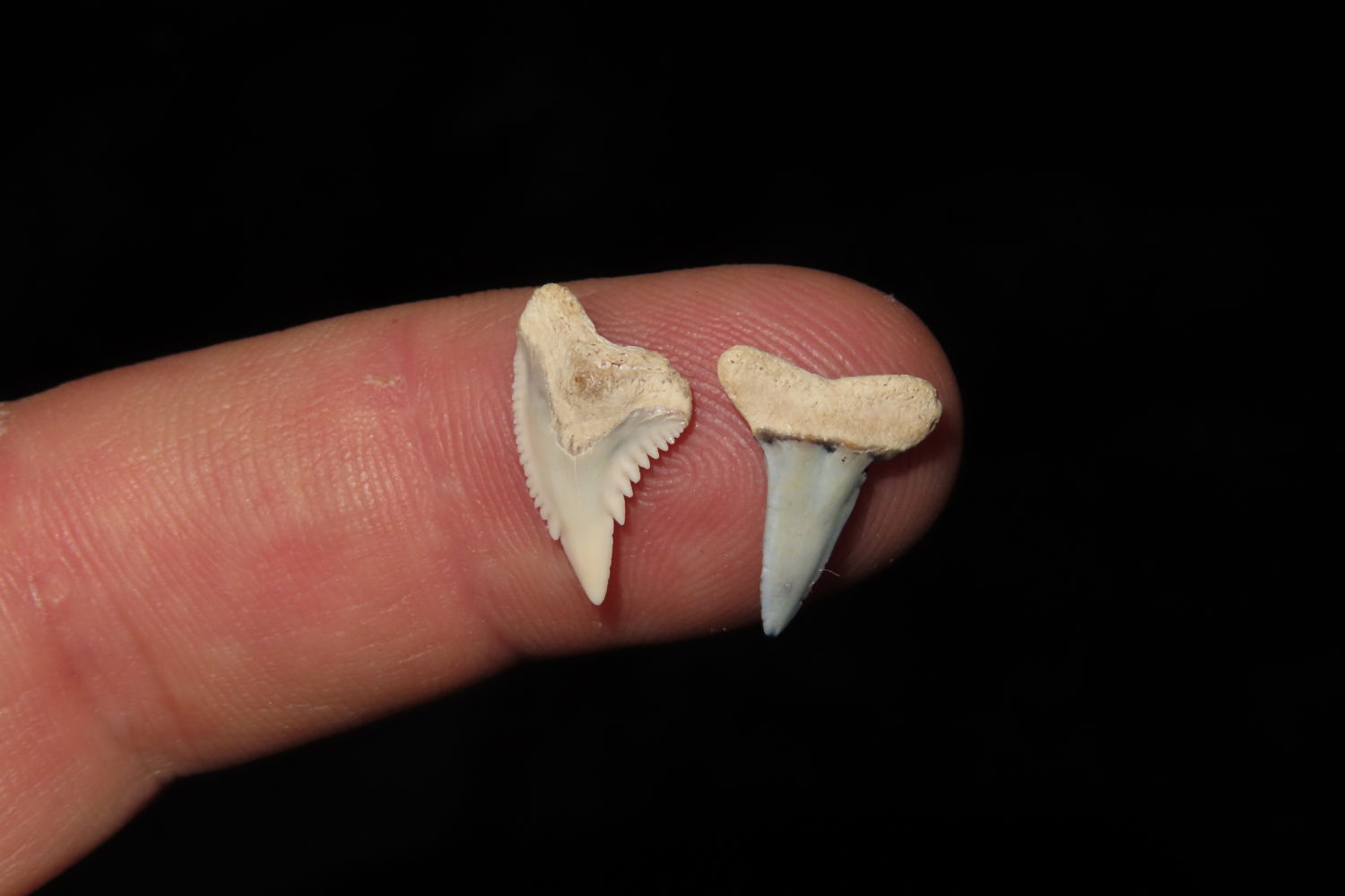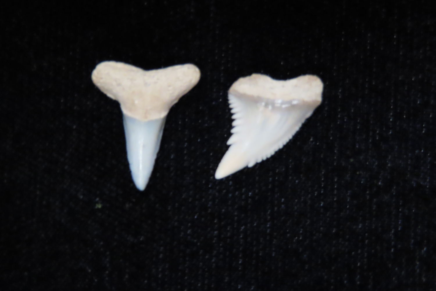 Pair of Shark Teeth Fossils: 5/8″ Hemipristis and 9/16″ Lemon Shark, found by Ronald and Eileen Hubbard at the Kinderhook, IL hog lot.