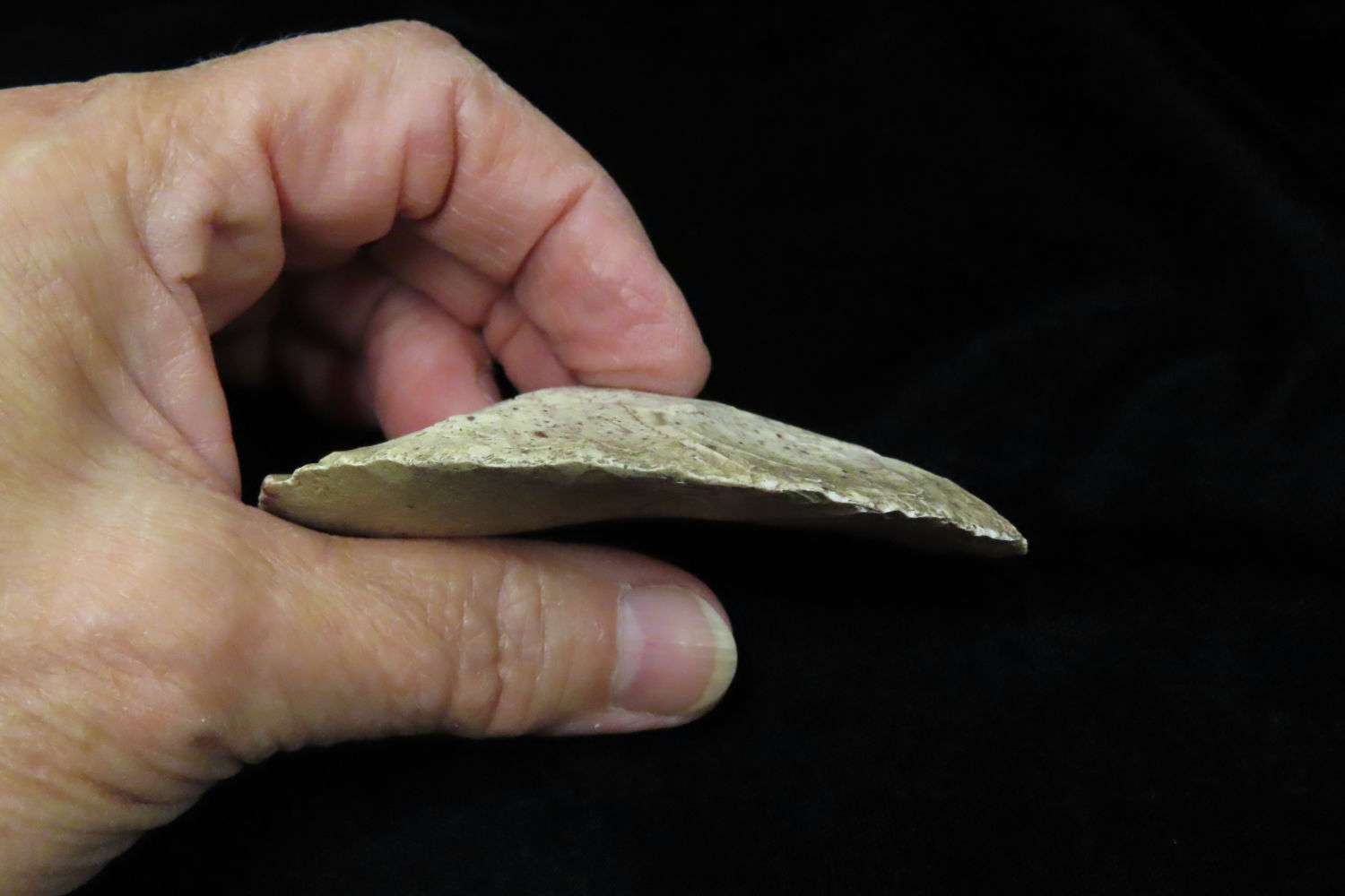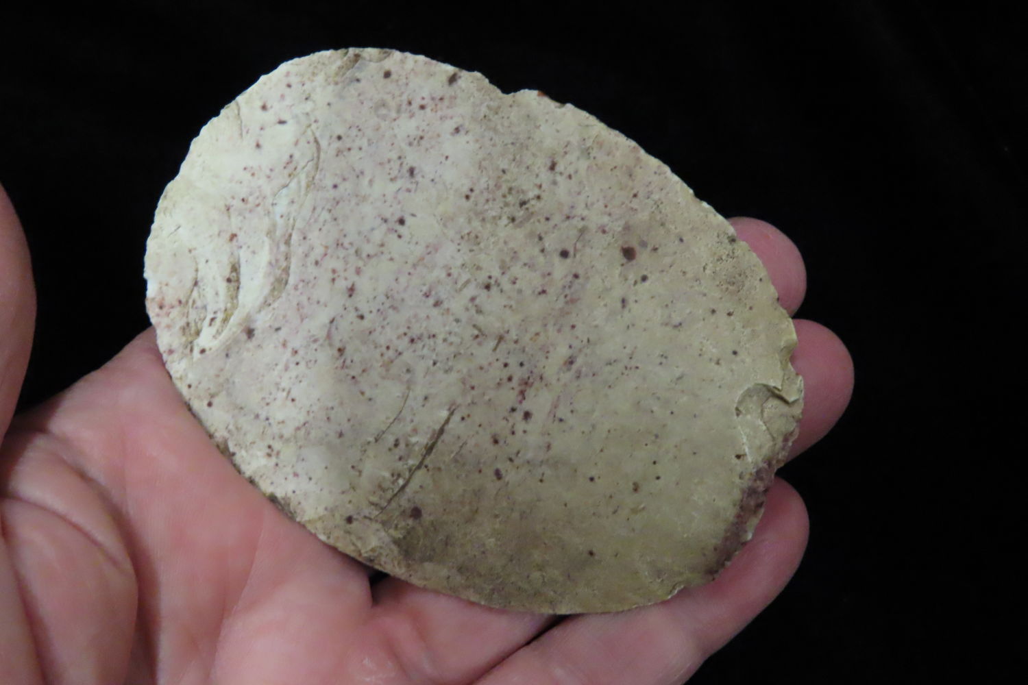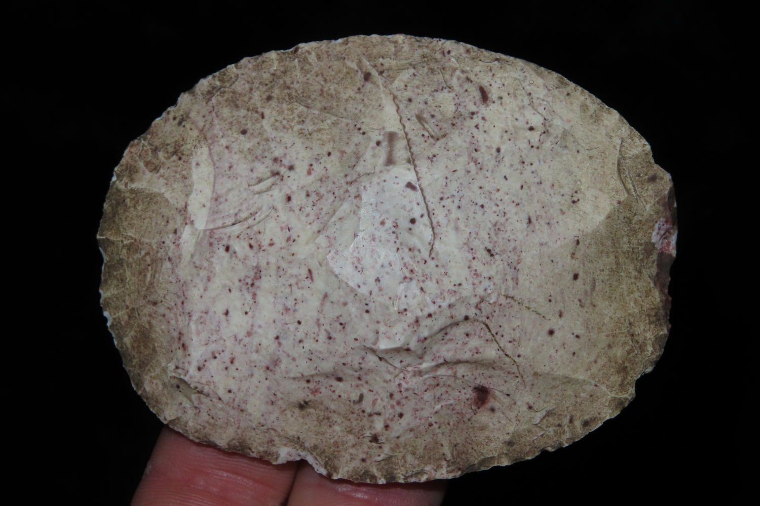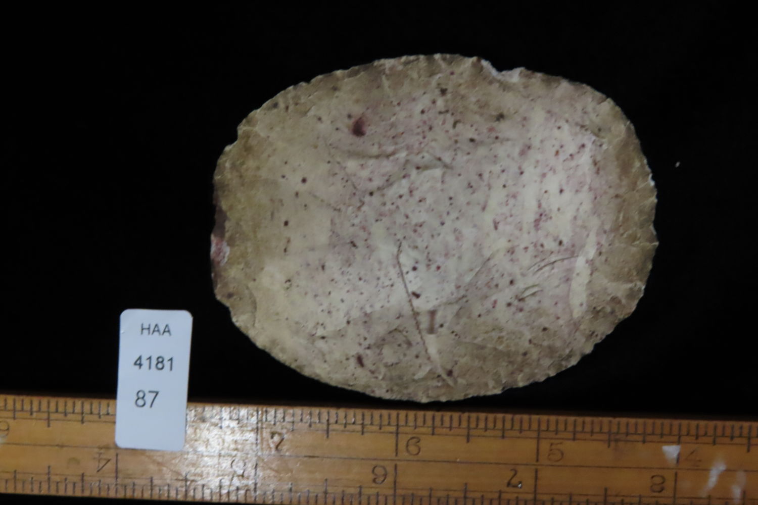 3 3/16″ Uni-face Scraper found by Ronald and Eileen Hubbard at the Kinderhook, IL hog lot.