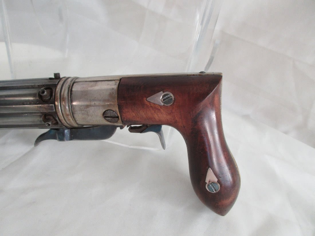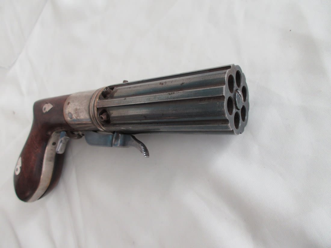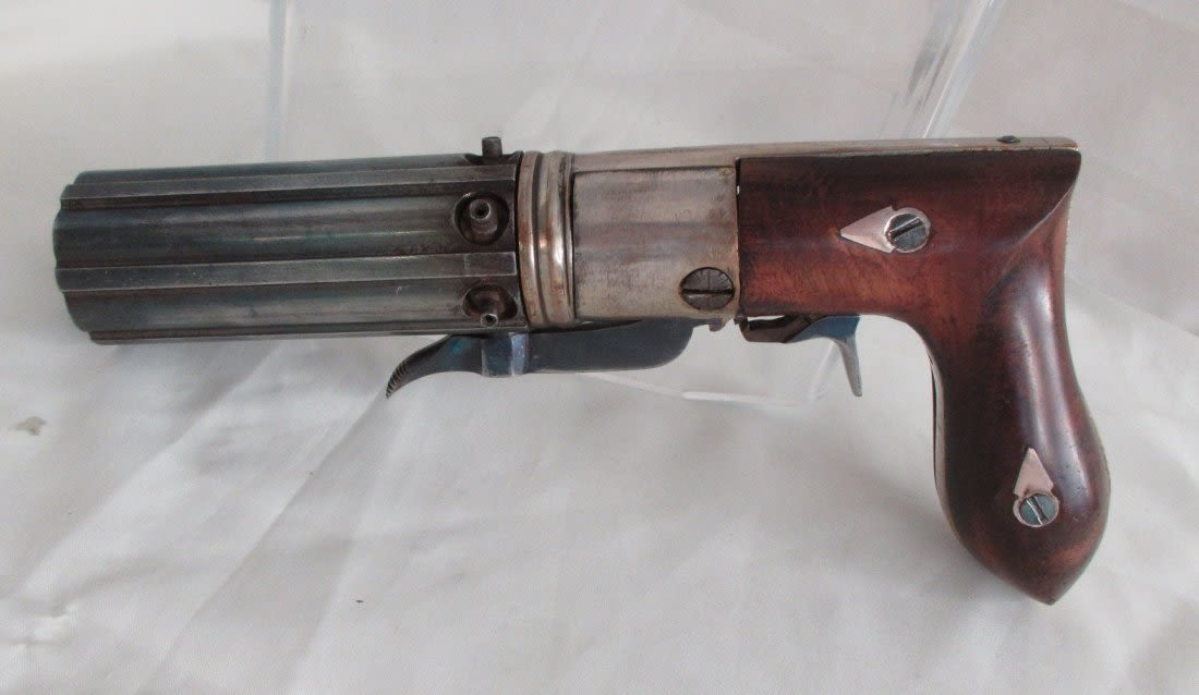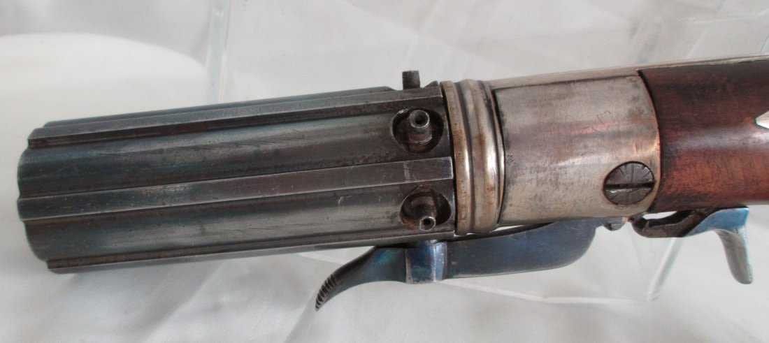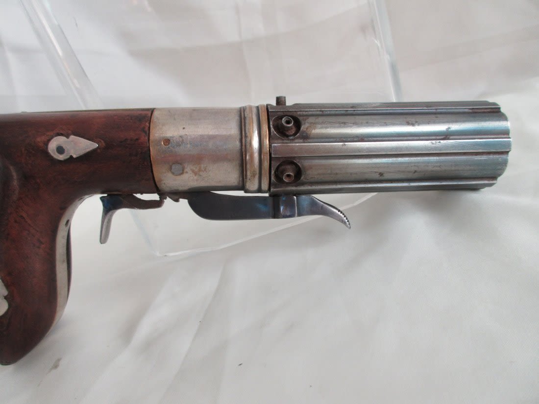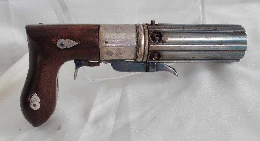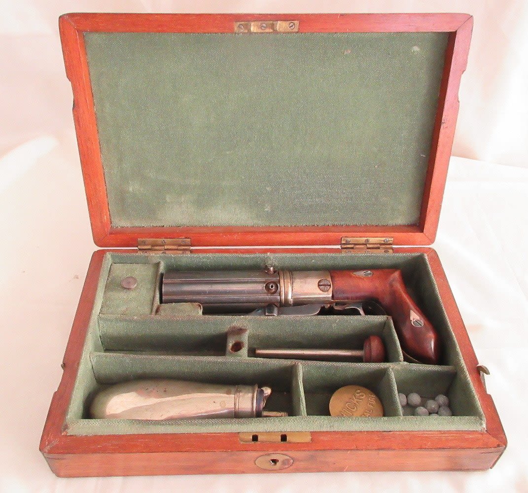 1840 to 1860 pepper box in wood case with accessories. Great condition.
