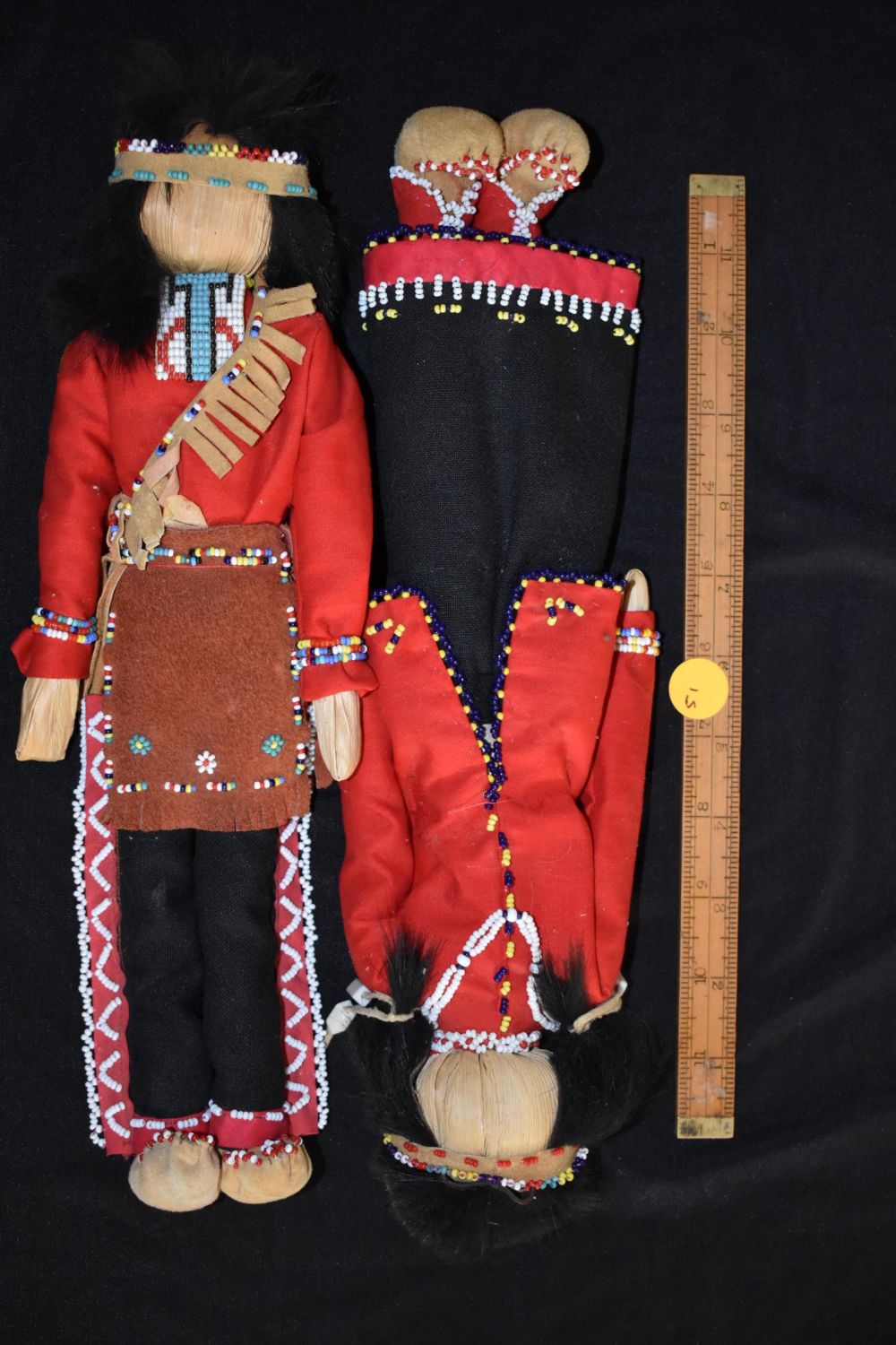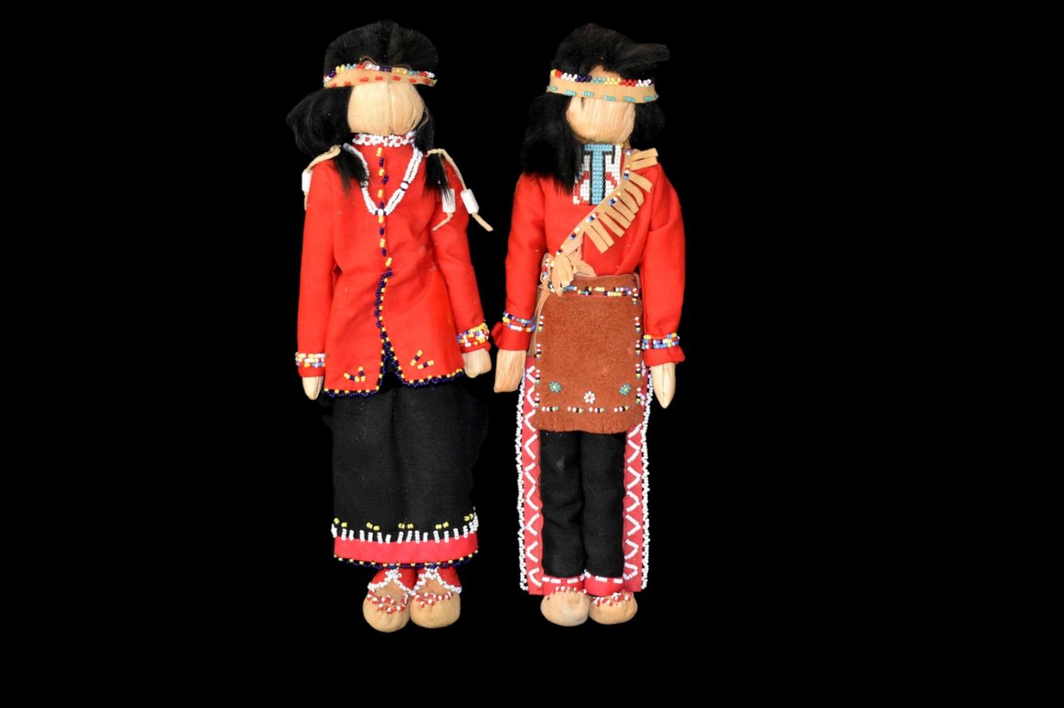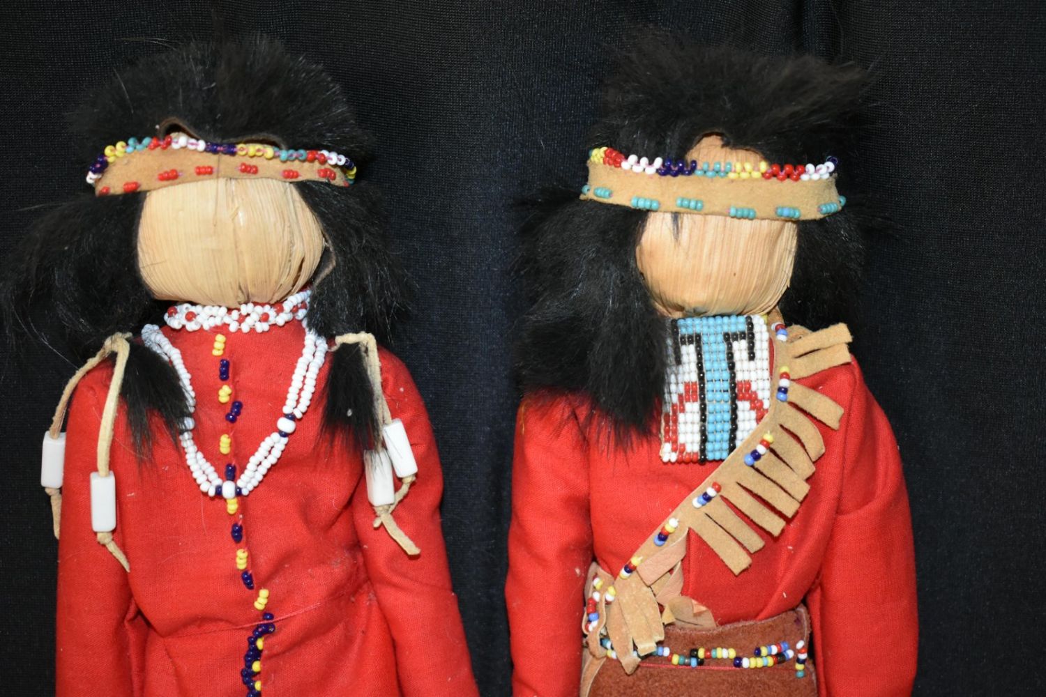 Iroquois man & woman corn husk face dolls 15” clothing cloth and leather, decorated with beads