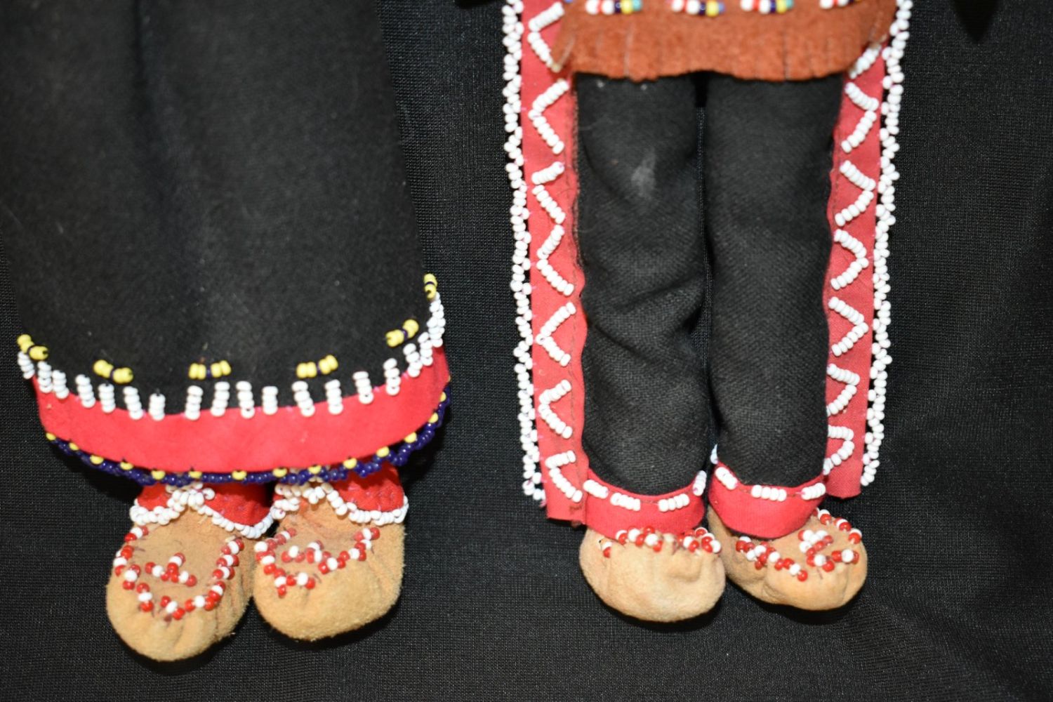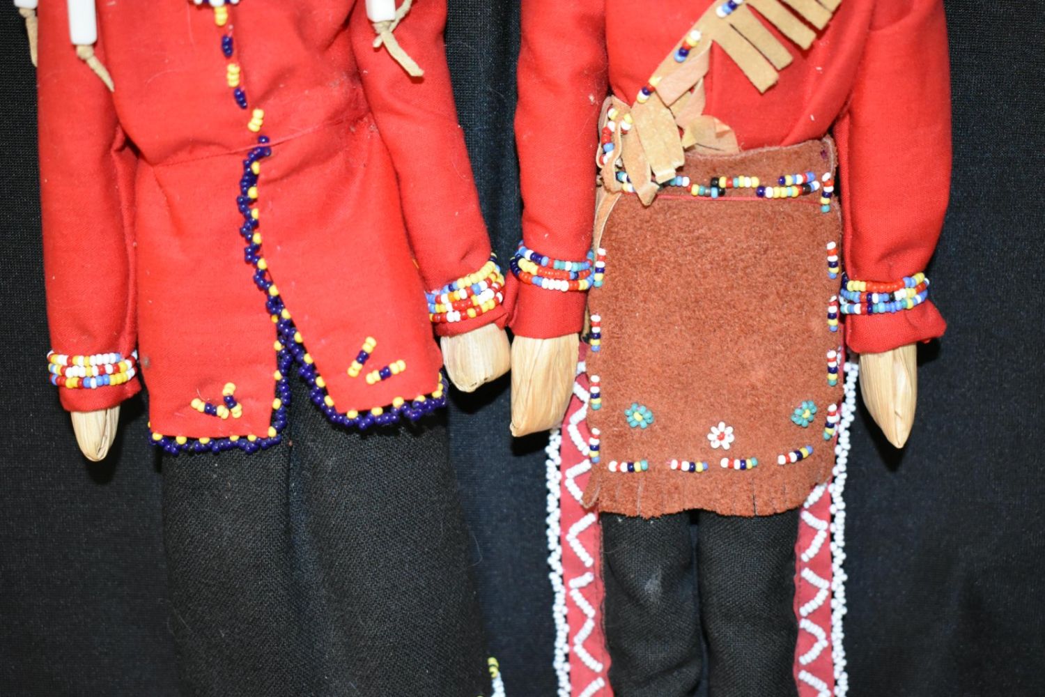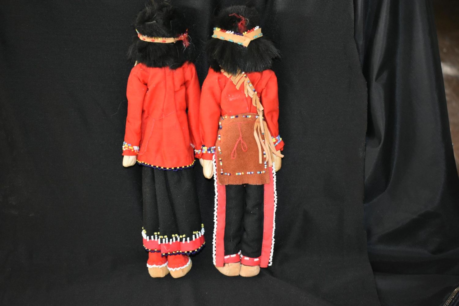 Iroquois man & woman corn husk face dolls 15” clothing cloth and leather, decorated with beads