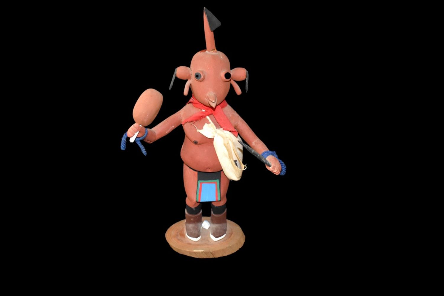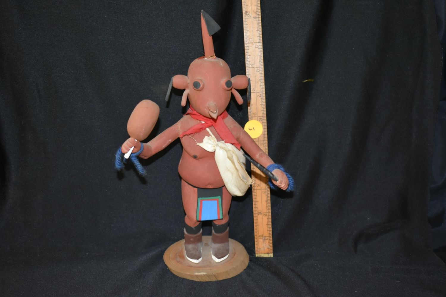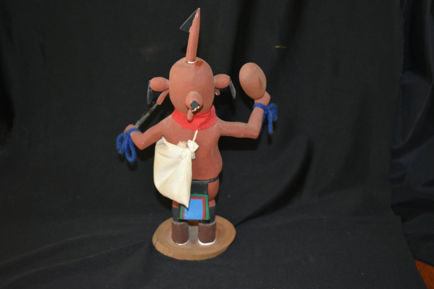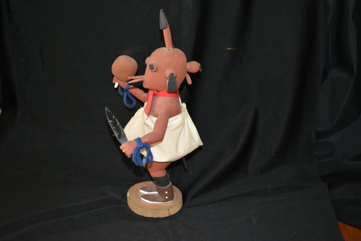 Hopi 10” Mudhead kachina with big belly holaind rattle. cloth clothing, carved feather & boots.