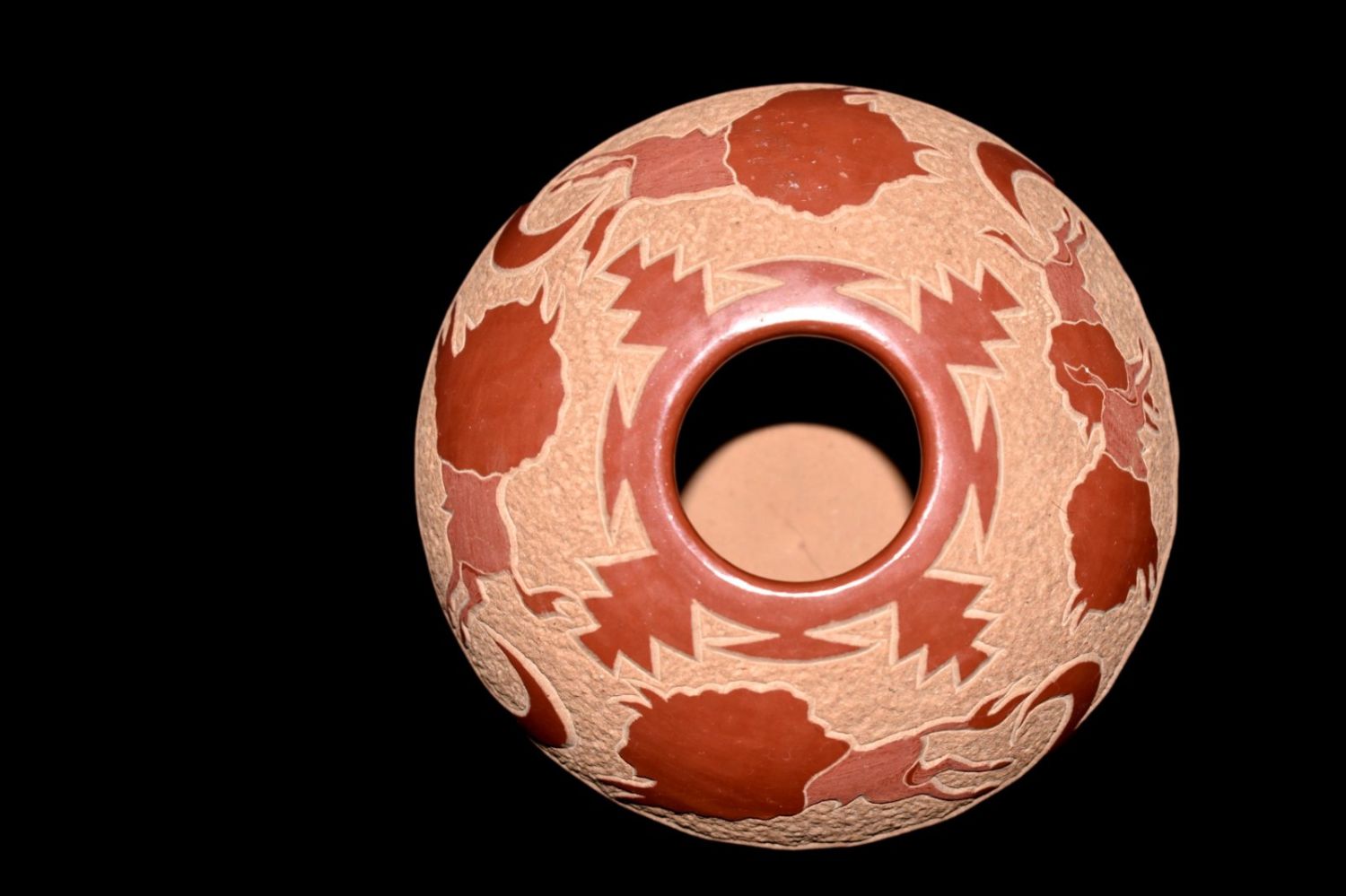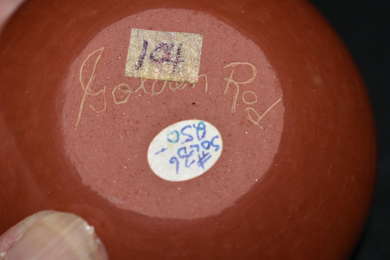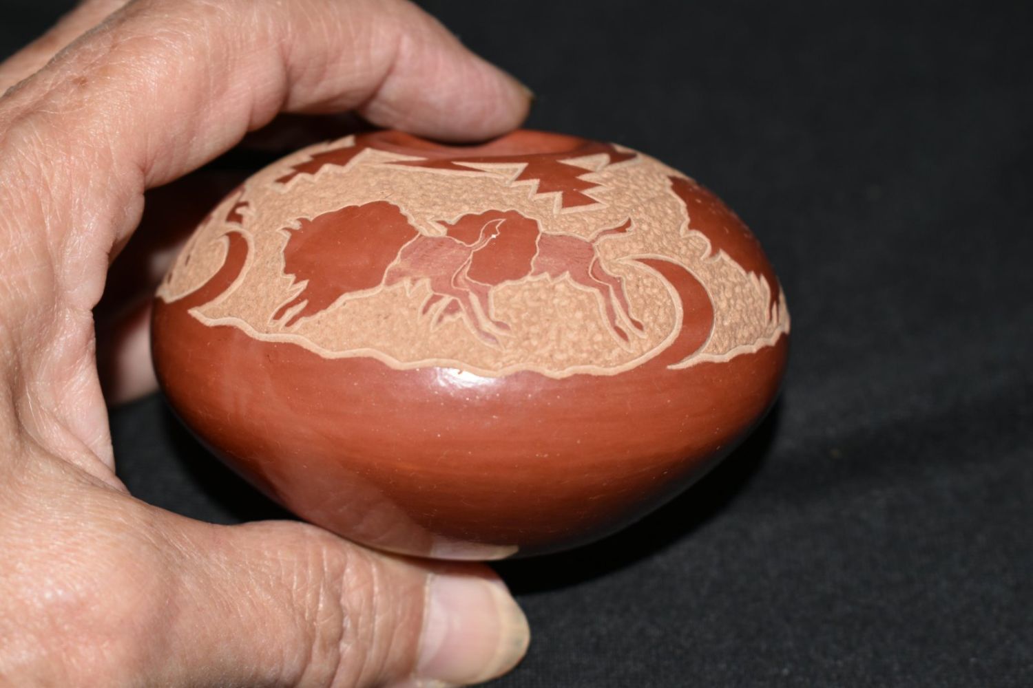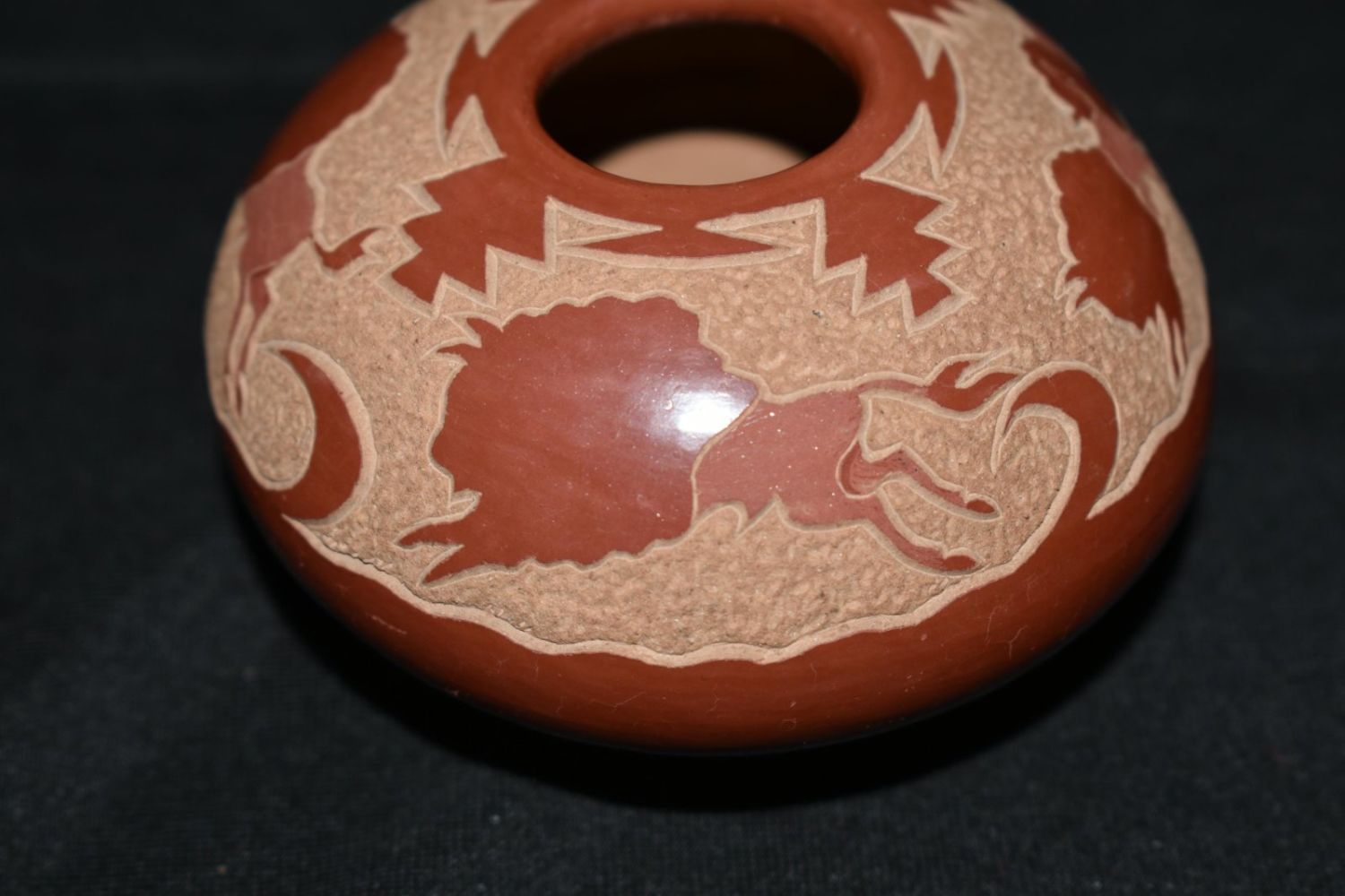Goldenrod (Gloria Garcia) Red engraved polychrome Buffalo pot 2 x 3”
