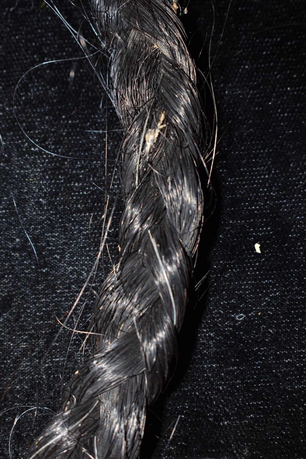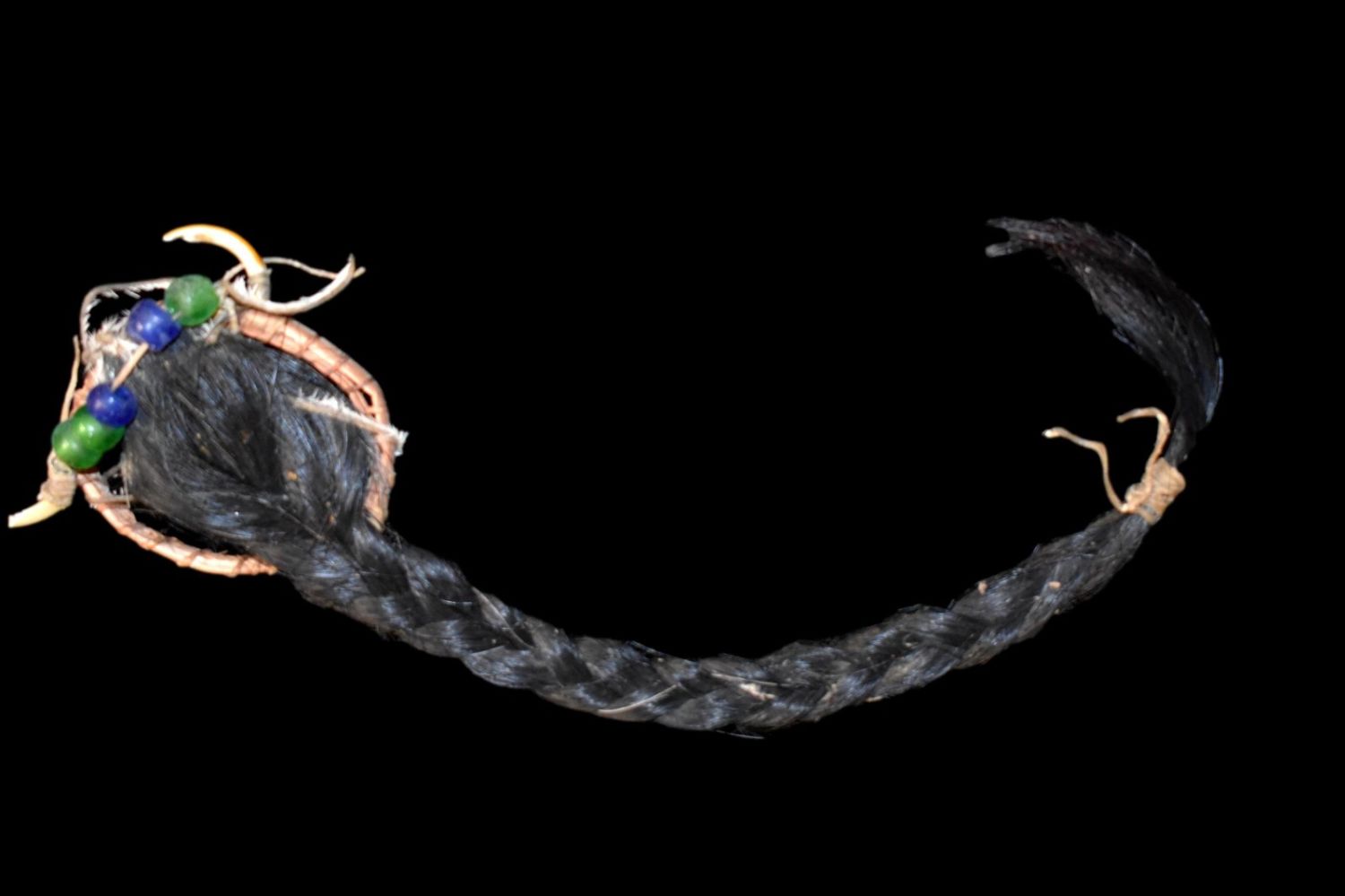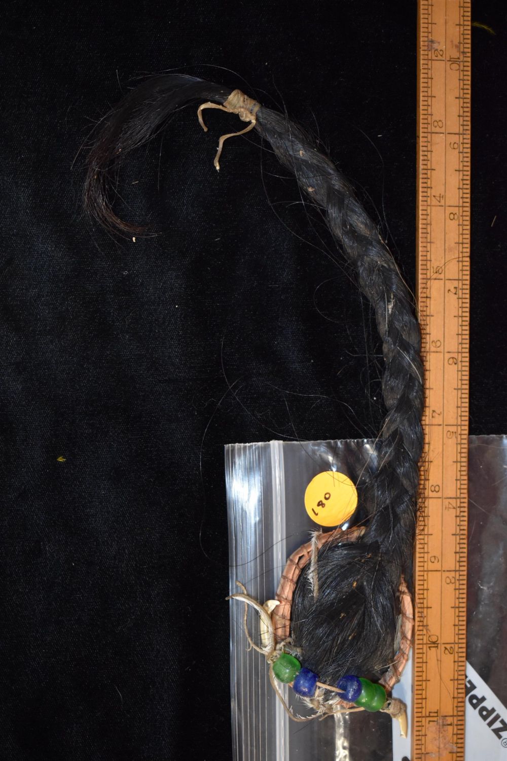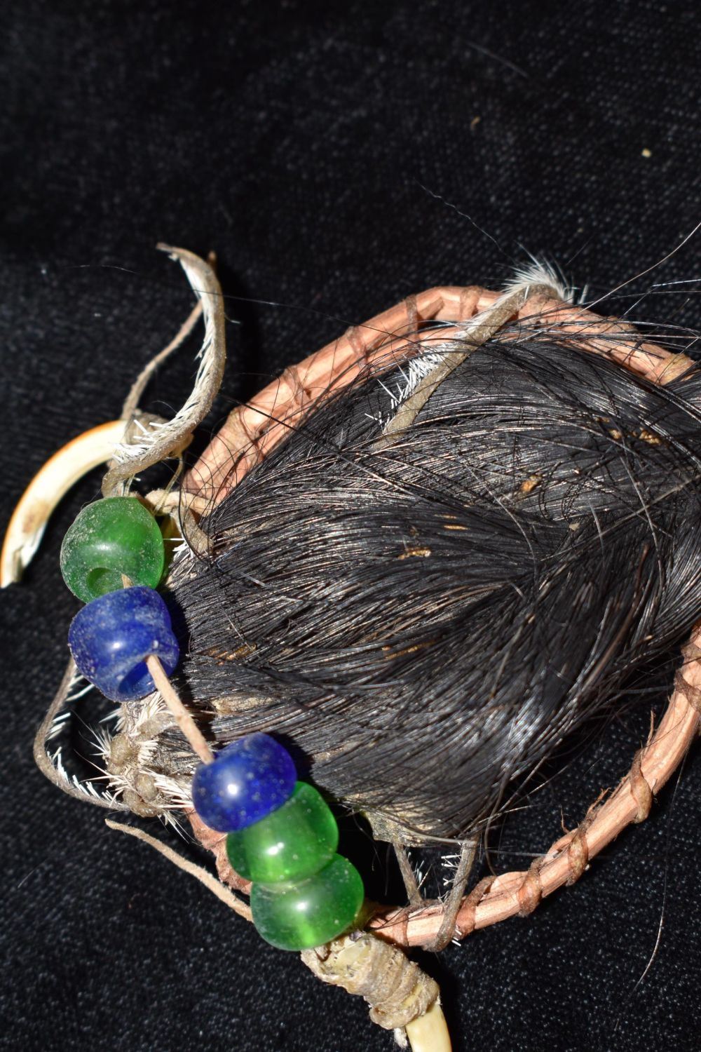 12" Horse Hair Lock with Feathers and Trade Beads and Crab Shell