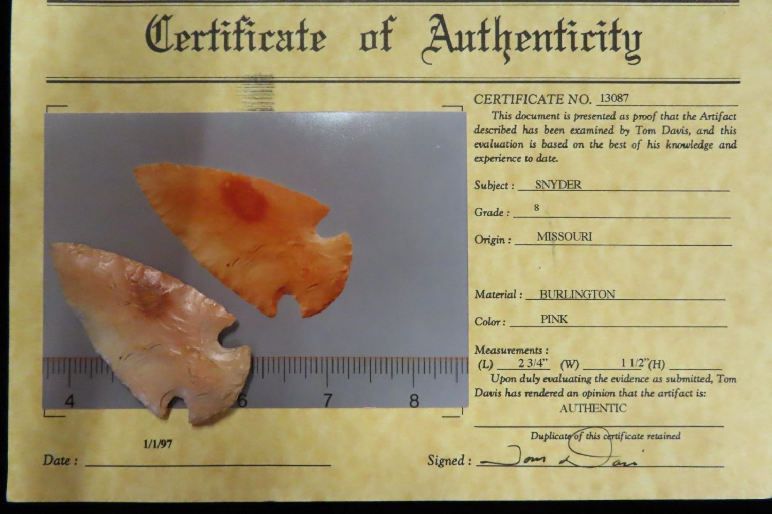 2 3/4" Snyder Hopewell Davis COA made of Heat treated burlington chert. Missouri Origin