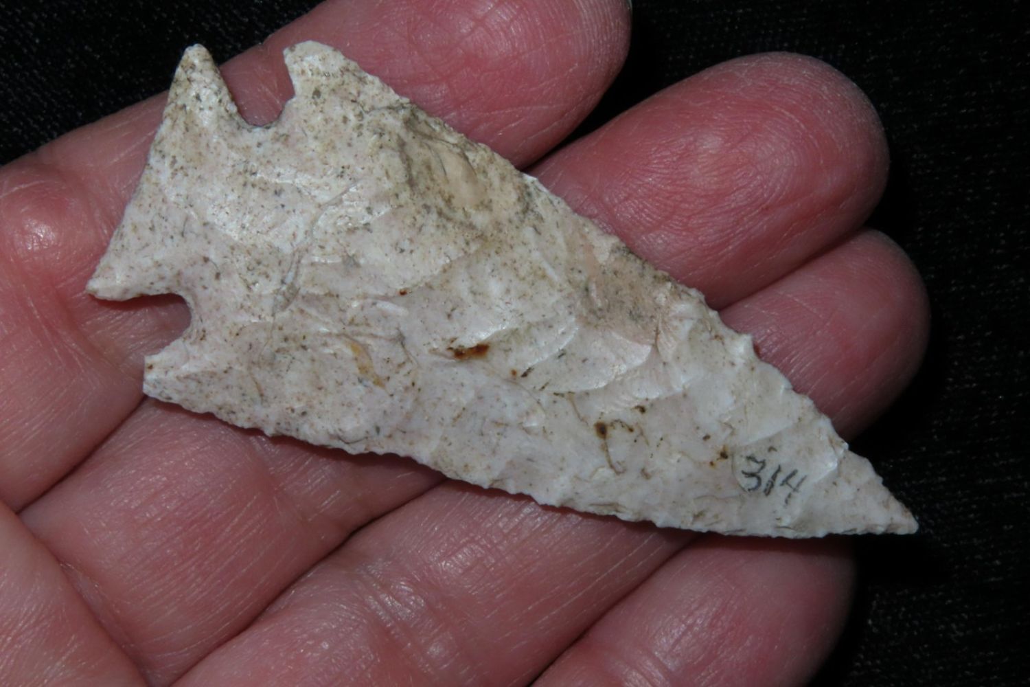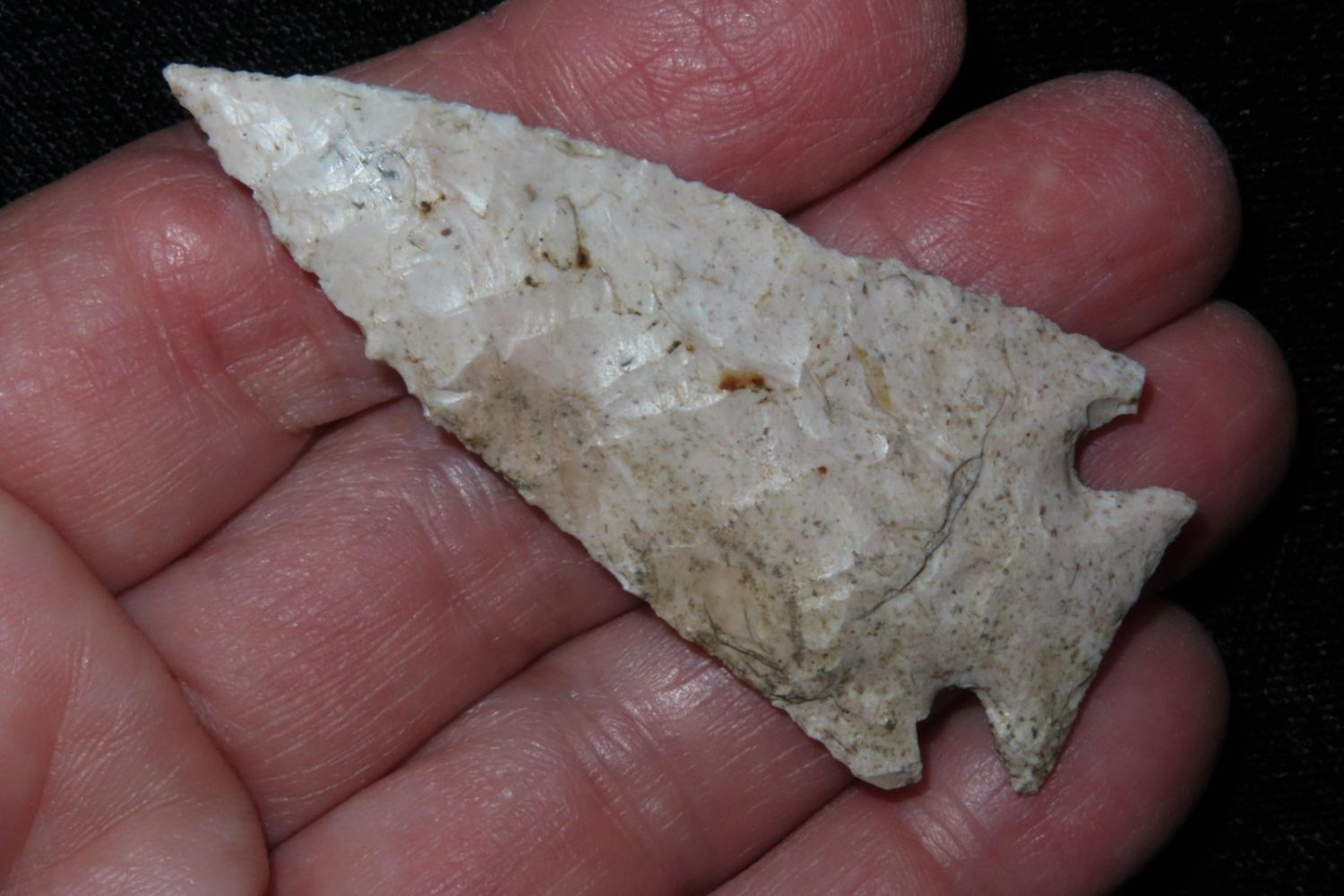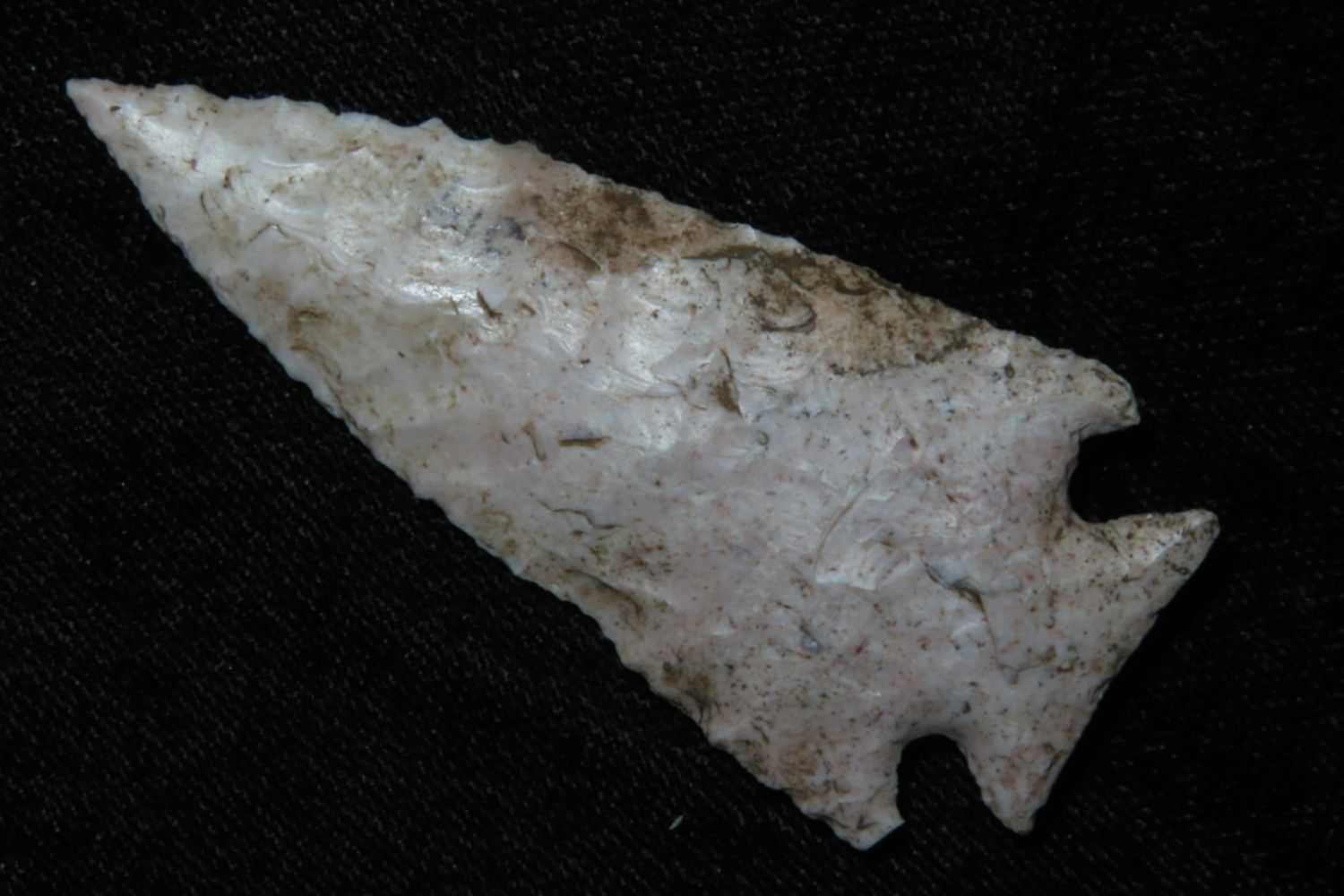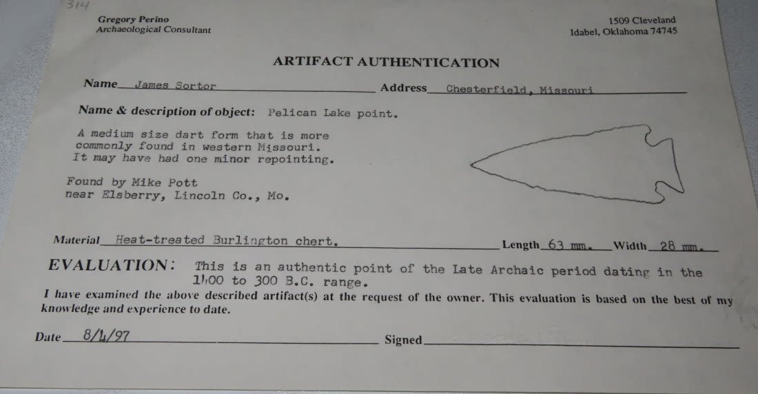 2 3/8" Pelican Lake . Very well made. From the James and Joe George Collection. Joe George was an avid collector and finder of Native American artifacts in the greater St Louis Missouri area. Joe collected his entire life. Upon his passing he turned his collection over to his son James. James was also a very avid collector. He enjoyed walking various waterways and attending artifact shows. James is looking forward to passing down his collection to the relic community for caretaking.
