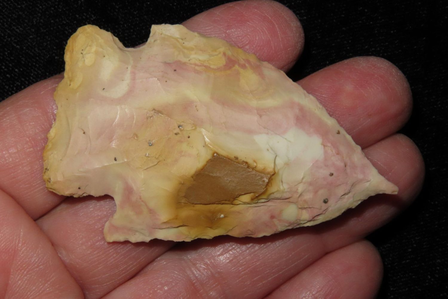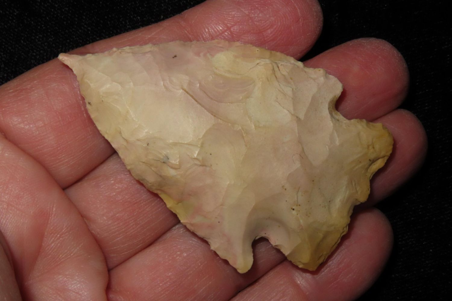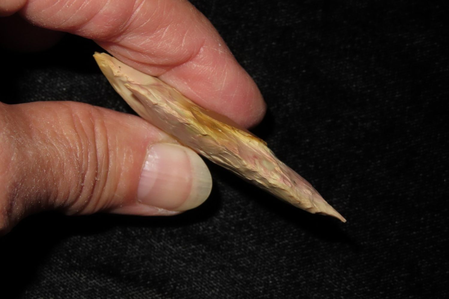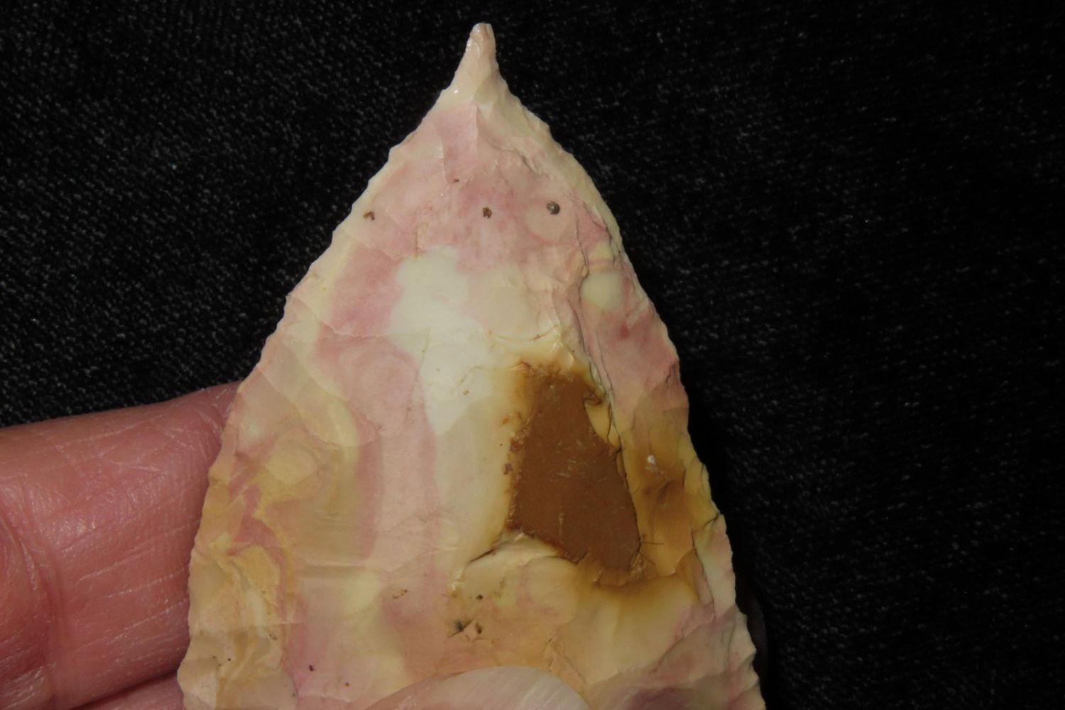2 3/8" Needle Tipped Afton with good color. From the James and Joe George Collection. Joe George was an avid collector and finder of Native American artifacts in the greater St Louis Missouri area. Joe collected his entire life. Upon his passing he turned his collection over to his son James. James was also a very avid collector. He enjoyed walking various waterways and attending artifact shows. James is looking forward to passing down his collection to the relic community for caretaking.