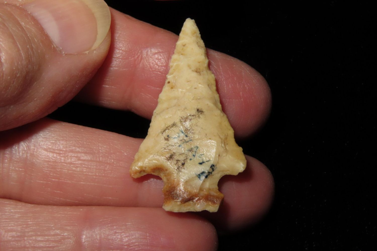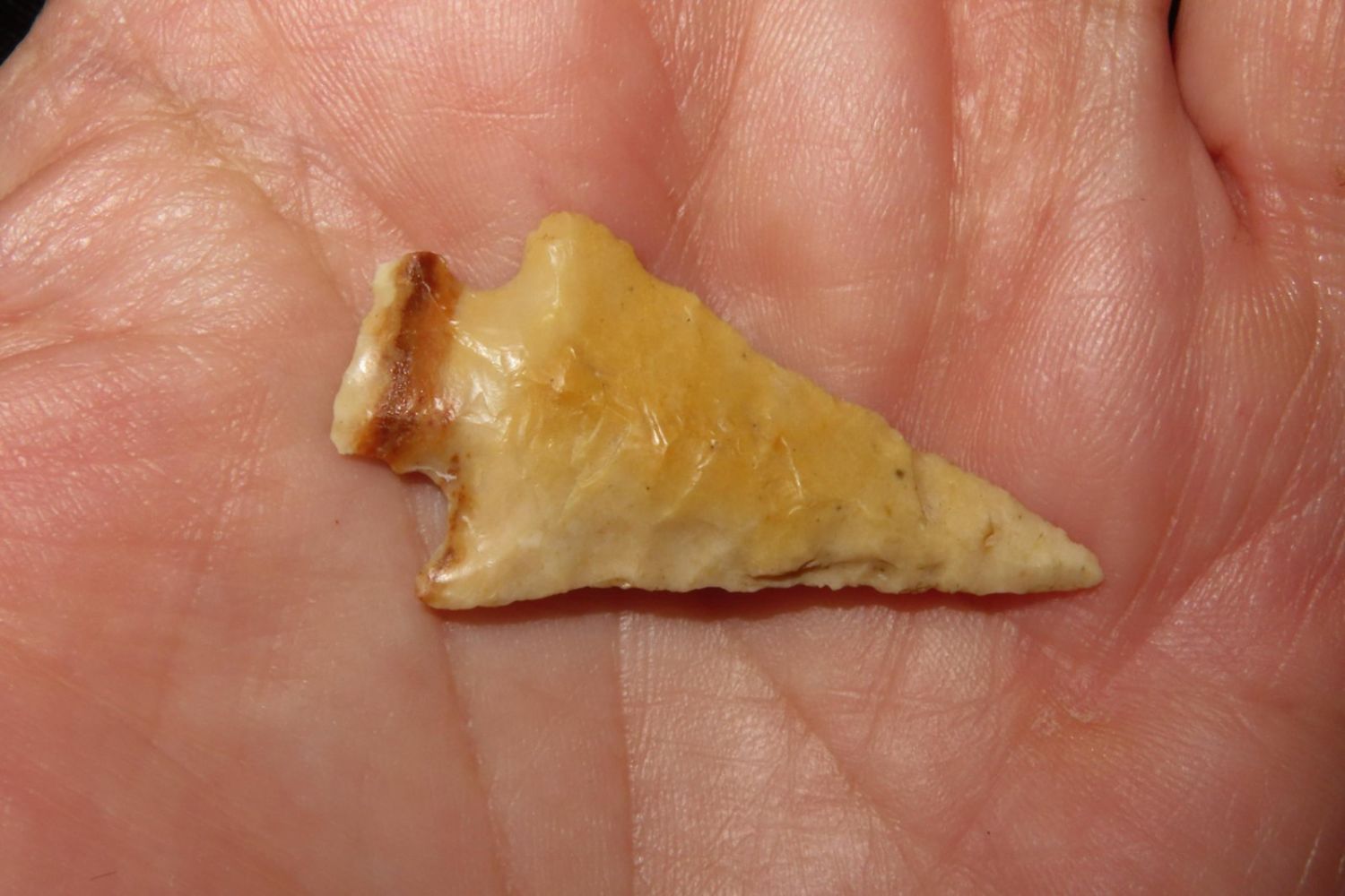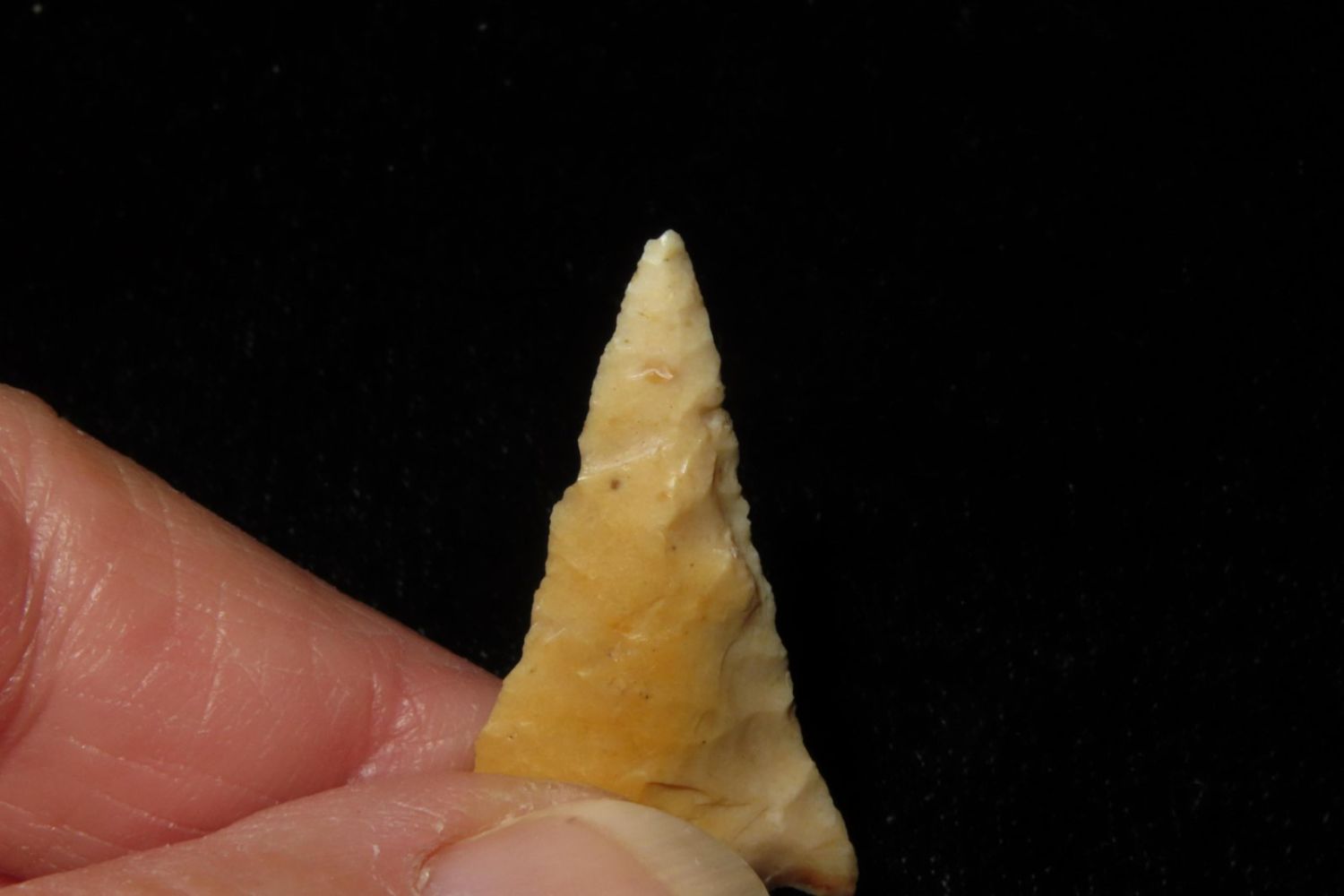 1 3/8" Bird Point. From the James and Joe George Collection. Joe George was an avid collector and finder of Native American artifacts in the greater St Louis Missouri area. Joe collected his entire life. Upon his passing he turned his collection over to his son James. James was also a very avid collector. He enjoyed walking various waterways and attending artifact shows. James is looking forward to passing down his collection to the relic community for caretaking.