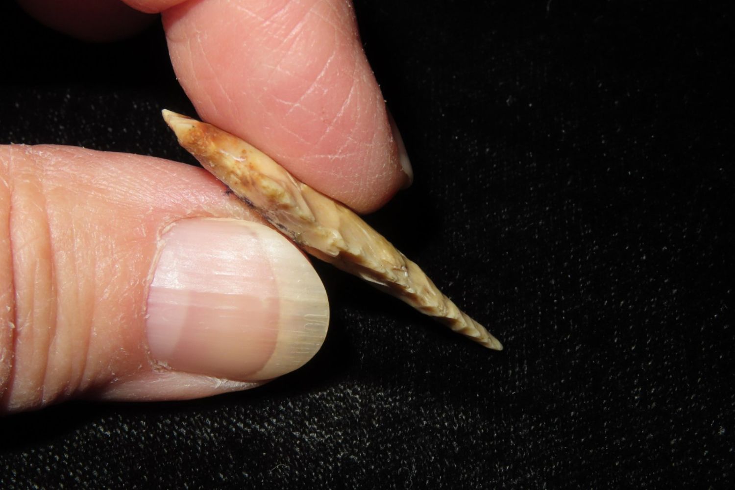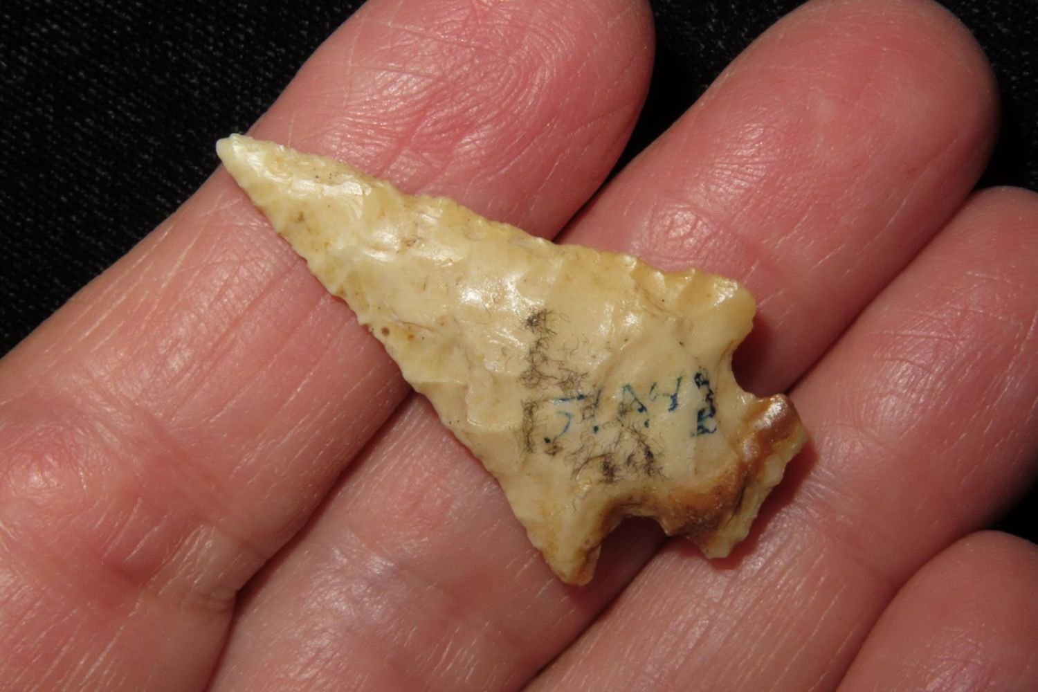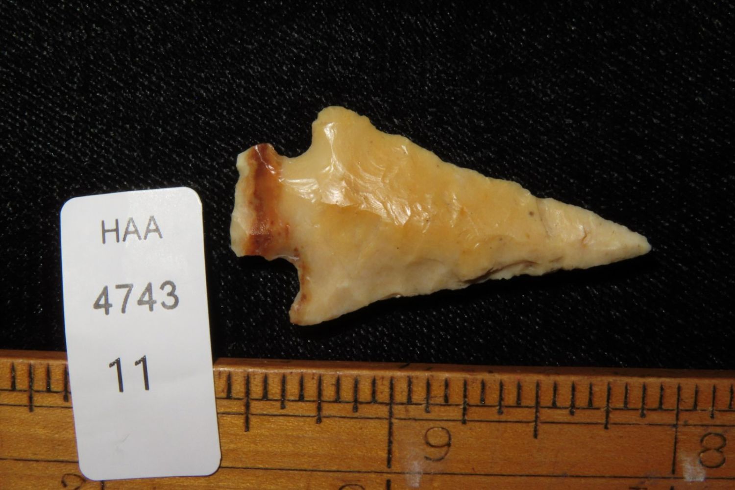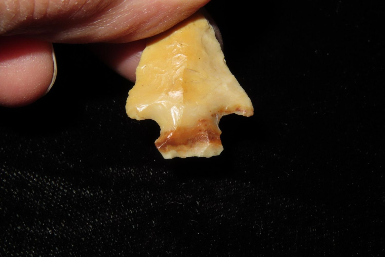 1 3/8" Bird Point. From the James and Joe George Collection. Joe George was an avid collector and finder of Native American artifacts in the greater St Louis Missouri area. Joe collected his entire life. Upon his passing he turned his collection over to his son James. James was also a very avid collector. He enjoyed walking various waterways and attending artifact shows. James is looking forward to passing down his collection to the relic community for caretaking.
