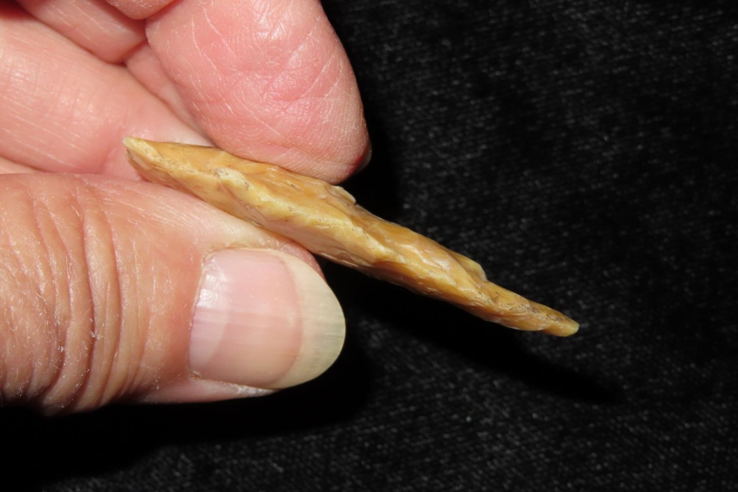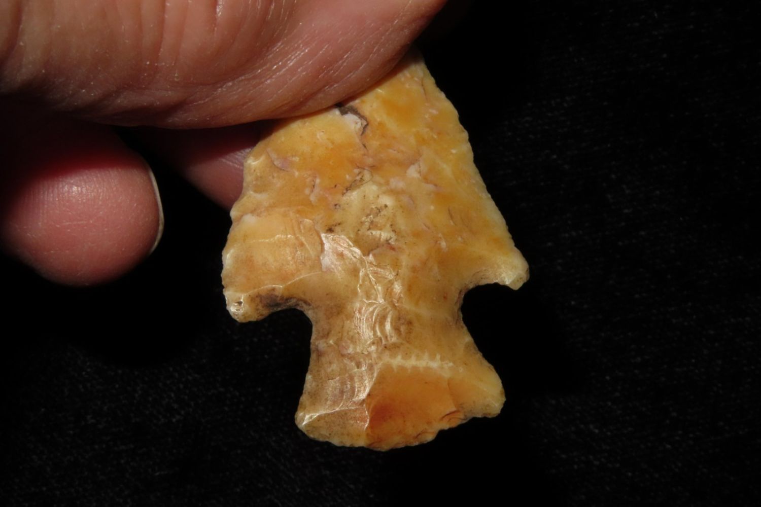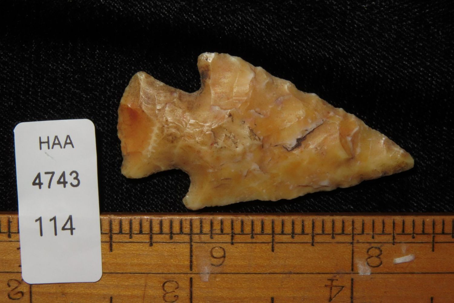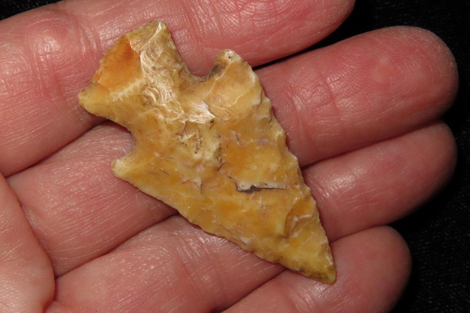 1 3/4" Apple Creek with nice river polish. From the James and Joe George Collection. Joe George was an avid collector and finder of Native American artifacts in the greater St Louis Missouri area. Joe collected his entire life. Upon his passing he turned his collection over to his son James. James was also a very avid collector. He enjoyed walking various waterways and attending artifact shows. James is looking forward to passing down his collection to the relic community for caretaking.