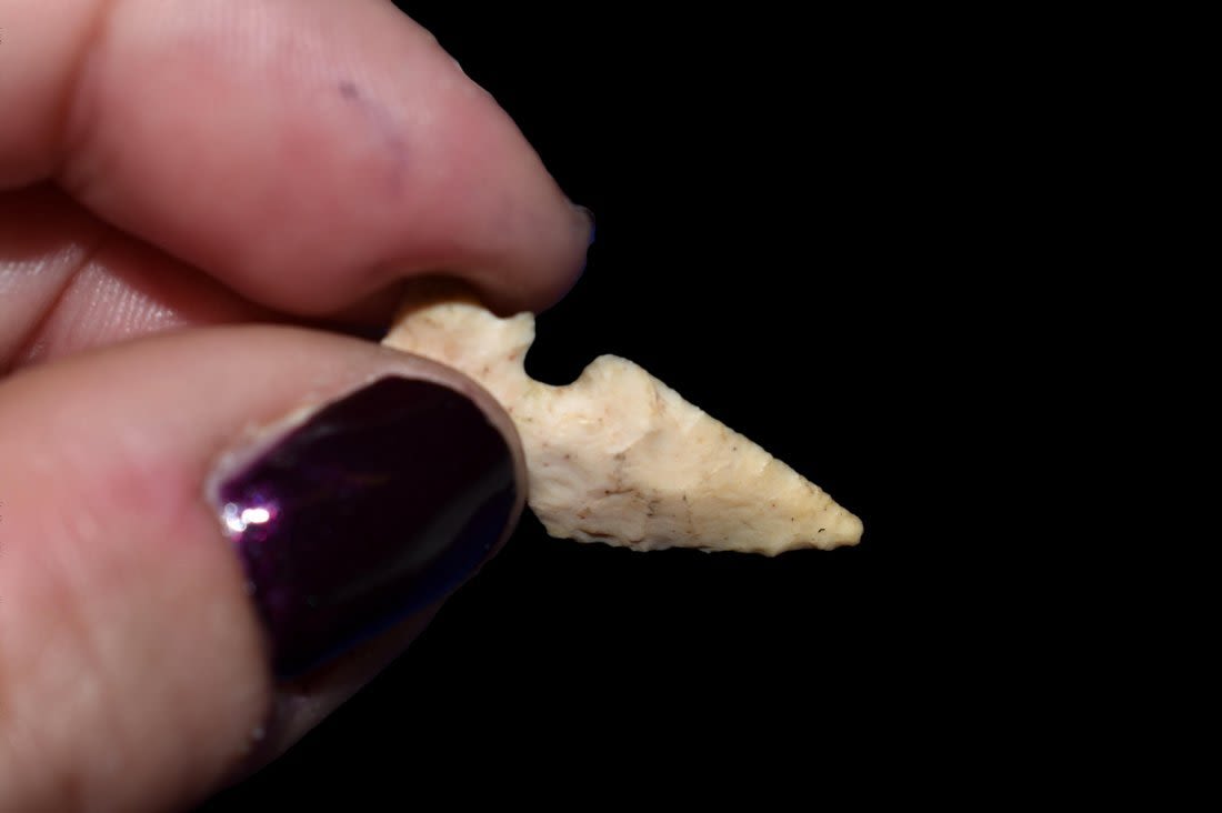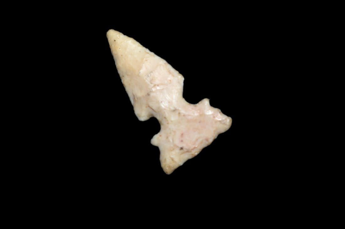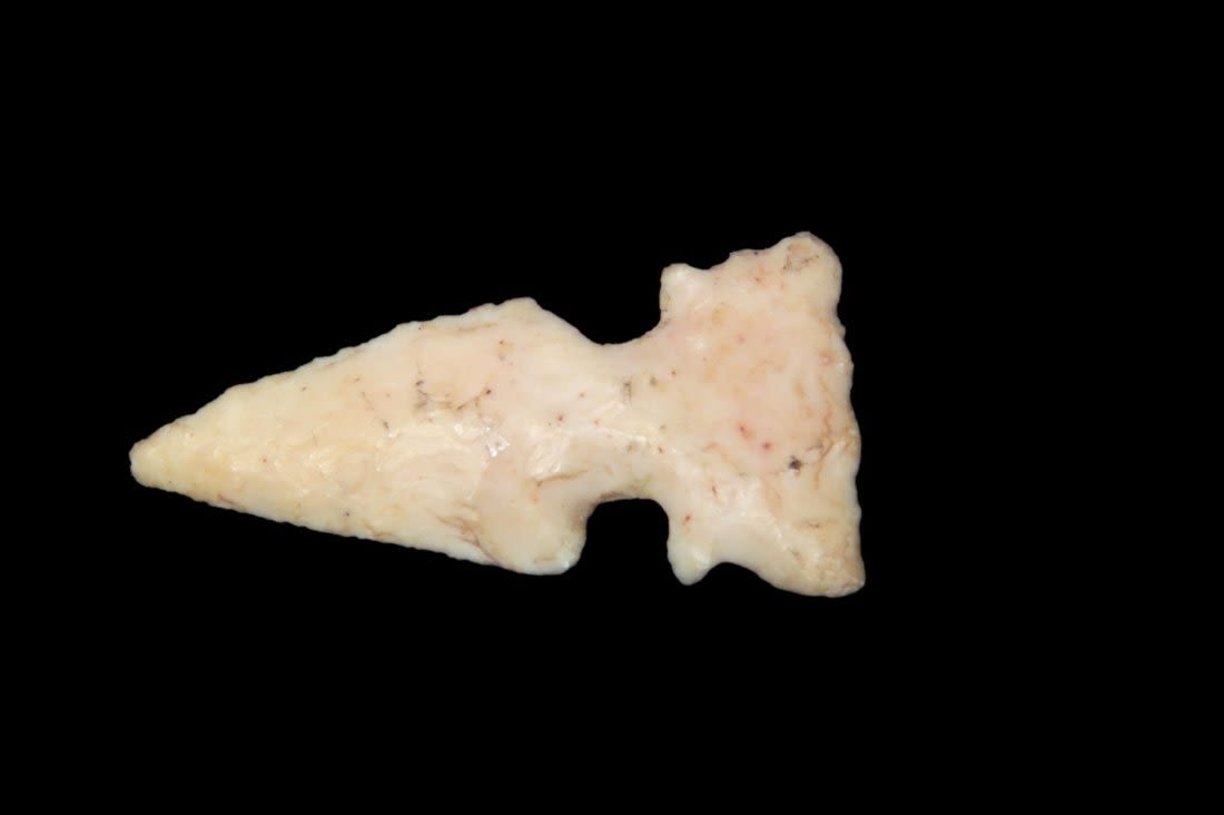 15/16" Cahokia Birdpoint From the James and Joe George Collection. Joe George was an avid collector and finder of Native American artifacts in the greater St Louis Missouri area. Joe collected his entire life. Upon his passing he turned his collection over to his son James. James was also a very avid collector. He enjoyed walking various waterways and attending artifact shows. James is looking forward to passing down his collection to the relic community for caretaking.