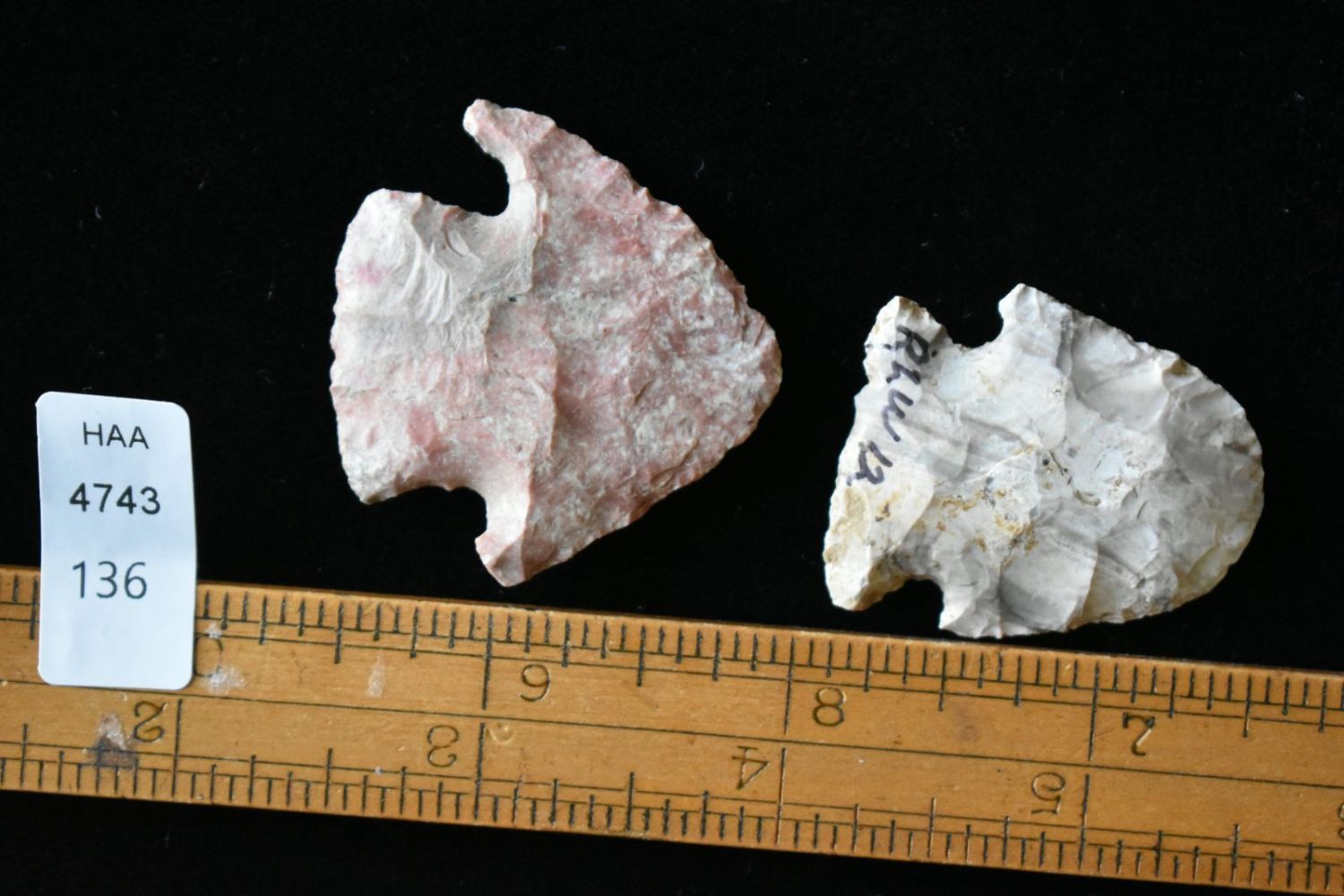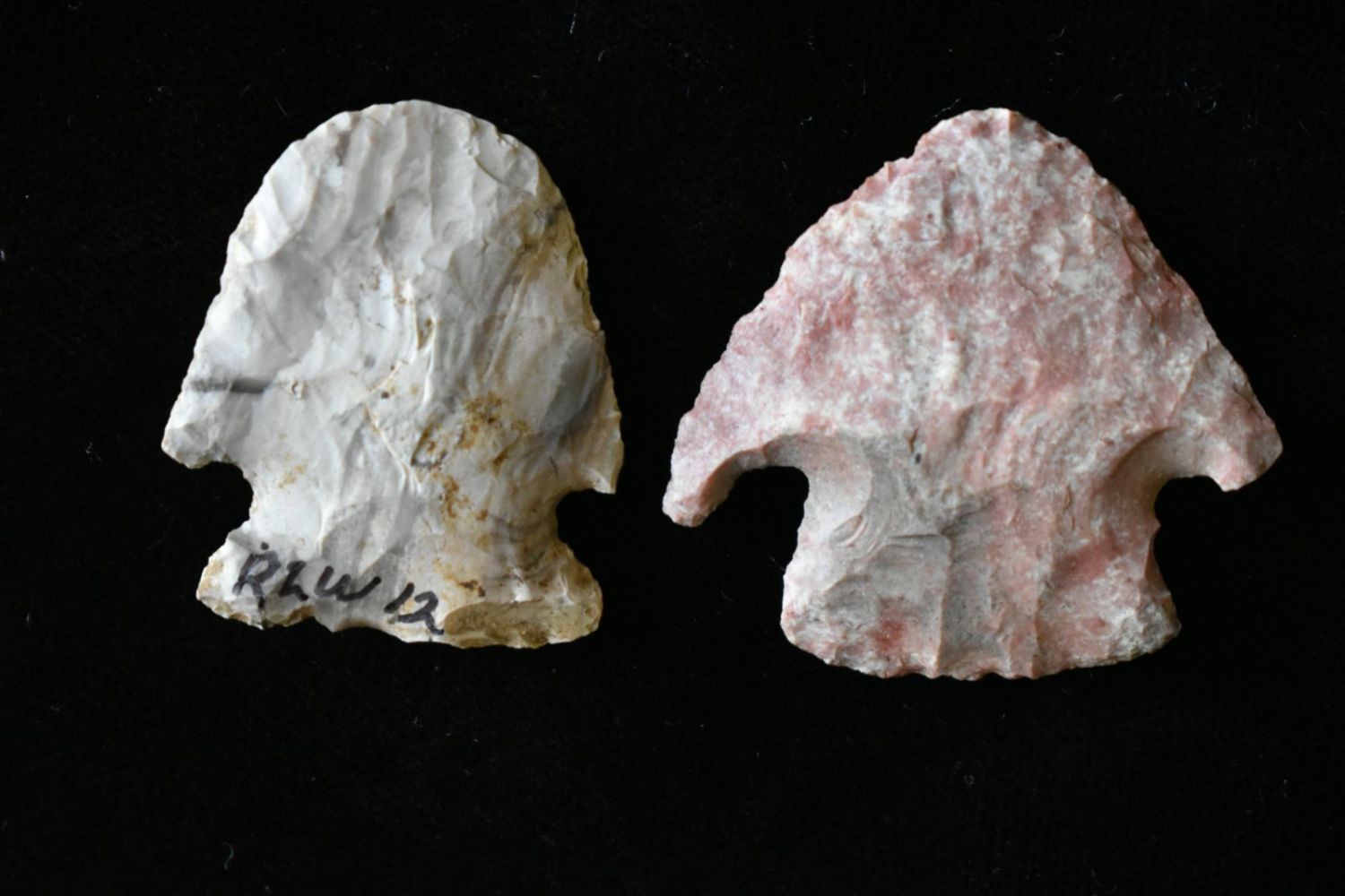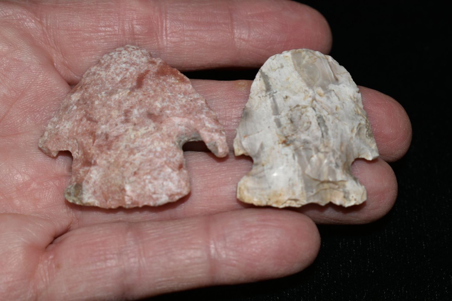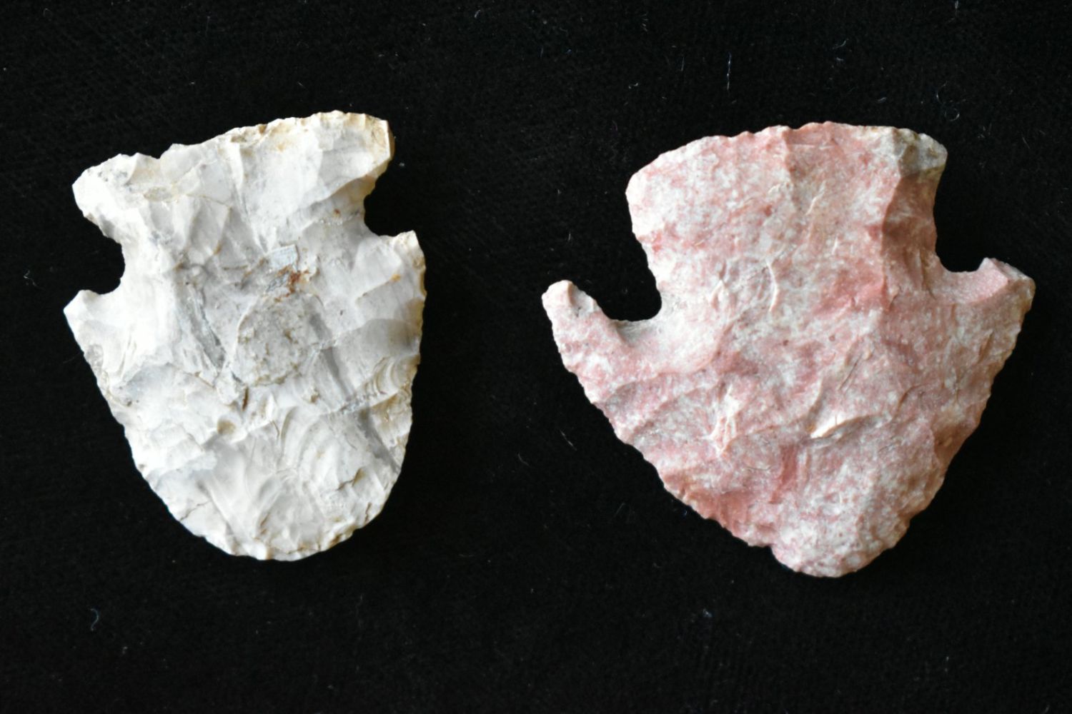 Lot of two points, one found by Richard Whittle. Longest is 1 1/2". From the James and Joe George Collection. Joe George was an avid collector and finder of Native American artifacts in the greater St Louis Missouri area. Joe collected his entire life. Upon his passing he turned his collection over to his son James. James was also a very avid collector. He enjoyed walking various waterways and attending artifact shows. James is looking forward to passing down his collection to the relic community for caretaking.