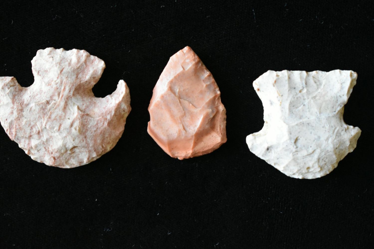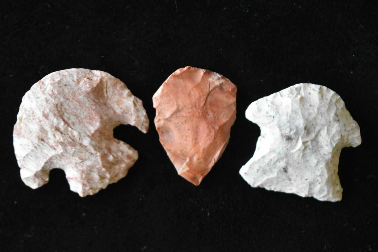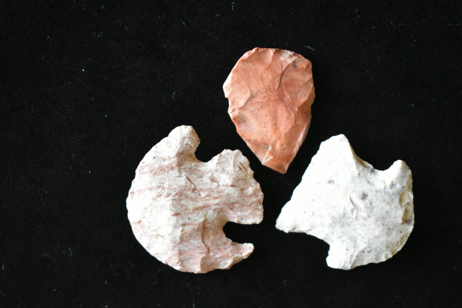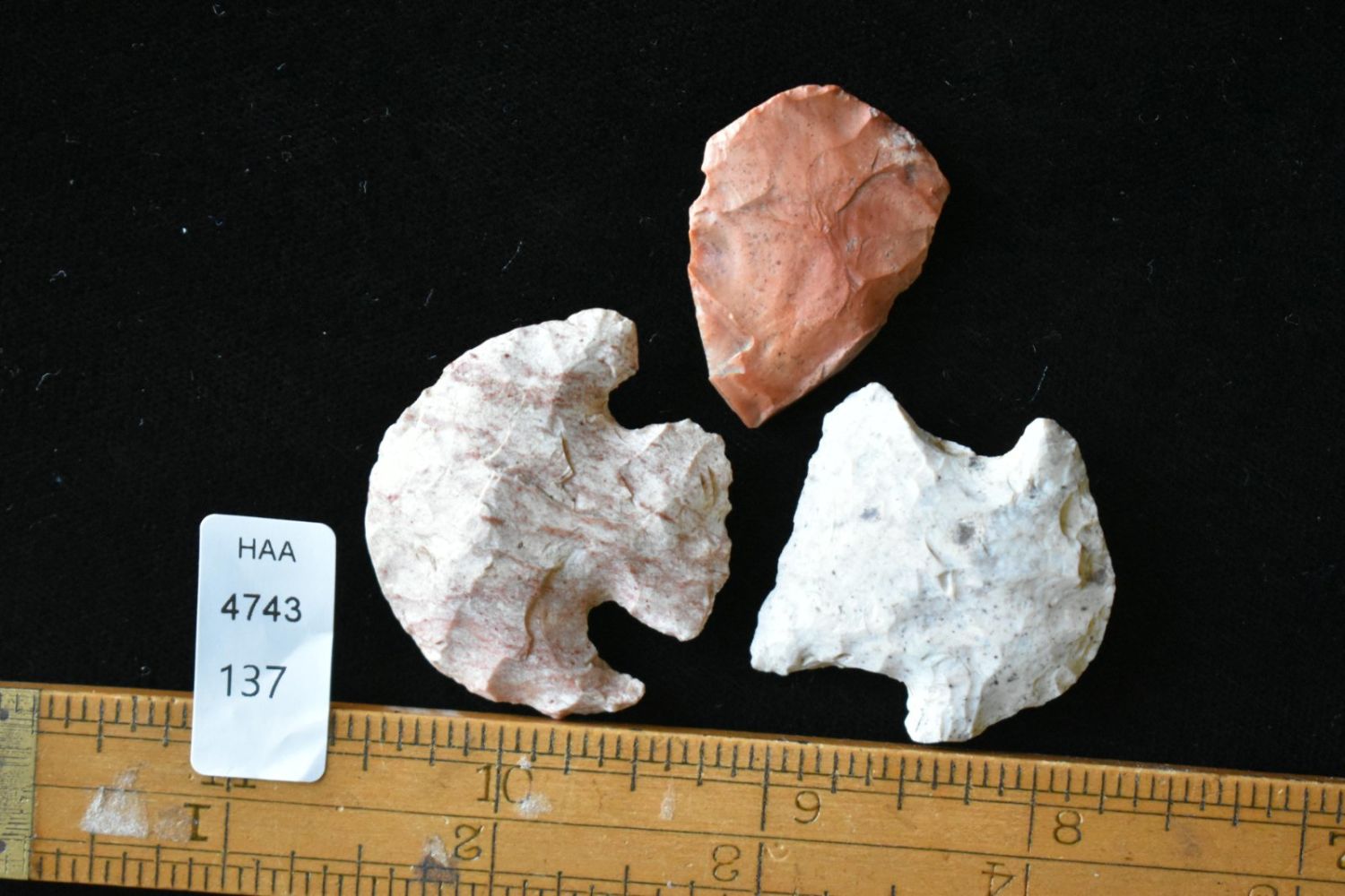 Grouping of three arrowheads. From the James and Joe George Collection. Joe George was an avid collector and finder of Native American artifacts in the greater St Louis Missouri area. Joe collected his entire life. Upon his passing he turned his collection over to his son James. James was also a very avid collector. He enjoyed walking various waterways and attending artifact shows. James is looking forward to passing down his collection to the relic community for caretaking.