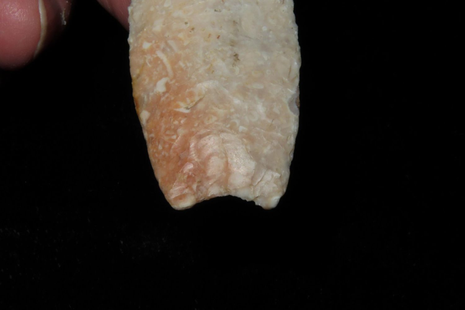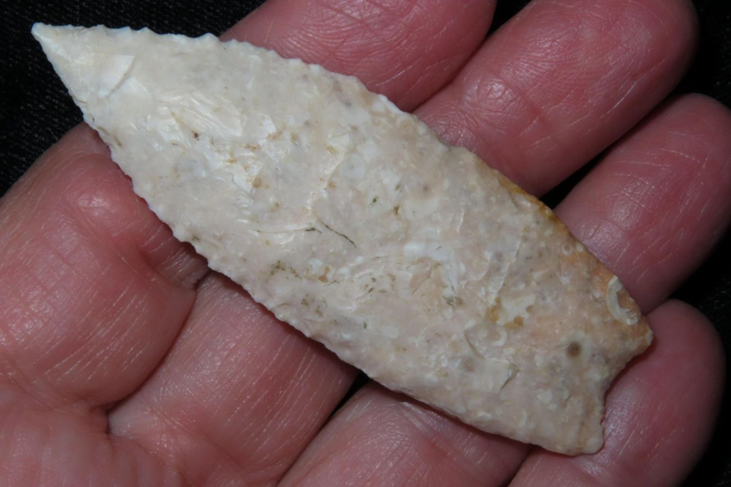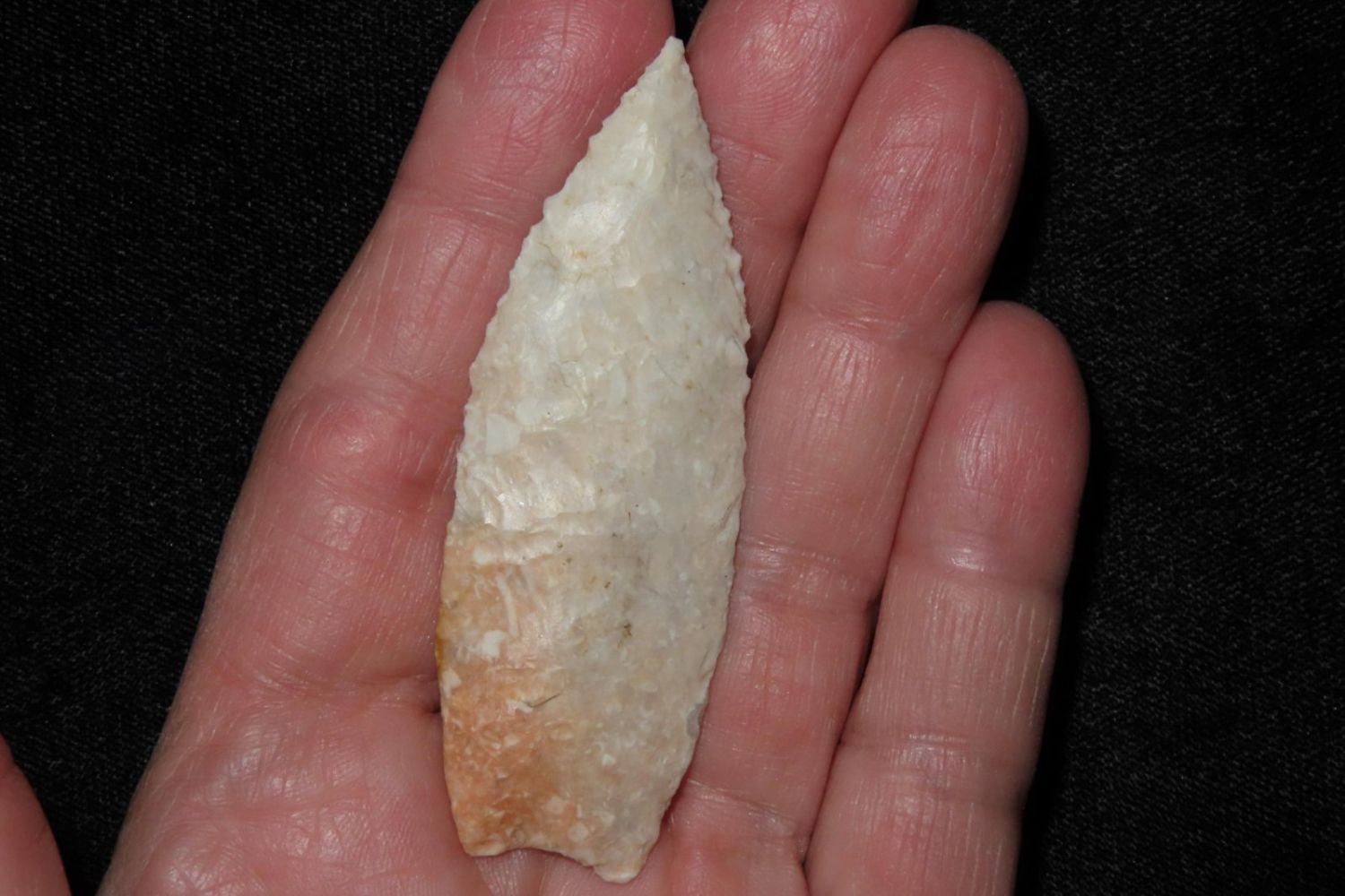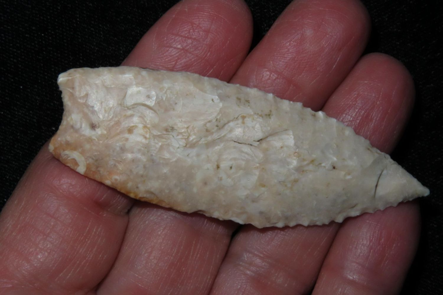 2 5/8" Angostura with heavily ground base to the midway point and lightly serrated. Made from fossilized Burlington. From the James and Joe George Collection. Joe George was an avid collector and finder of Native American artifacts in the greater St Louis Missouri area. Joe collected his entire life. Upon his passing he turned his collection over to his son James. James was also a very avid collector. He enjoyed walking various waterways and attending artifact shows. James is looking forward to passing down his collection to the relic community for caretaking.