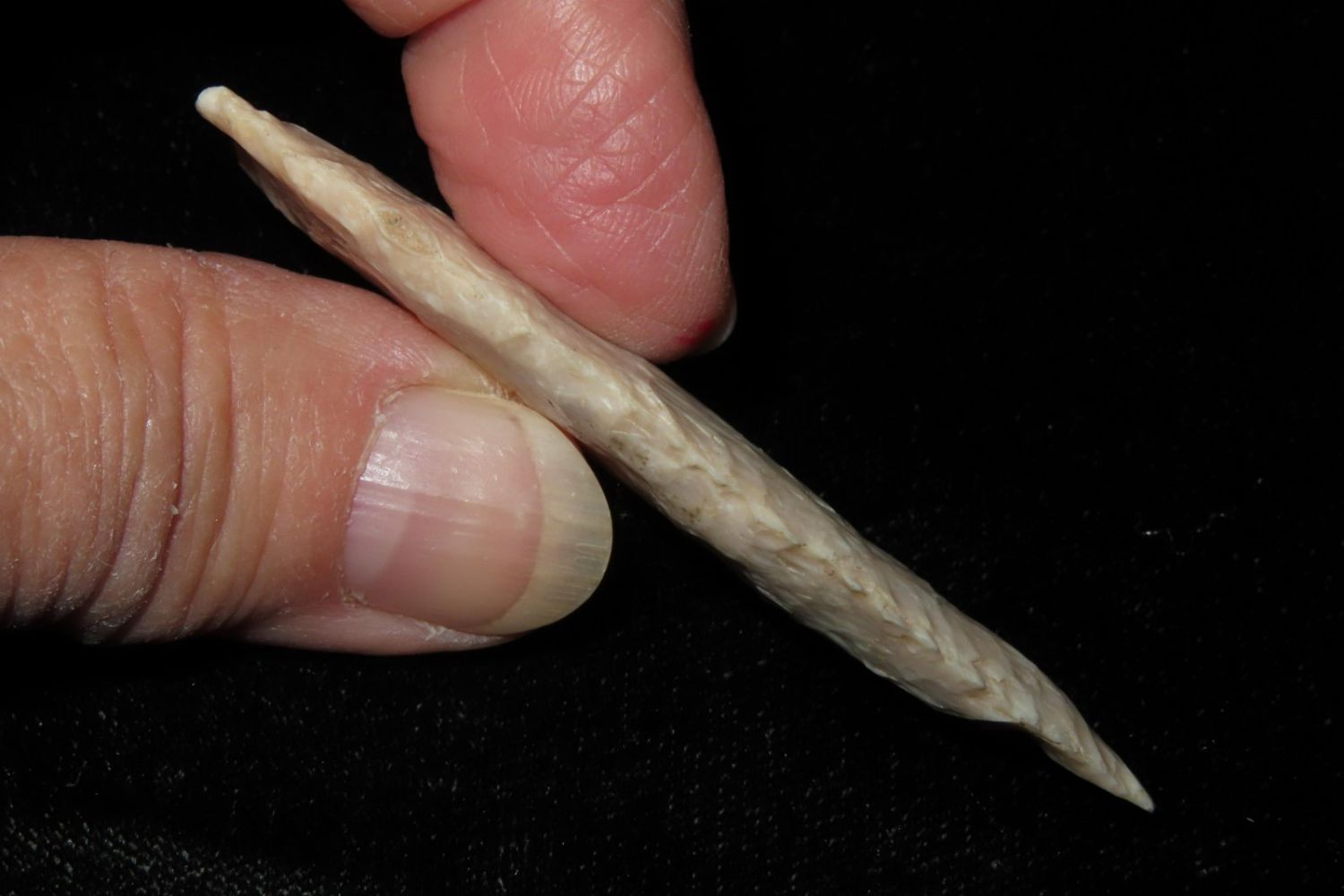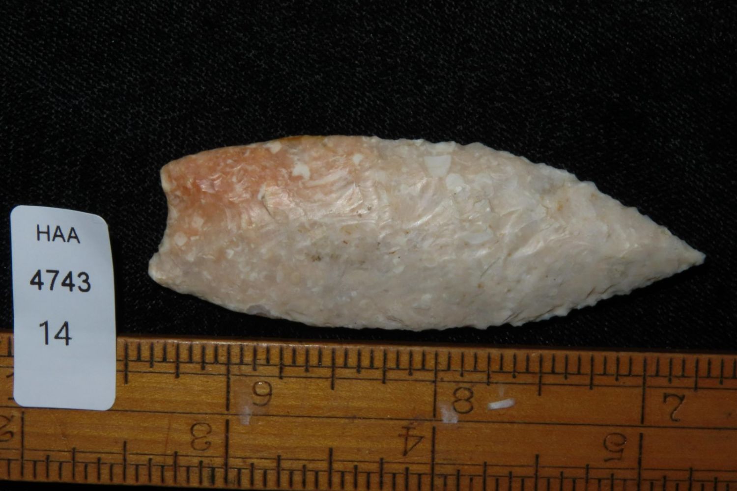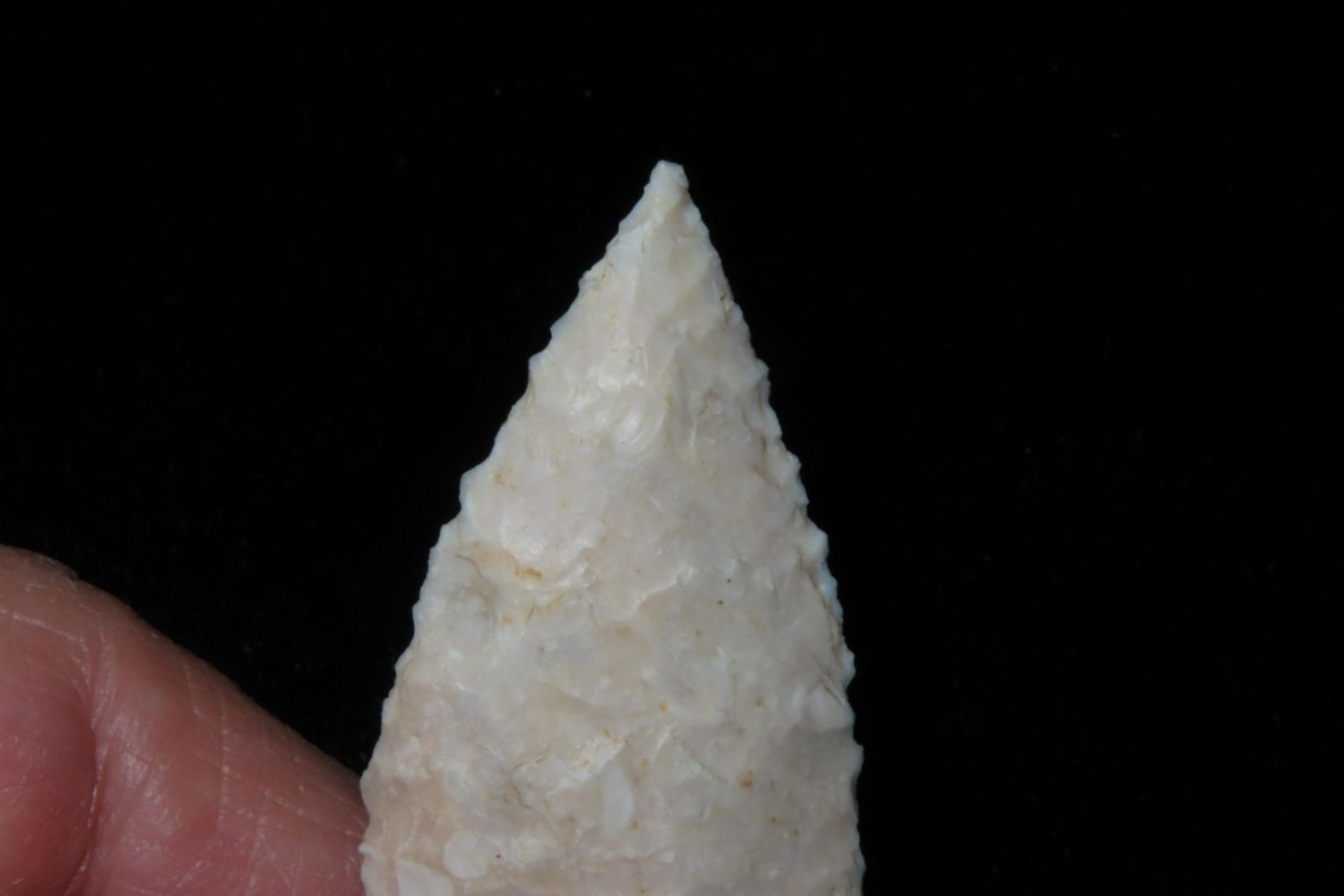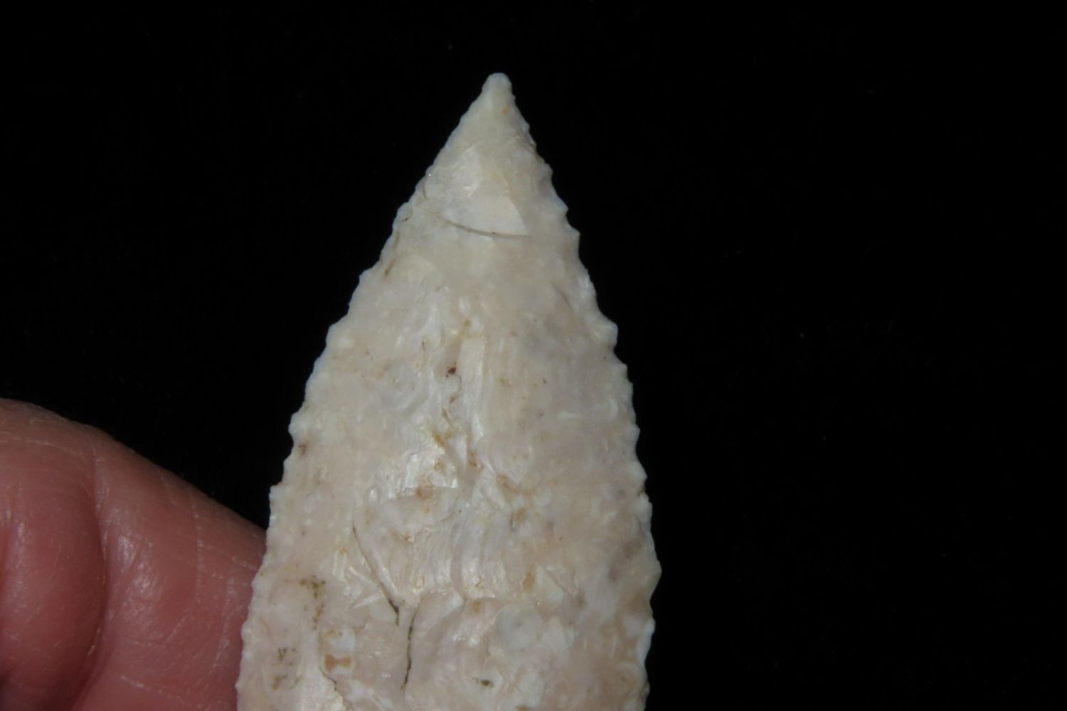 2 5/8" Angostura with heavily ground base to the midway point and lightly serrated. Made from fossilized Burlington. From the James and Joe George Collection. Joe George was an avid collector and finder of Native American artifacts in the greater St Louis Missouri area. Joe collected his entire life. Upon his passing he turned his collection over to his son James. James was also a very avid collector. He enjoyed walking various waterways and attending artifact shows. James is looking forward to passing down his collection to the relic community for caretaking.