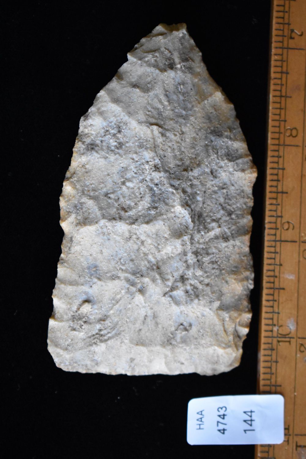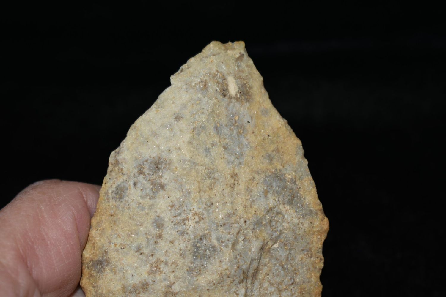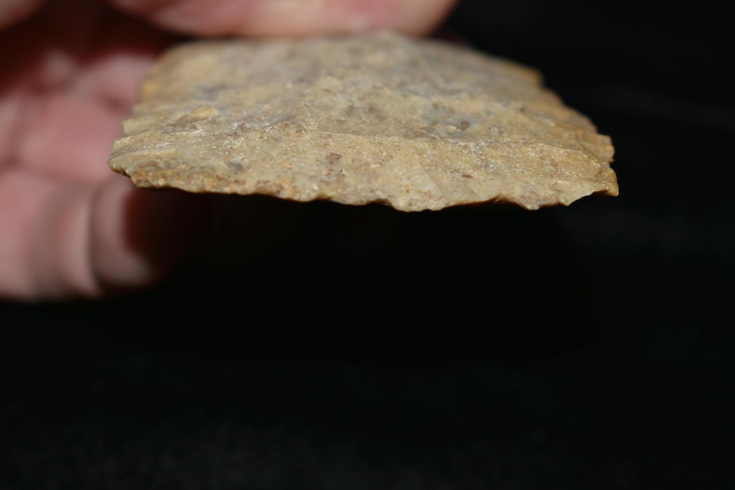 3 5/8" Square Base Archaic Knife. From the James and Joe George Collection. Joe George was an avid collector and finder of Native American artifacts in the greater St Louis Missouri area. Joe collected his entire life. Upon his passing he turned his collection over to his son James. James was also a very avid collector. He enjoyed walking various waterways and attending artifact shows. James is looking forward to passing down his collection to the relic community for caretaking.