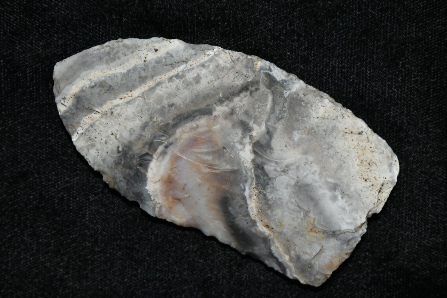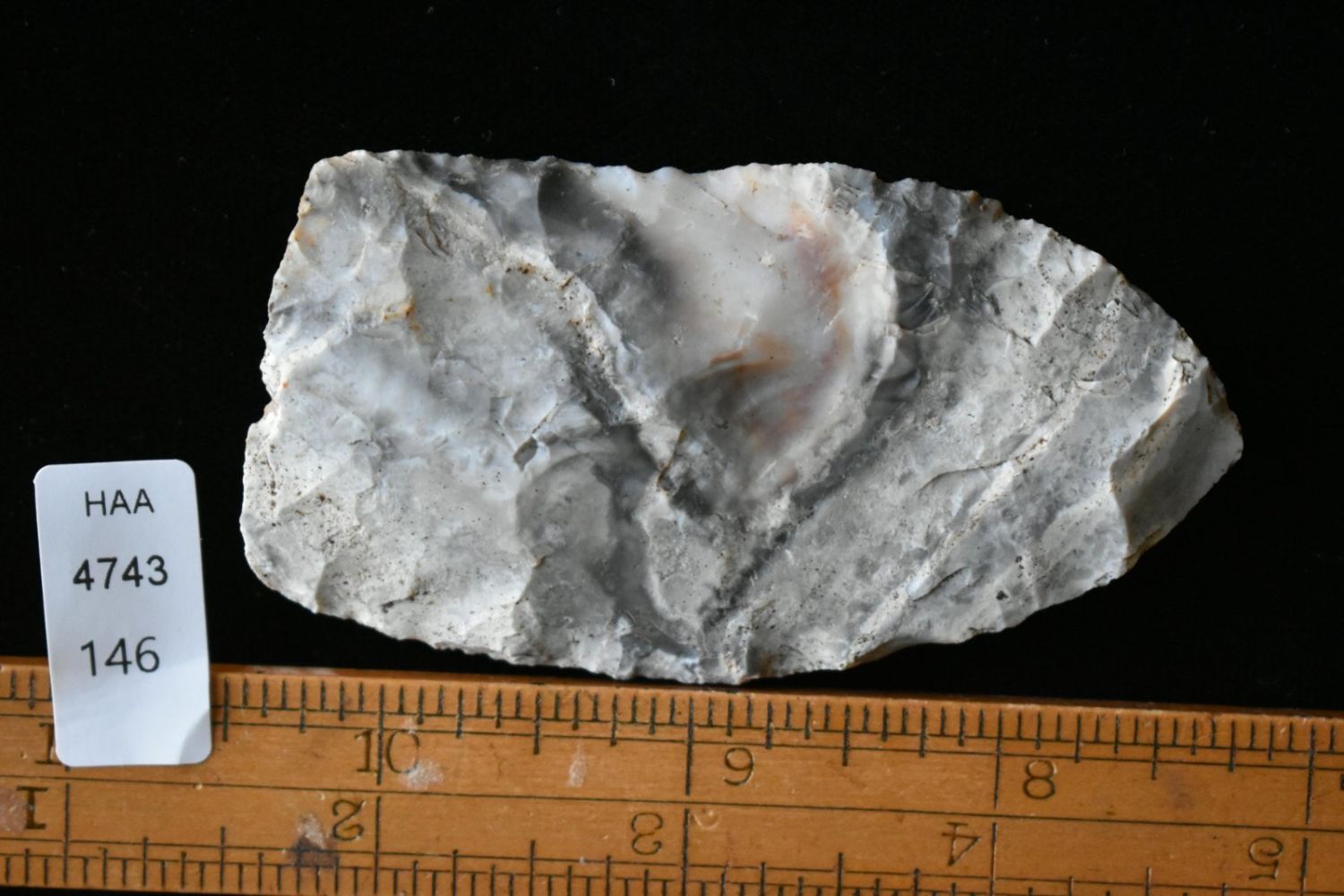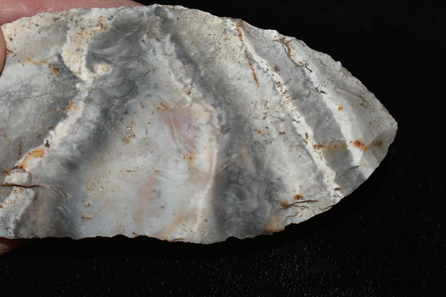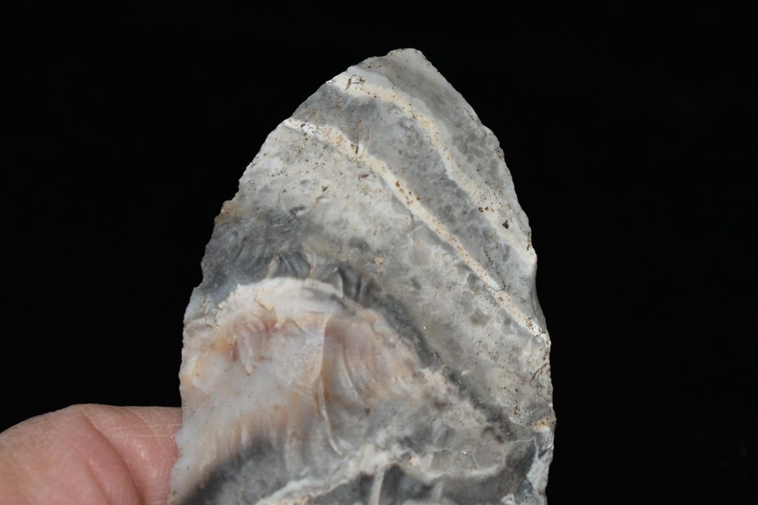 3 1/8" Archaic Knife made from extremely colorful Mozarkite. From the James and Joe George Collection. Joe George was an avid collector and finder of Native American artifacts in the greater St Louis Missouri area. Joe collected his entire life. Upon his passing he turned his collection over to his son James. James was also a very avid collector. He enjoyed walking various waterways and attending artifact shows. James is looking forward to passing down his collection to the relic community for caretaking.