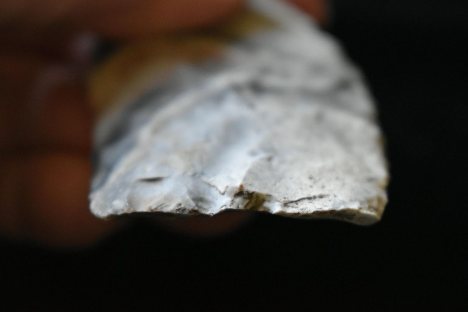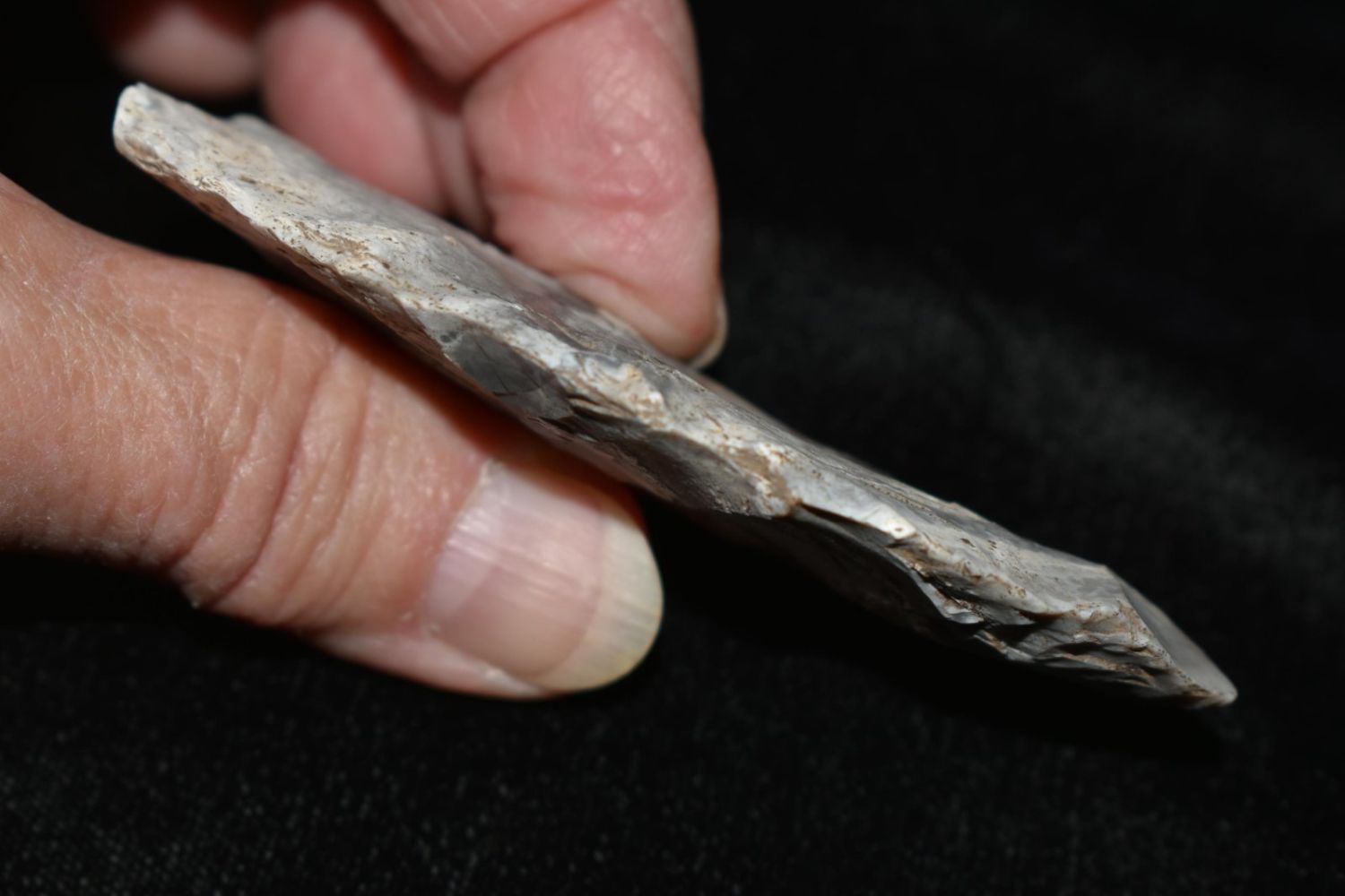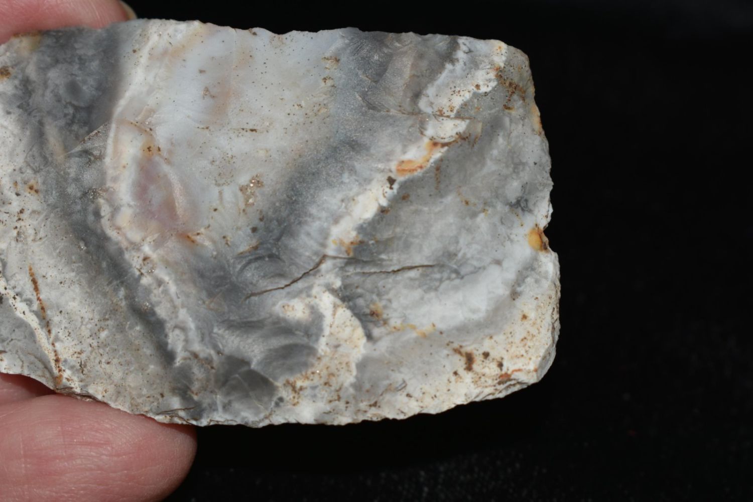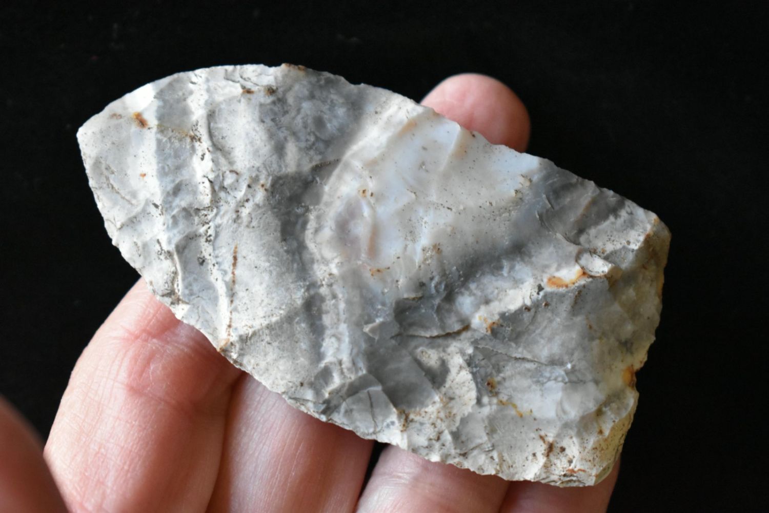 3 1/8" Archaic Knife made from extremely colorful Mozarkite. From the James and Joe George Collection. Joe George was an avid collector and finder of Native American artifacts in the greater St Louis Missouri area. Joe collected his entire life. Upon his passing he turned his collection over to his son James. James was also a very avid collector. He enjoyed walking various waterways and attending artifact shows. James is looking forward to passing down his collection to the relic community for caretaking.