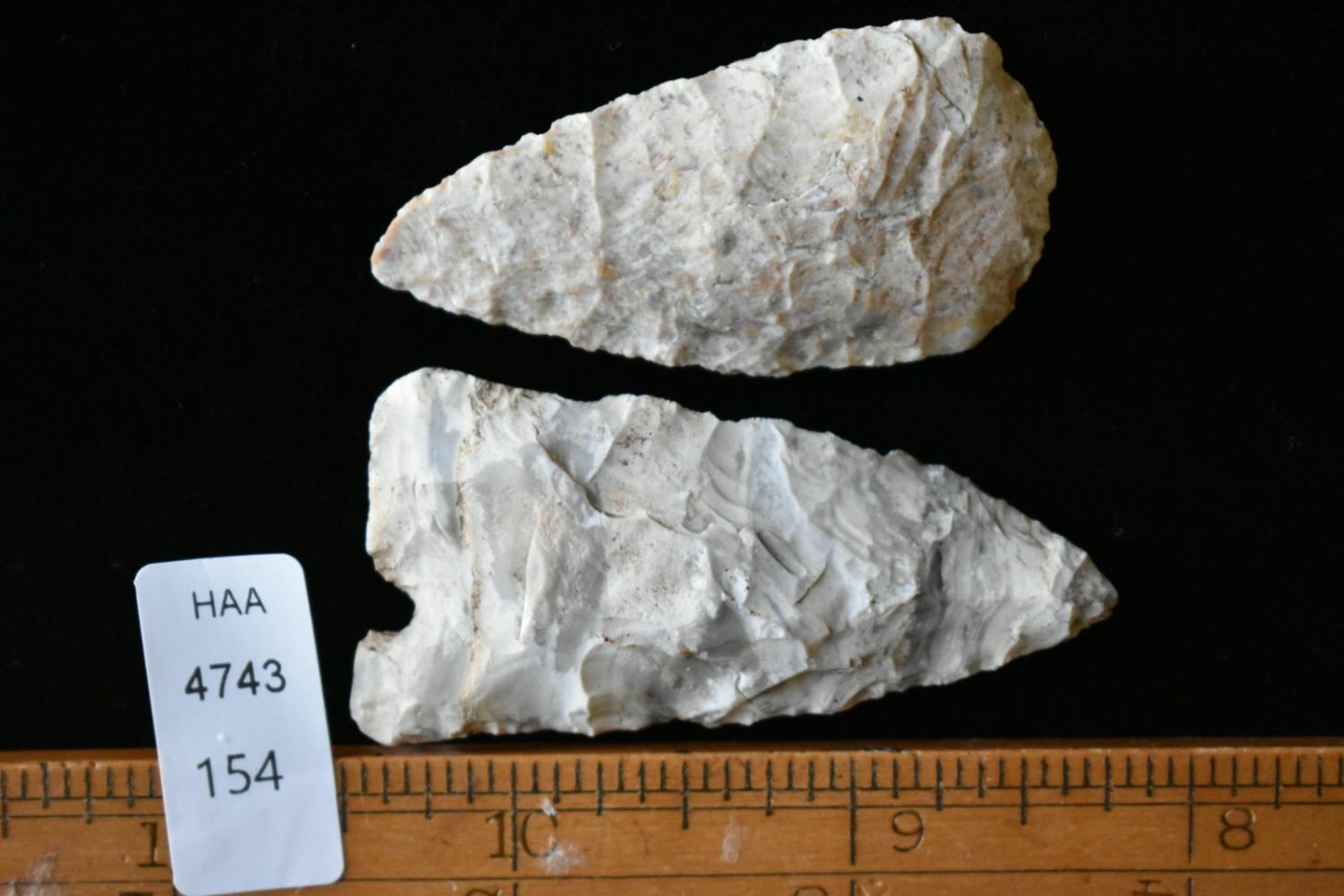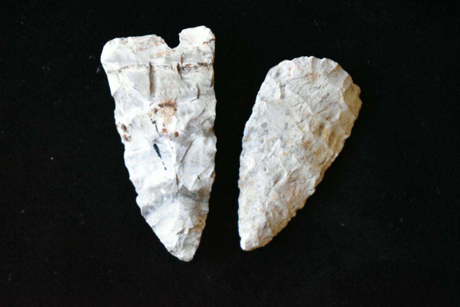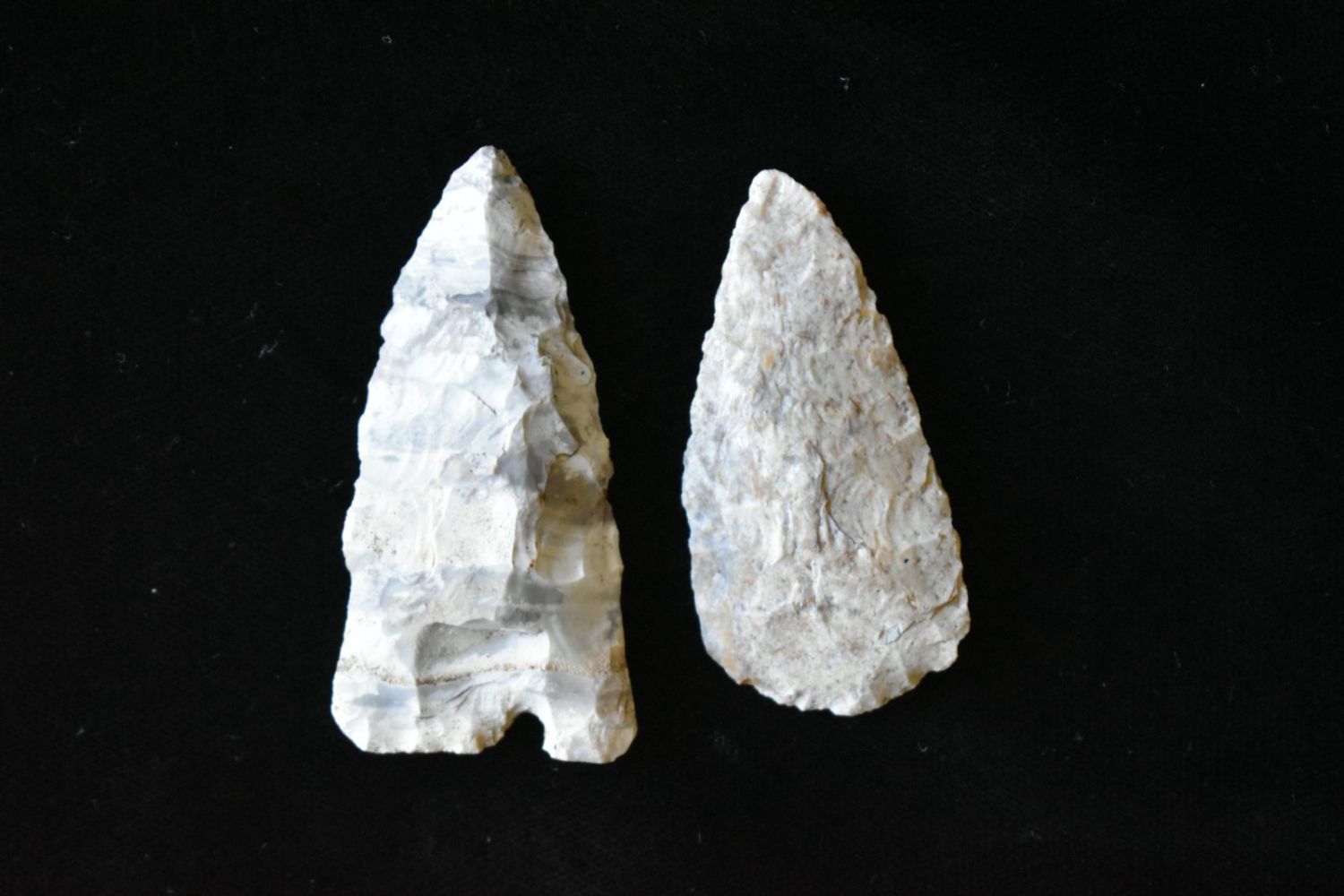 Pair of Arrowheads. From the James and Joe George Collection. Joe George was an avid collector and finder of Native American artifacts in the greater St Louis Missouri area. Joe collected his entire life. Upon his passing he turned his collection over to his son James. James was also a very avid collector. He enjoyed walking various waterways and attending artifact shows. James is looking forward to passing down his collection to the relic community for caretaking.