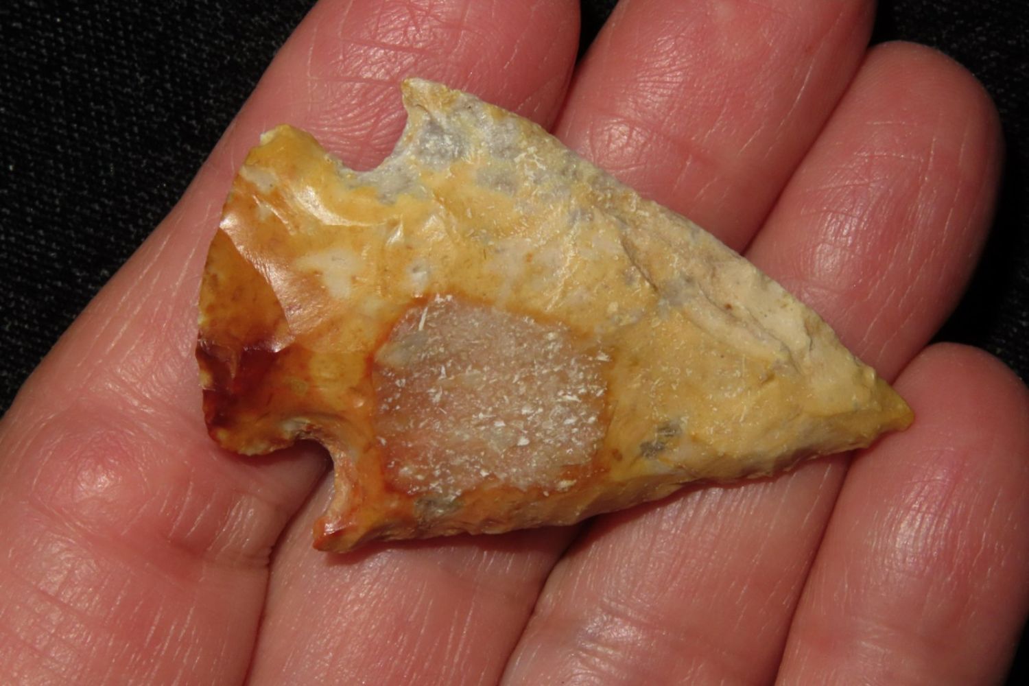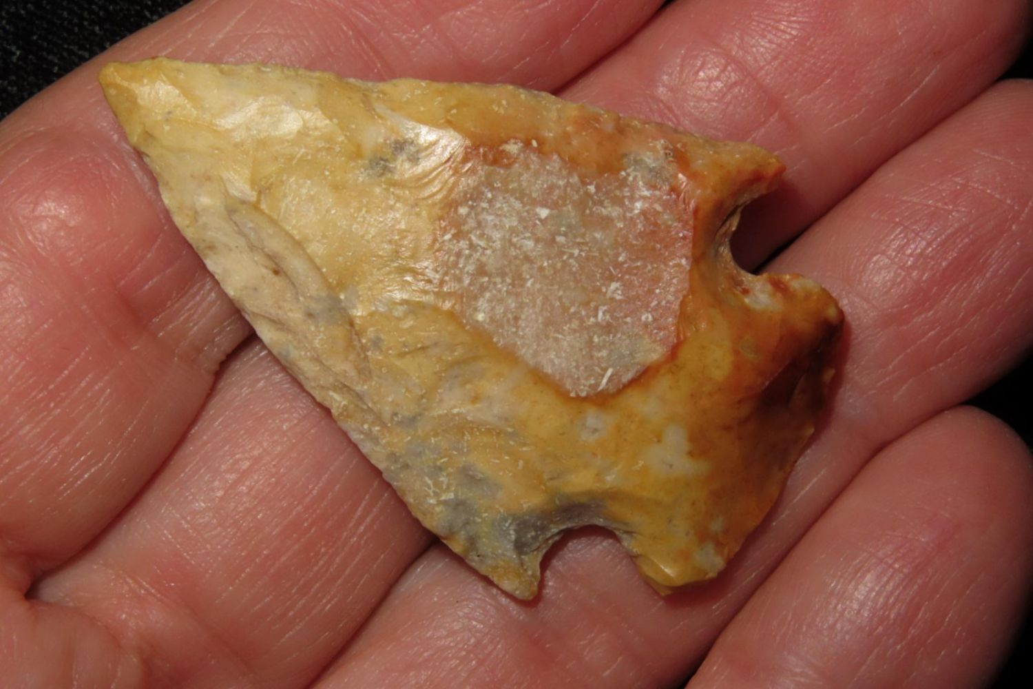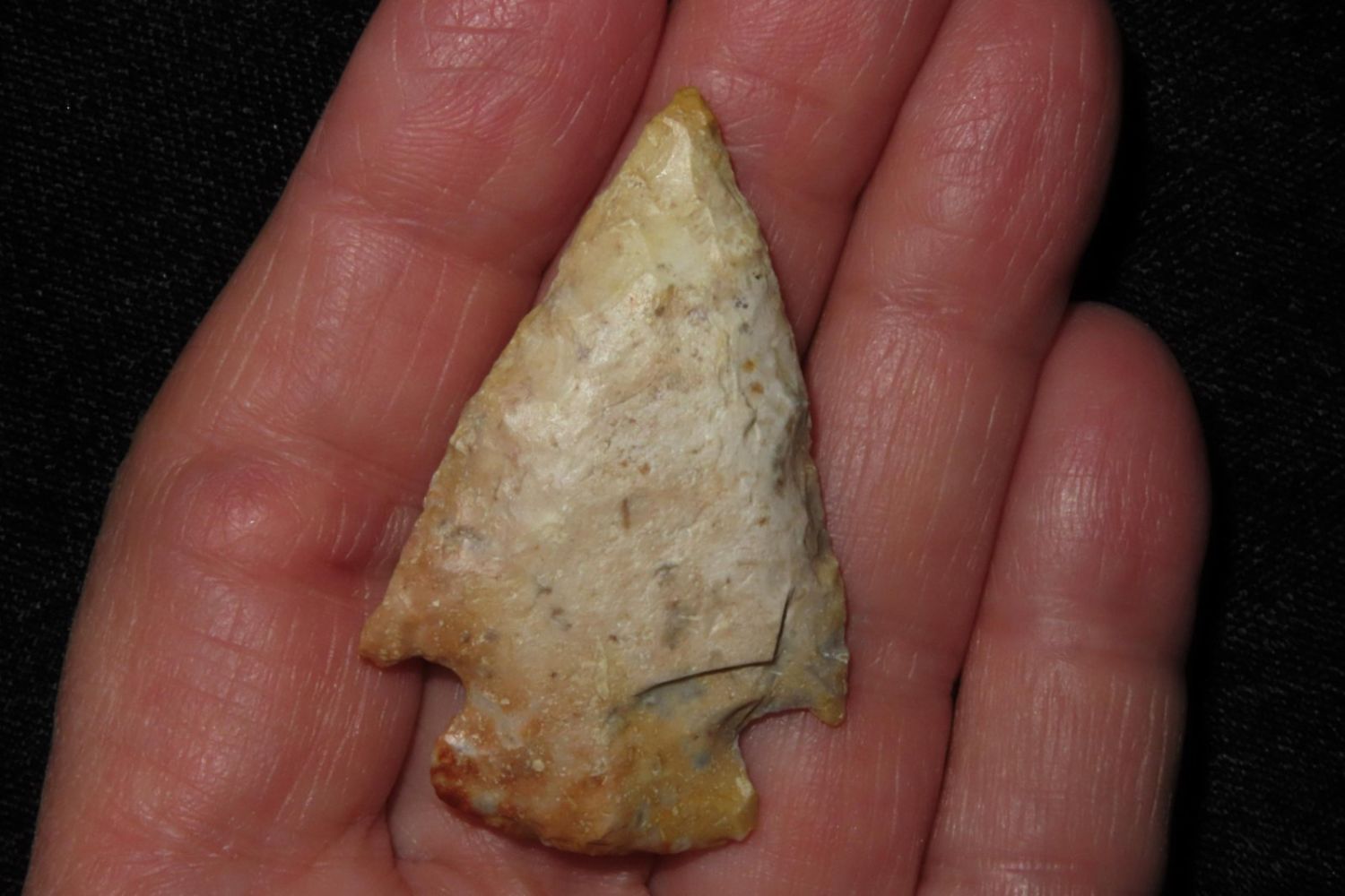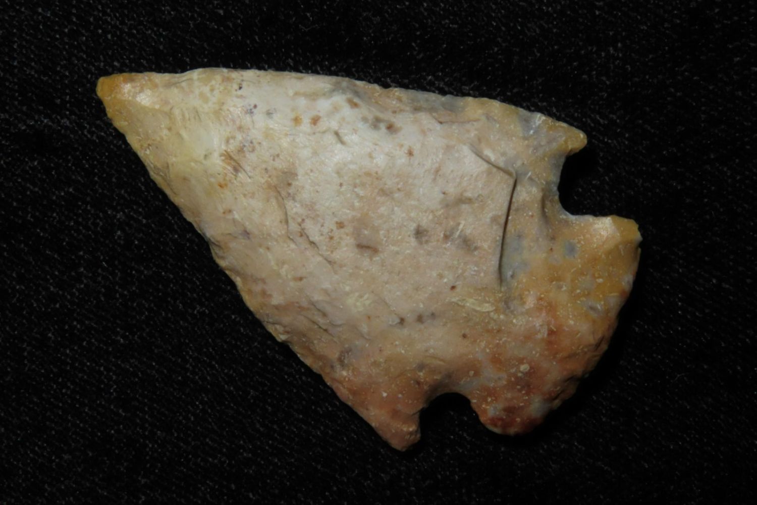 1 3/4" Creek stained Hopewell point. From the James and Joe George Collection. Joe George was an avid collector and finder of Native American artifacts in the greater St Louis Missouri area. Joe collected his entire life. Upon his passing he turned his collection over to his son James. James was also a very avid collector. He enjoyed walking various waterways and attending artifact shows. James is looking forward to passing down his collection to the relic community for caretaking.