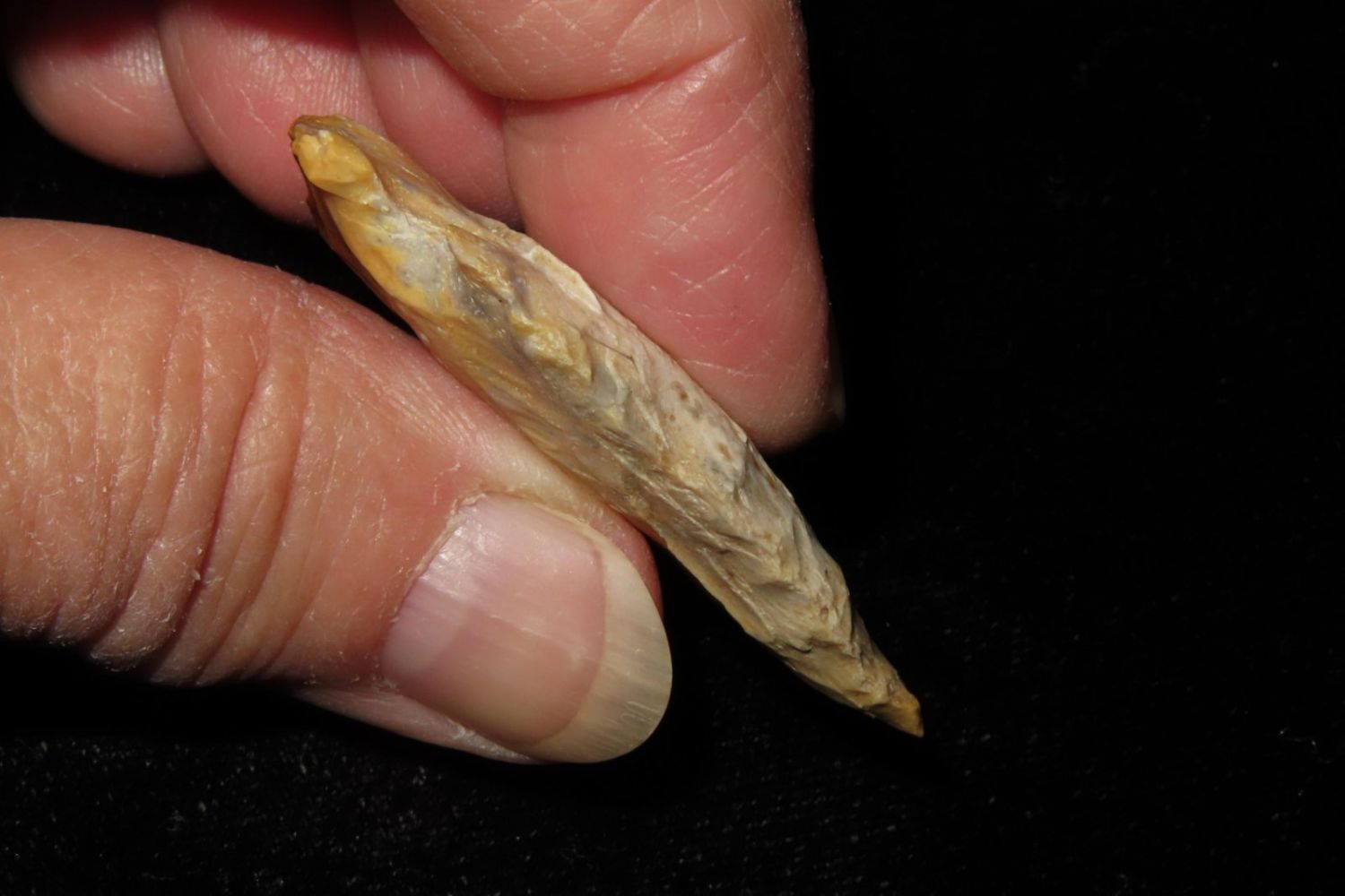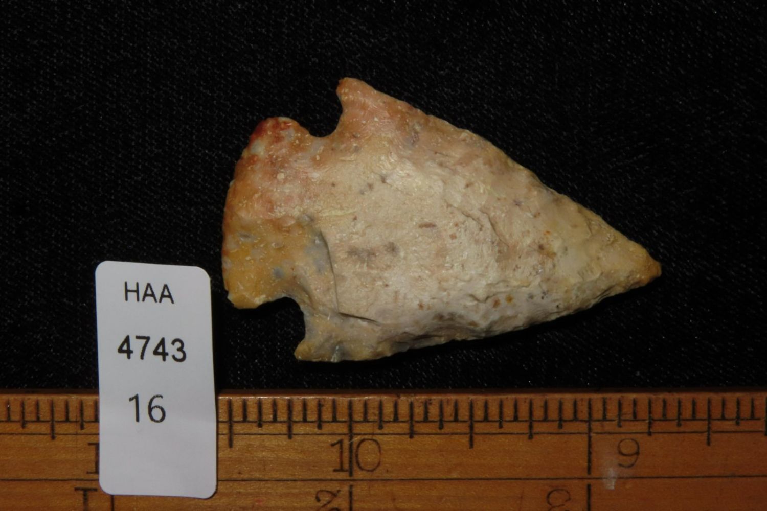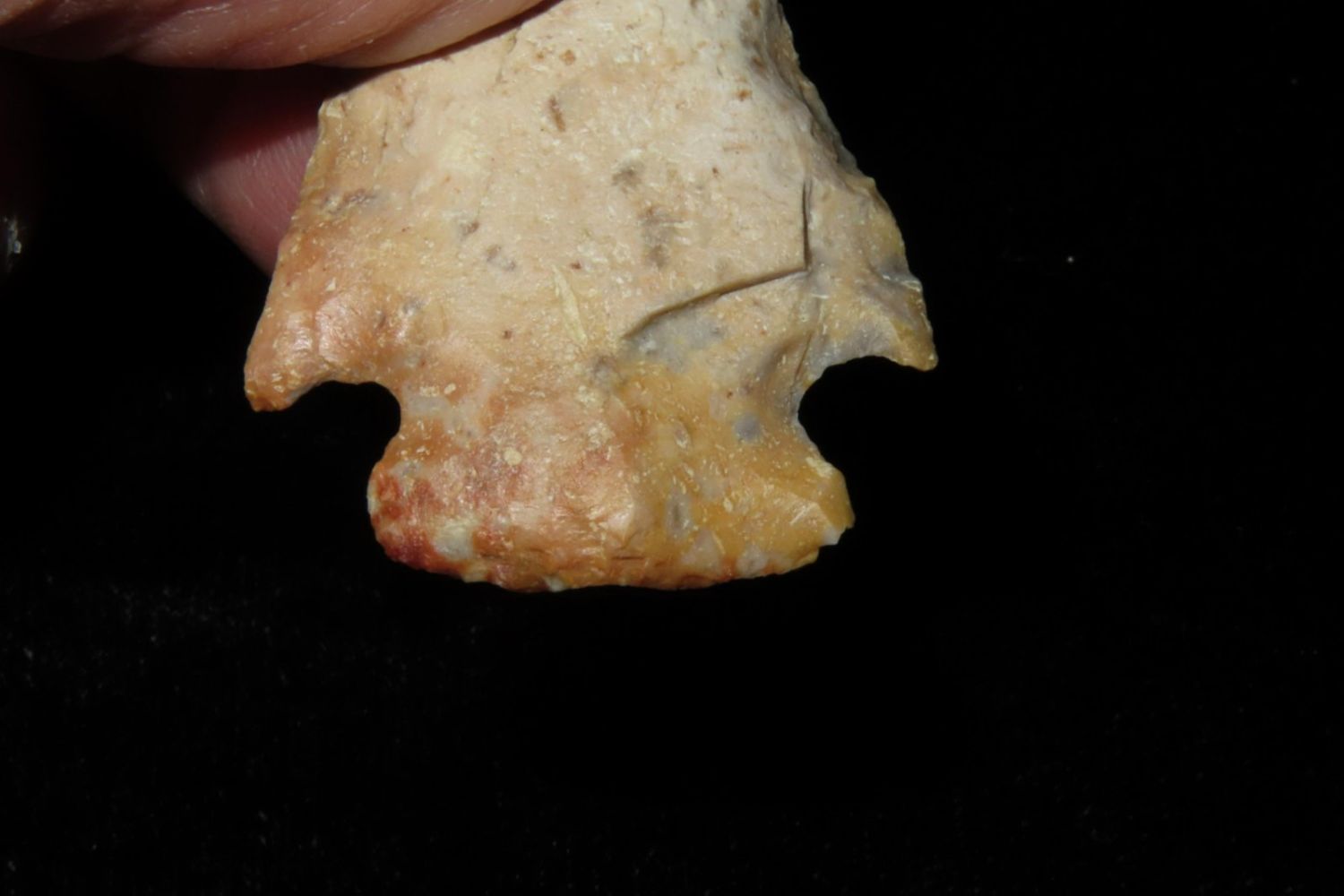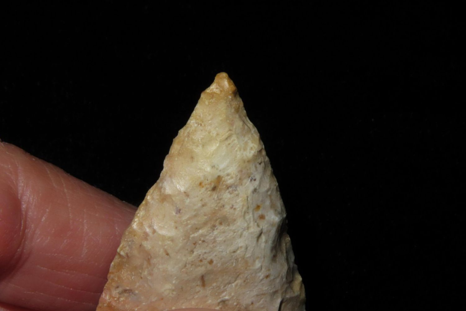 1 3/4" Creek stained Hopewell point. From the James and Joe George Collection. Joe George was an avid collector and finder of Native American artifacts in the greater St Louis Missouri area. Joe collected his entire life. Upon his passing he turned his collection over to his son James. James was also a very avid collector. He enjoyed walking various waterways and attending artifact shows. James is looking forward to passing down his collection to the relic community for caretaking.