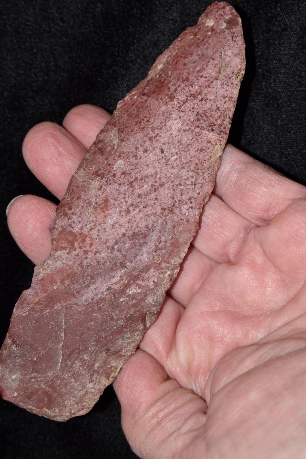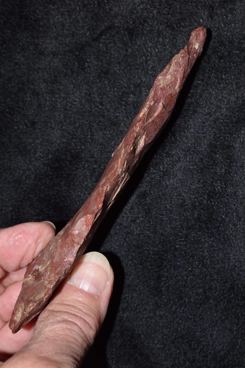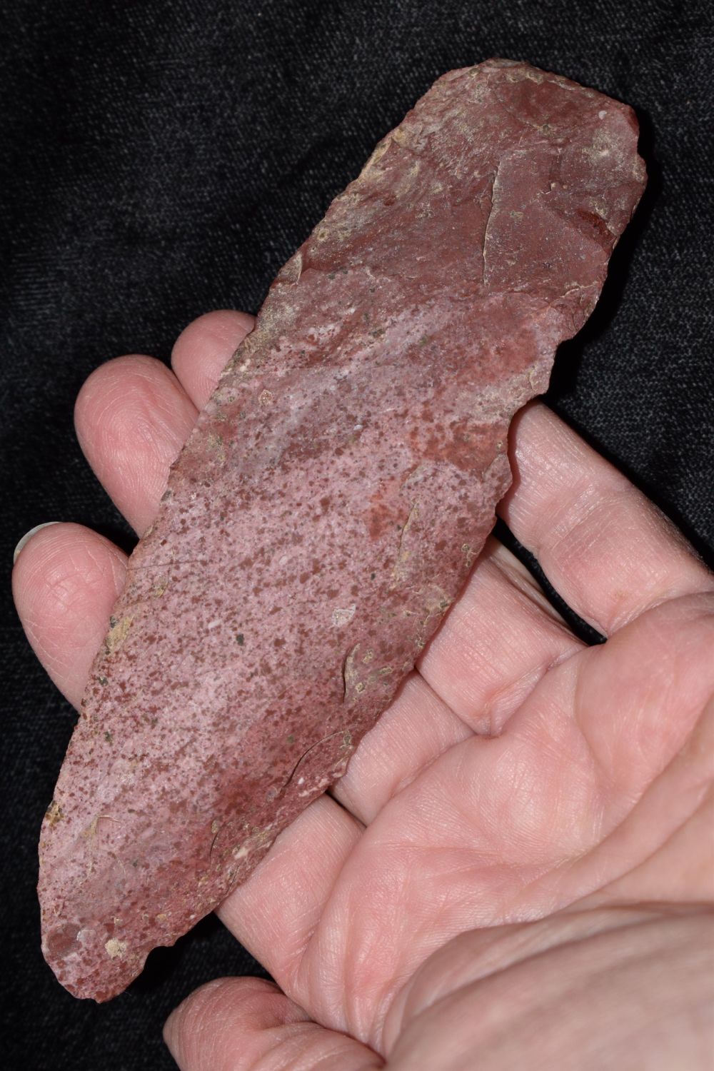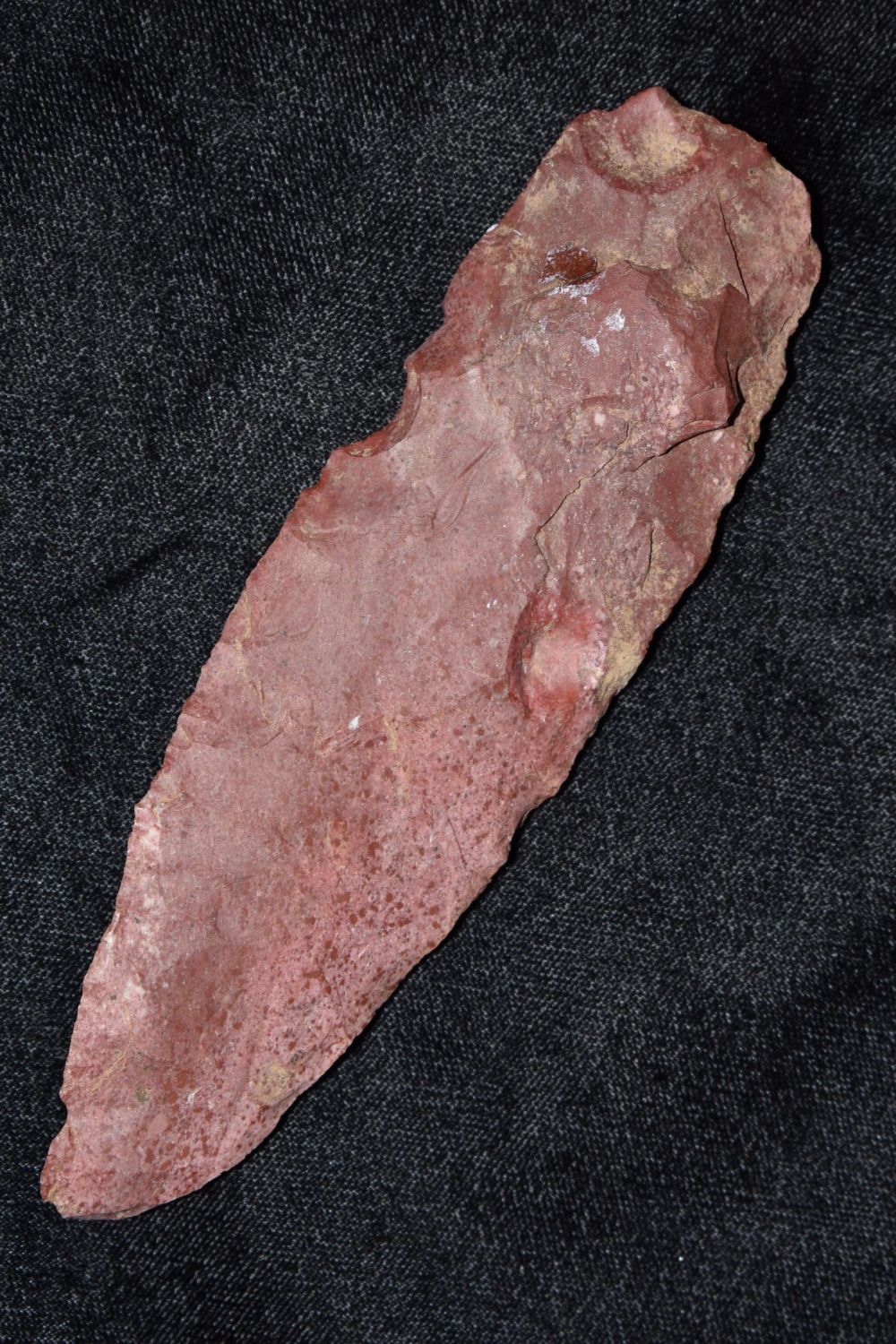 5 1/4" Bright Red Woodland Knife. From the James and Joe George Collection. Joe George was an avid collector and finder of Native American artifacts in the greater St Louis Missouri area. Joe collected his entire life. Upon his passing he turned his collection over to his son James. James was also a very avid collector. He enjoyed walking various waterways and attending artifact shows. James is looking forward to passing down his collection to the relic community for caretaking.