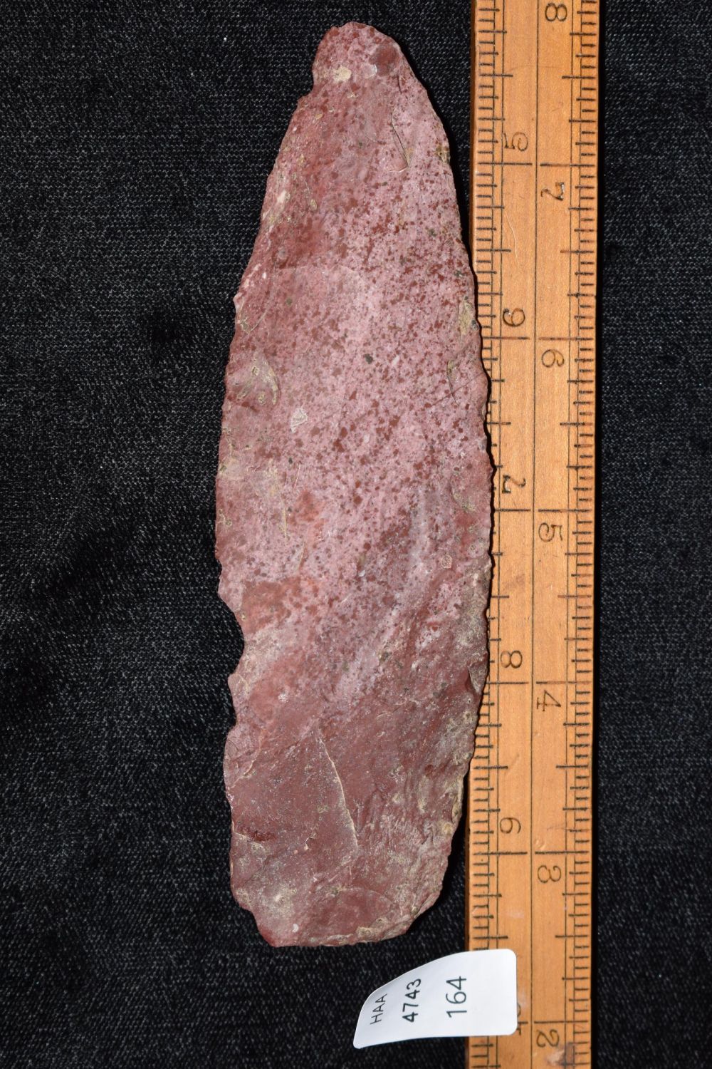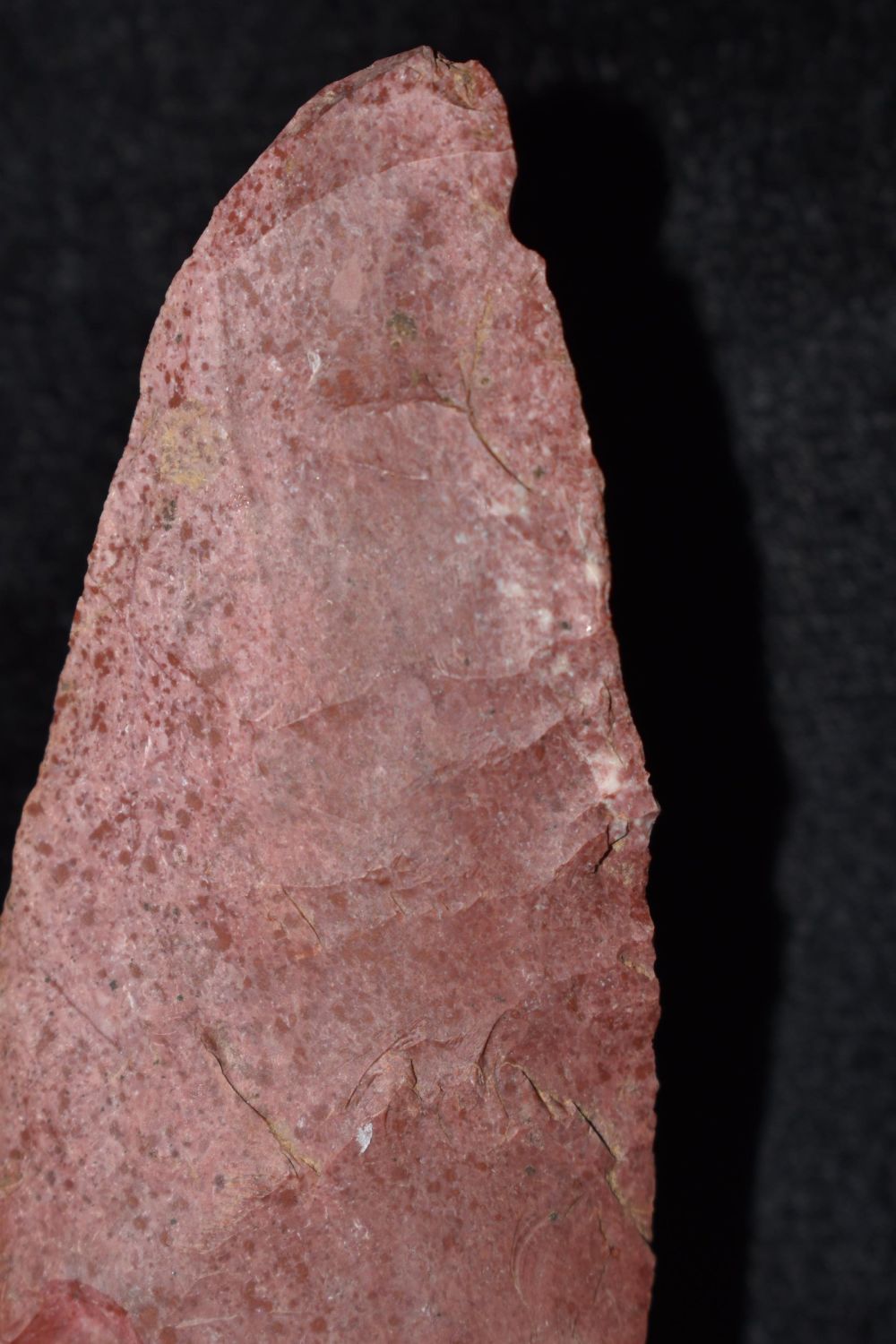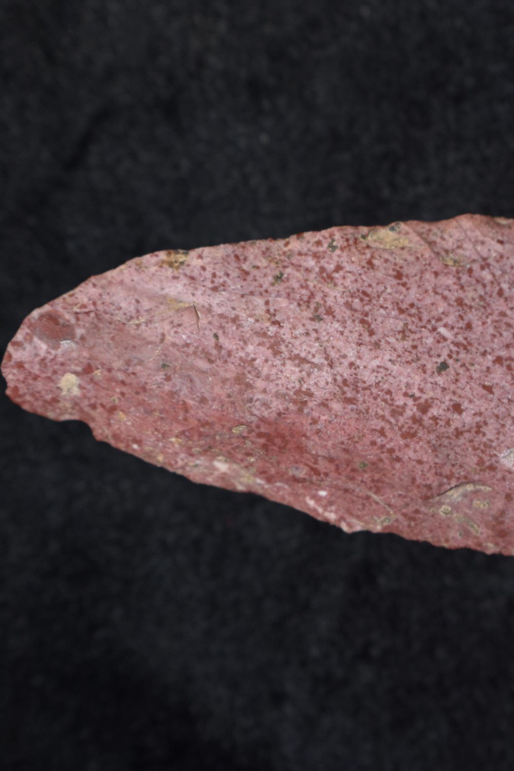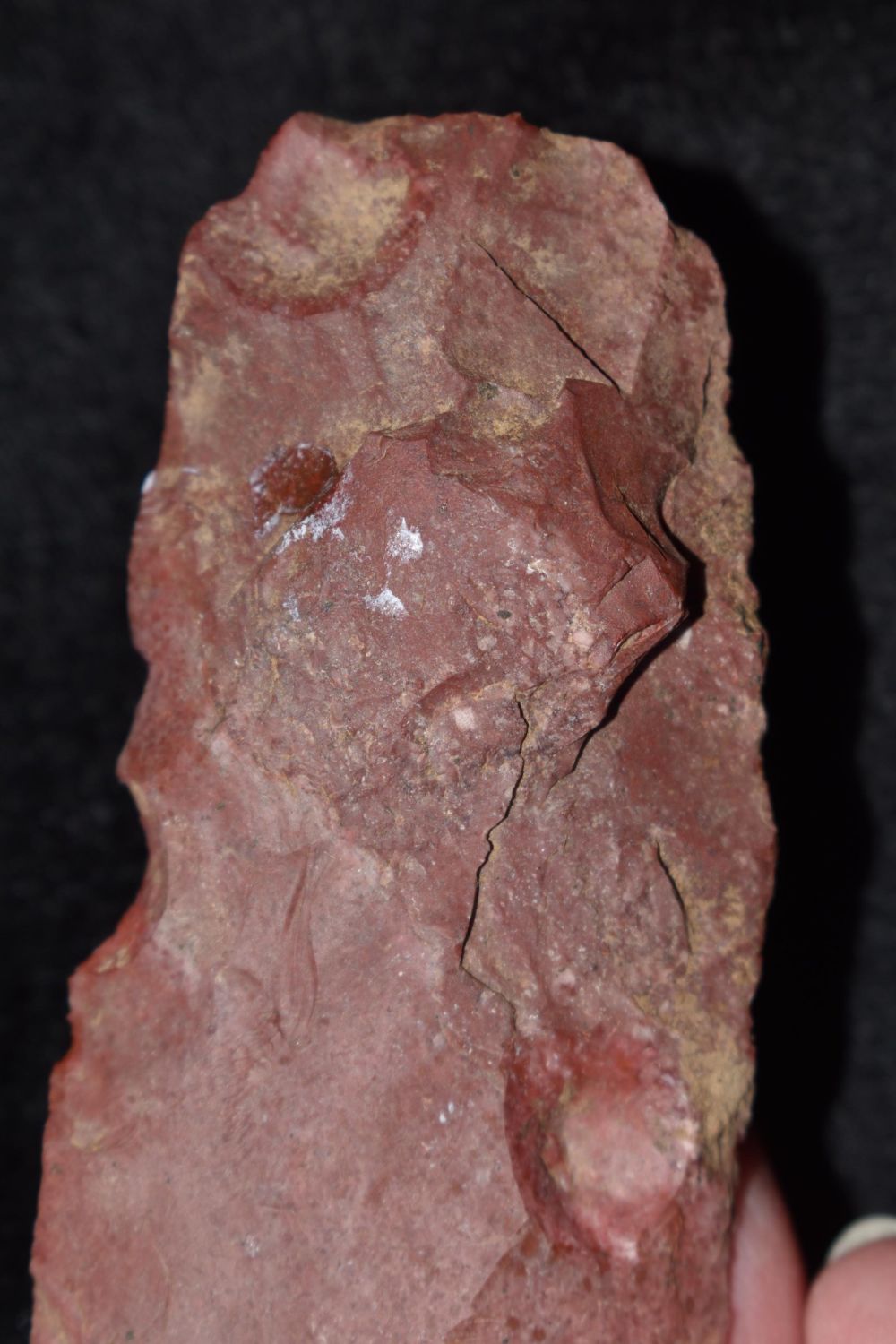 5 1/4" Bright Red Woodland Knife. From the James and Joe George Collection. Joe George was an avid collector and finder of Native American artifacts in the greater St Louis Missouri area. Joe collected his entire life. Upon his passing he turned his collection over to his son James. James was also a very avid collector. He enjoyed walking various waterways and attending artifact shows. James is looking forward to passing down his collection to the relic community for caretaking.