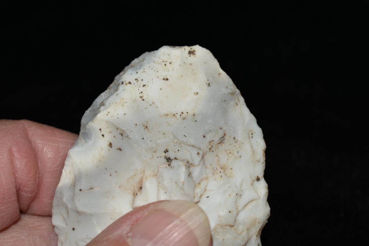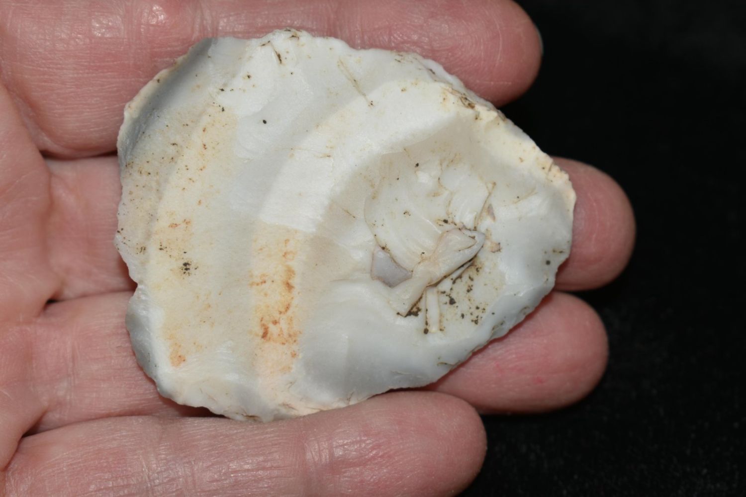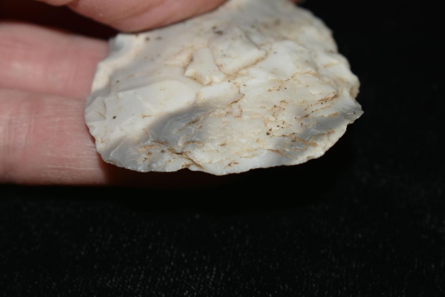 2 1/8" Bullseye Blade. From the James and Joe George Collection. Joe George was an avid collector and finder of Native American artifacts in the greater St Louis Missouri area. Joe collected his entire life. Upon his passing he turned his collection over to his son James. James was also a very avid collector. He enjoyed walking various waterways and attending artifact shows. James is looking forward to passing down his collection to the relic community for caretaking.