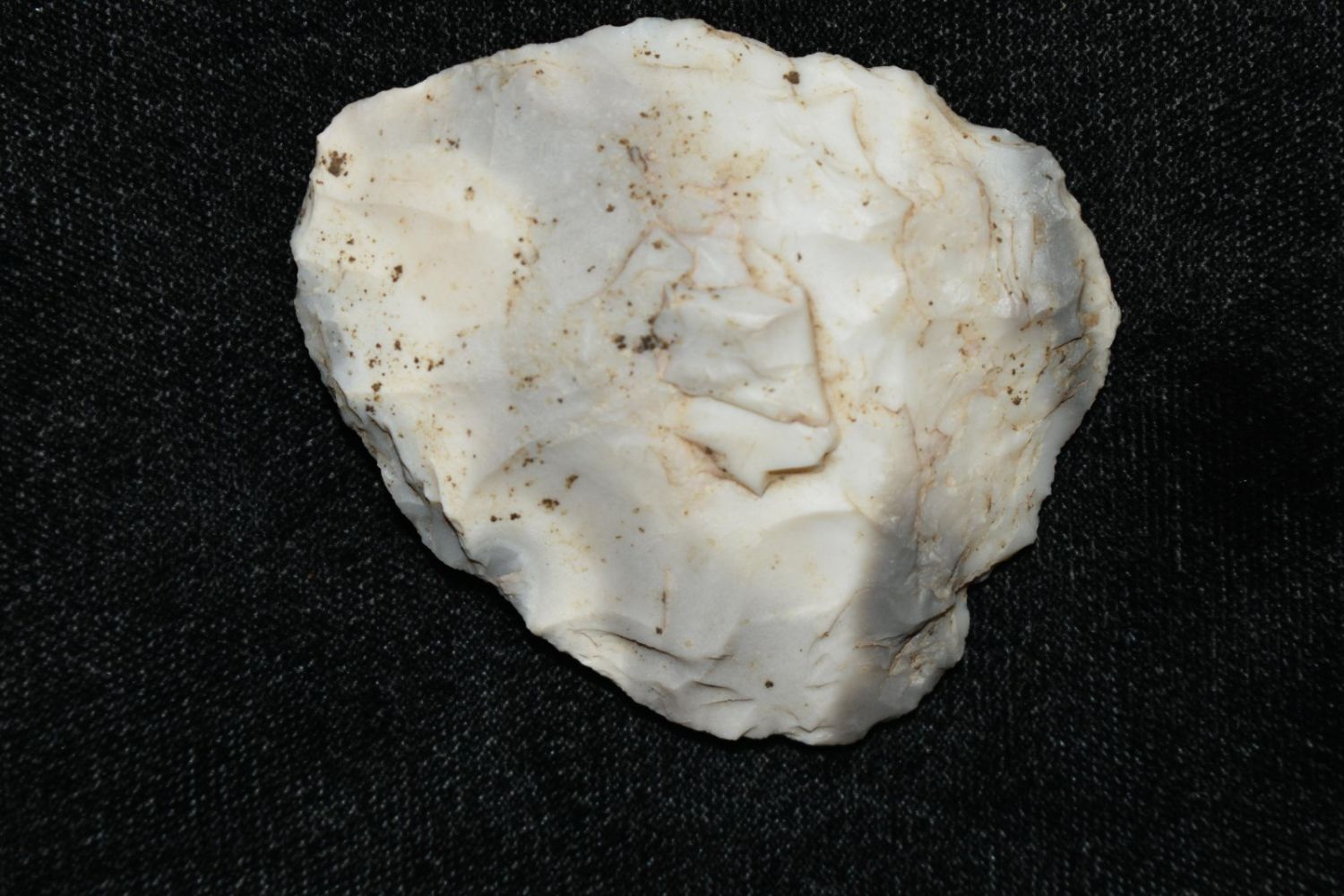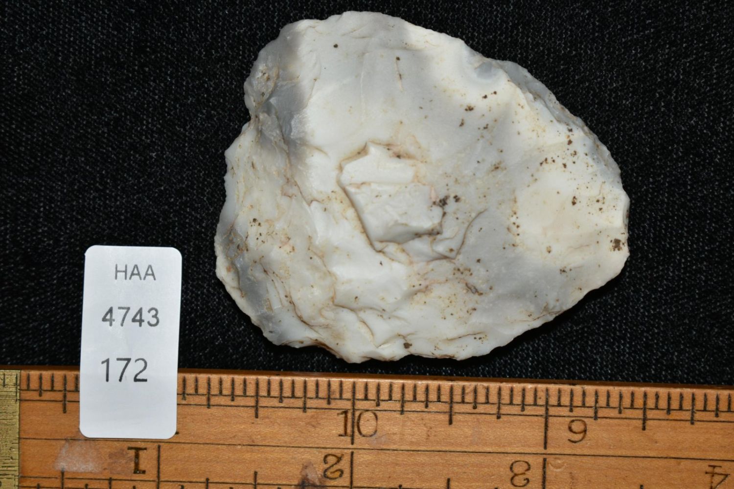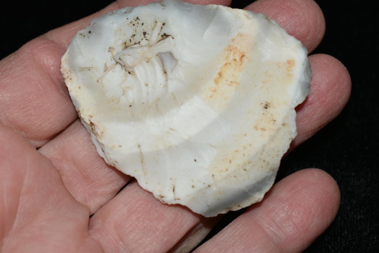 2 1/8" Bullseye Blade. From the James and Joe George Collection. Joe George was an avid collector and finder of Native American artifacts in the greater St Louis Missouri area. Joe collected his entire life. Upon his passing he turned his collection over to his son James. James was also a very avid collector. He enjoyed walking various waterways and attending artifact shows. James is looking forward to passing down his collection to the relic community for caretaking.