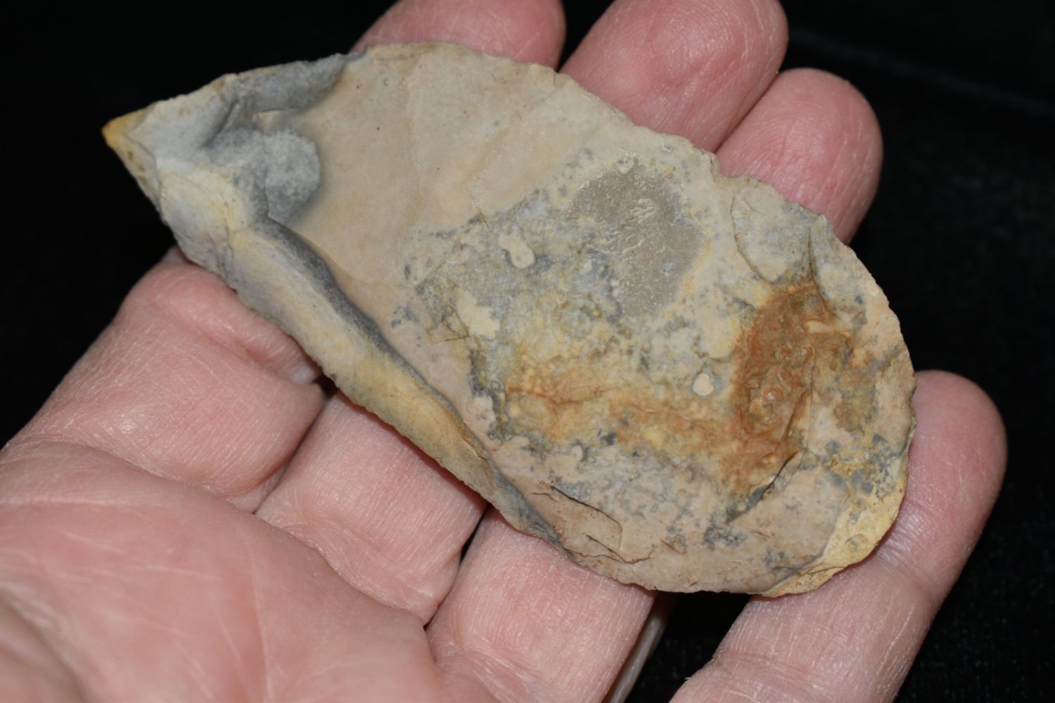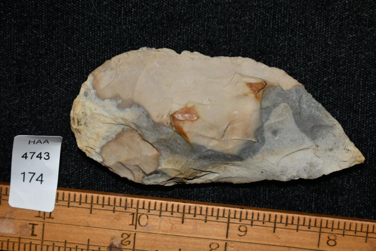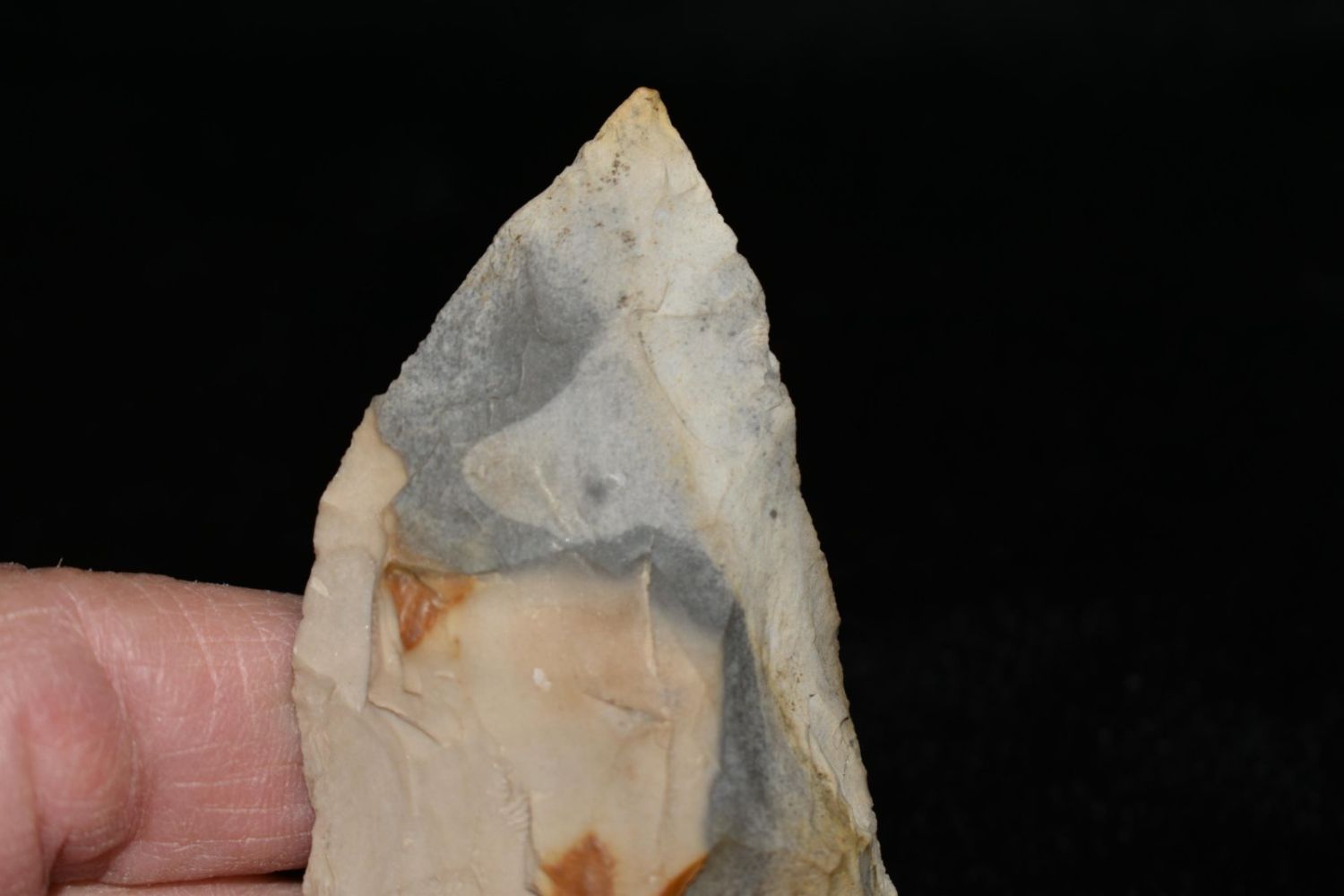 3 1/8" Wildly Colorful Blade. From the James and Joe George Collection. Joe George was an avid collector and finder of Native American artifacts in the greater St Louis Missouri area. Joe collected his entire life. Upon his passing he turned his collection over to his son James. James was also a very avid collector. He enjoyed walking various waterways and attending artifact shows. James is looking forward to passing down his collection to the relic community for caretaking.