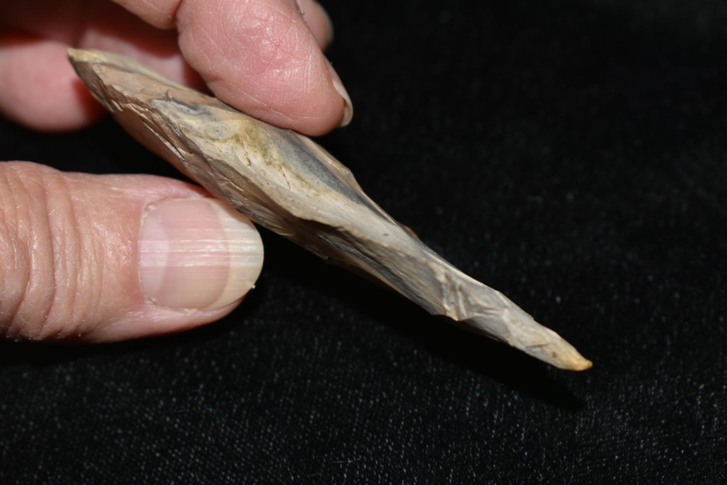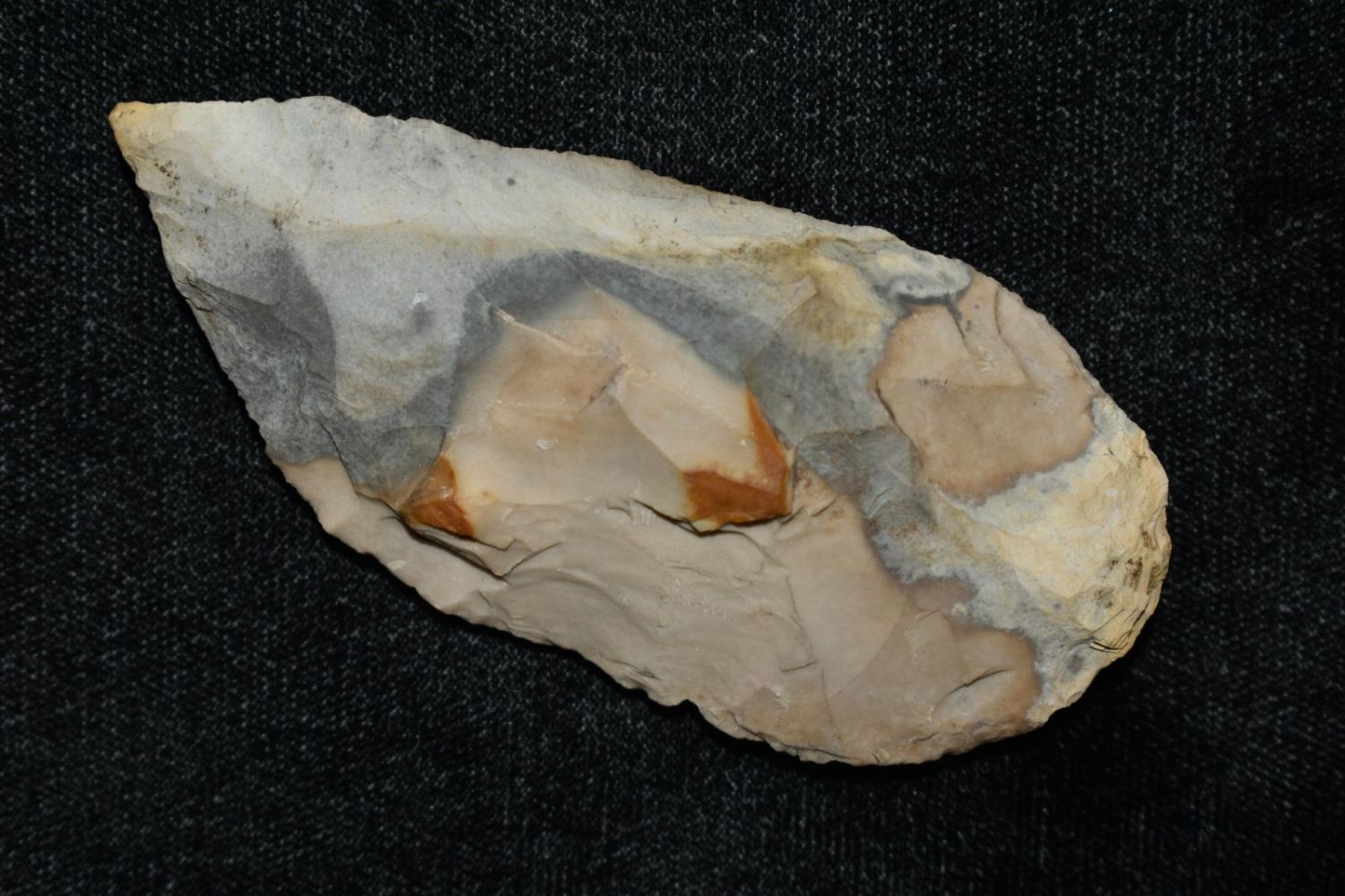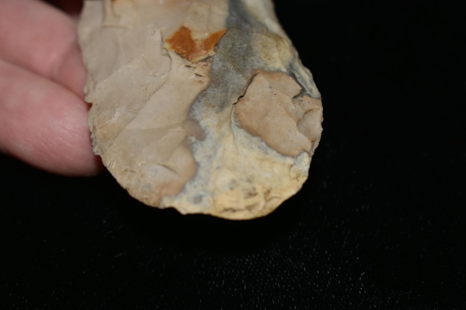 3 1/8" Wildly Colorful Blade. From the James and Joe George Collection. Joe George was an avid collector and finder of Native American artifacts in the greater St Louis Missouri area. Joe collected his entire life. Upon his passing he turned his collection over to his son James. James was also a very avid collector. He enjoyed walking various waterways and attending artifact shows. James is looking forward to passing down his collection to the relic community for caretaking.