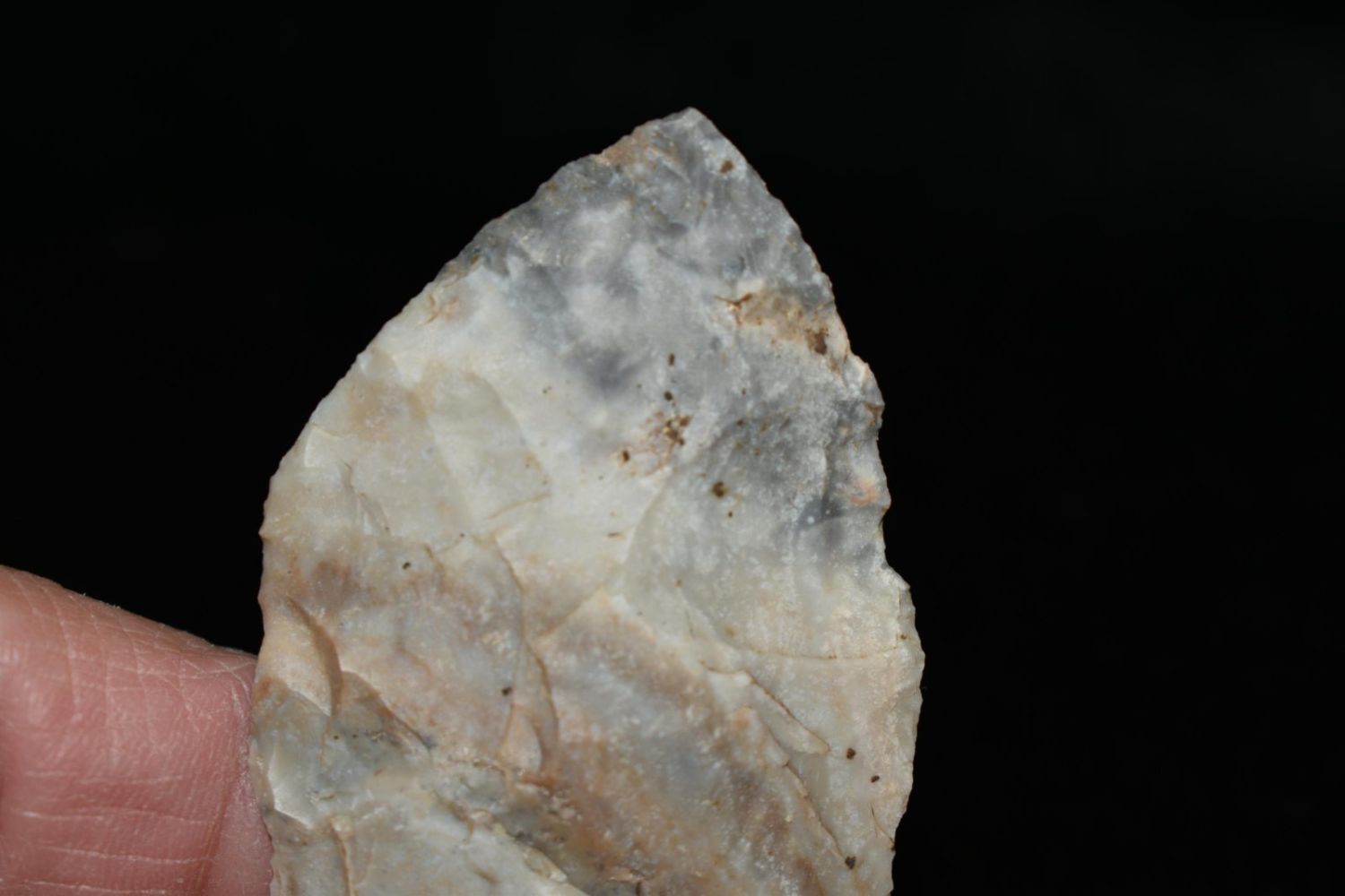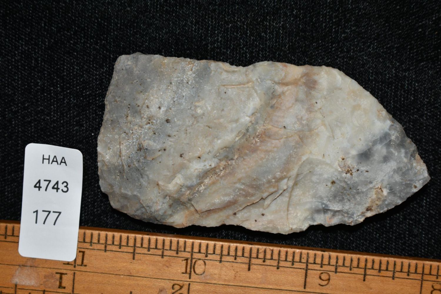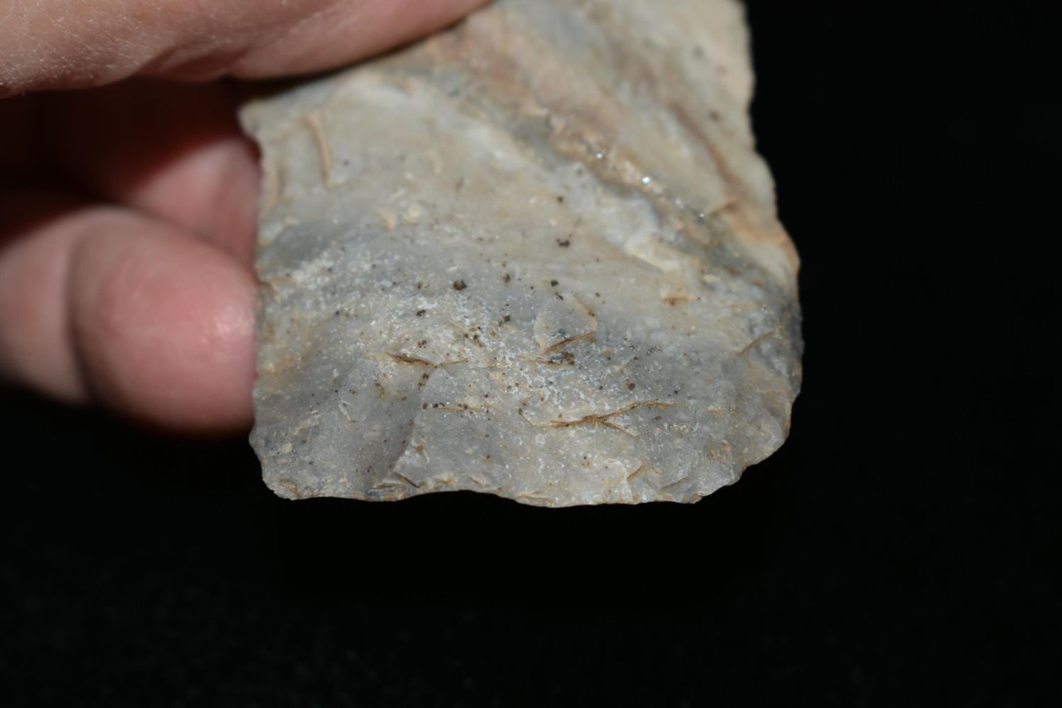 2 7/8" Square Base Blade. From the James and Joe George Collection. Joe George was an avid collector and finder of Native American artifacts in the greater St Louis Missouri area. Joe collected his entire life. Upon his passing he turned his collection over to his son James. James was also a very avid collector. He enjoyed walking various waterways and attending artifact shows. James is looking forward to passing down his collection to the relic community for caretaking.