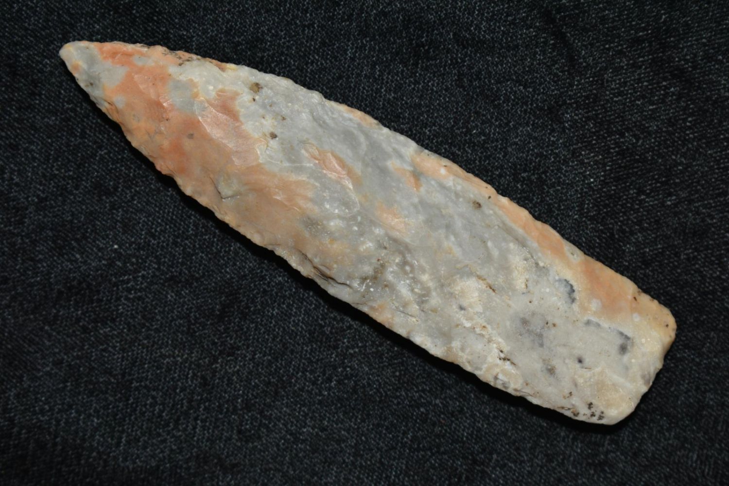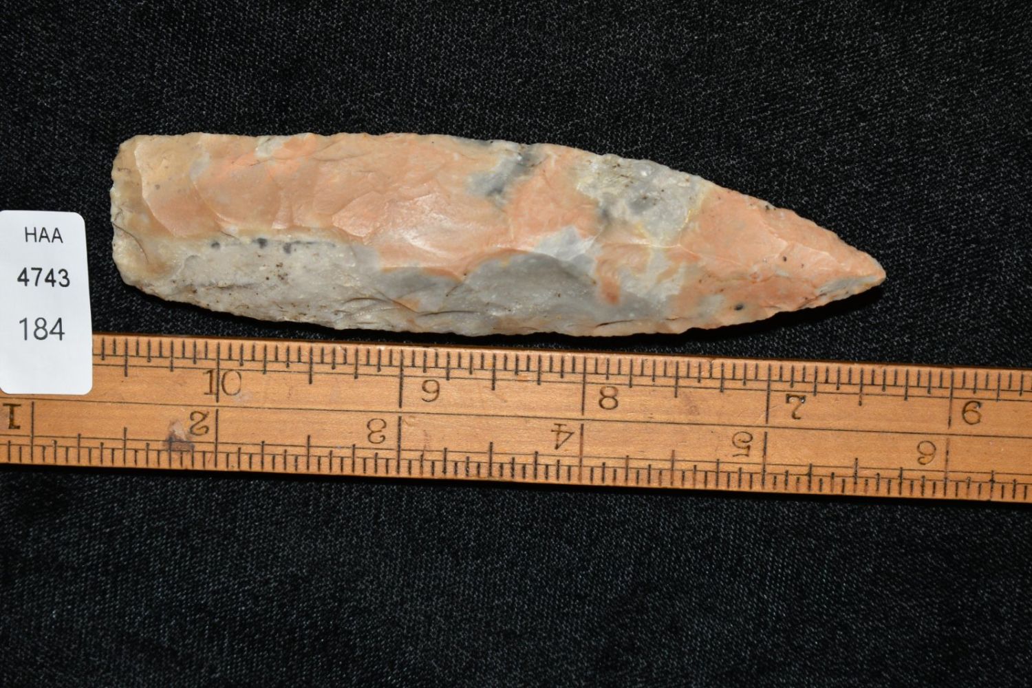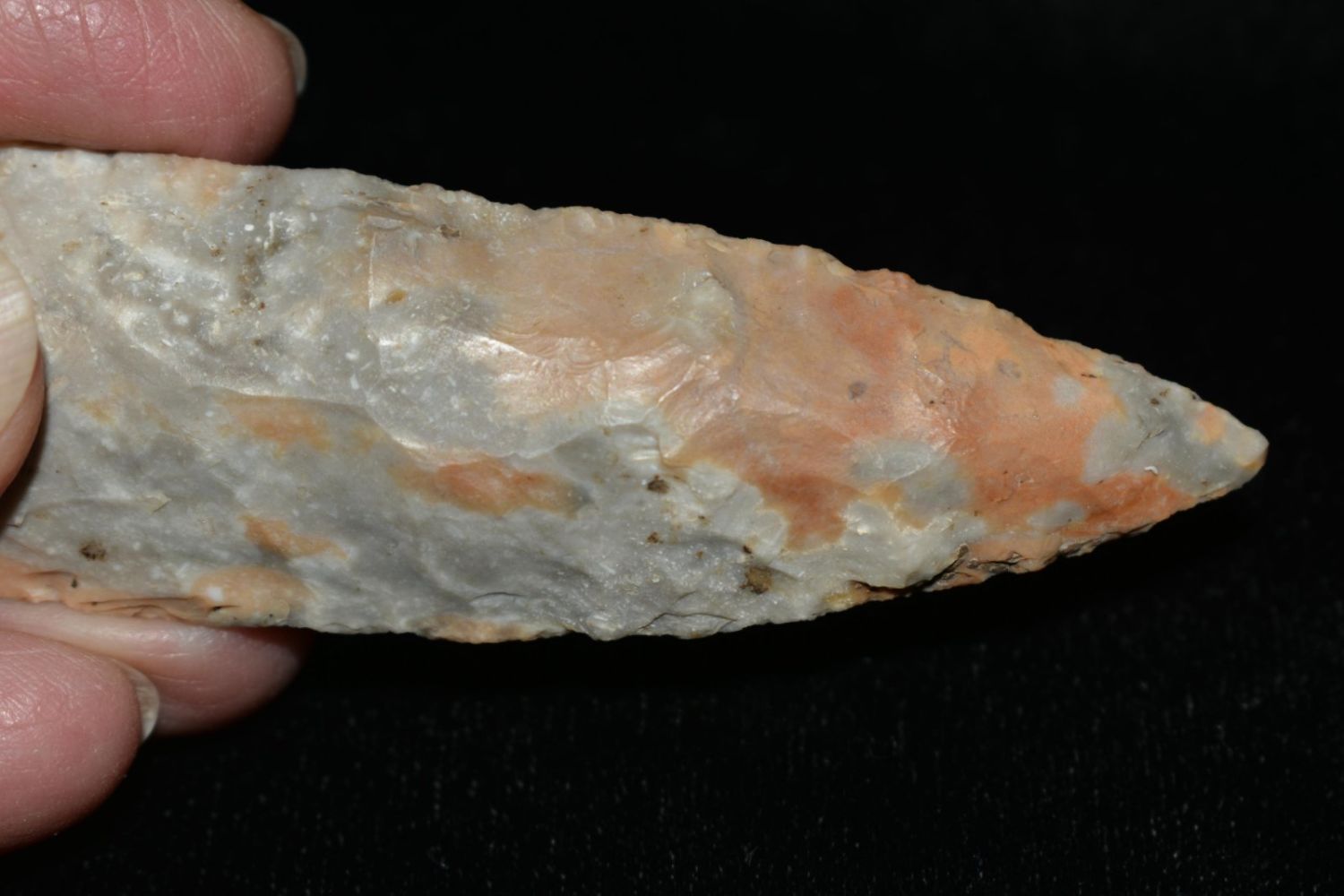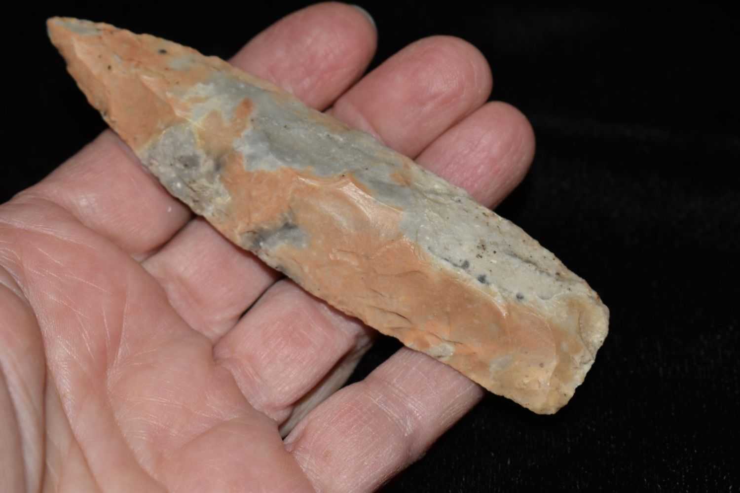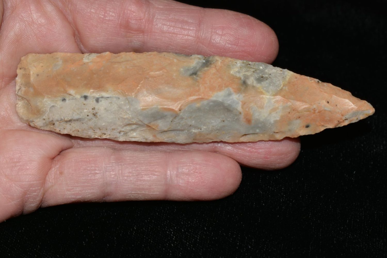 4 1/8" Nebo Hill with great colors. From the James and Joe George Collection. Joe George was an avid collector and finder of Native American artifacts in the greater St Louis Missouri area. Joe collected his entire life. Upon his passing he turned his collection over to his son James. James was also a very avid collector. He enjoyed walking various waterways and attending artifact shows. James is looking forward to passing down his collection to the relic community for caretaking.