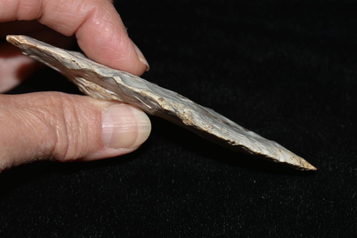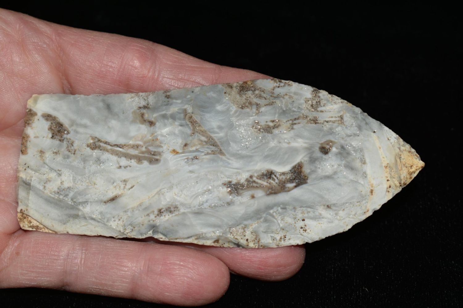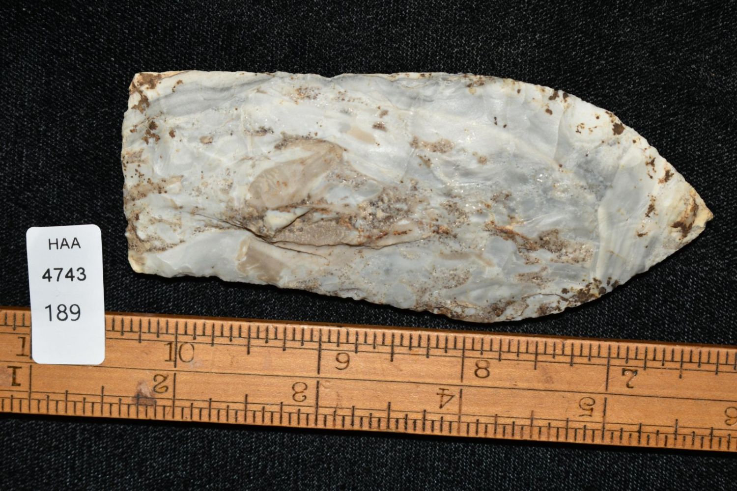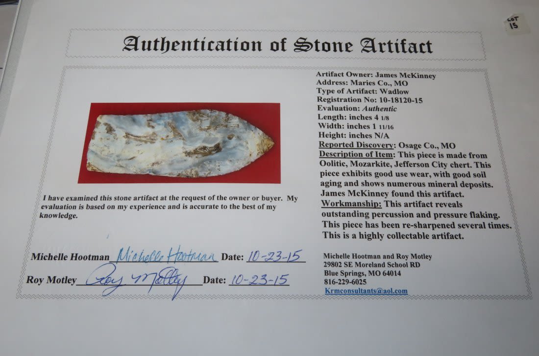 4 1/8" Wadlow with Motley COA. Found in Osage County, MO. Nicely made. From the James and Joe George Collection. Joe George was an avid collector and finder of Native American artifacts in the greater St Louis Missouri area. Joe collected his entire life. Upon his passing he turned his collection over to his son James. James was also a very avid collector. He enjoyed walking various waterways and attending artifact shows. James is looking forward to passing down his collection to the relic community for caretaking.