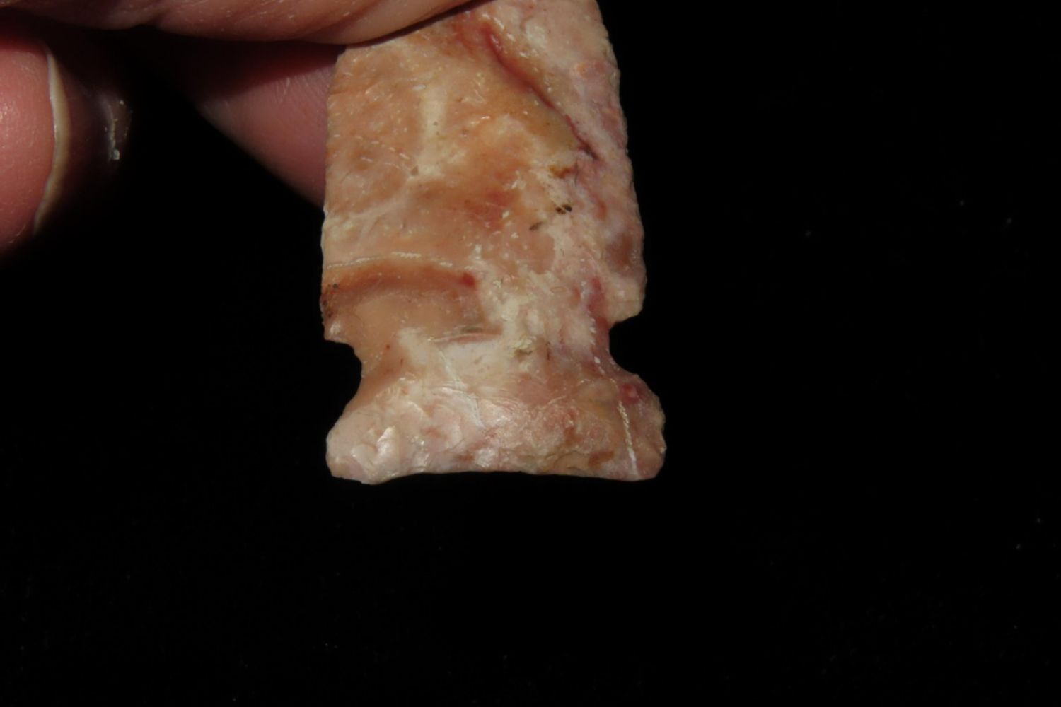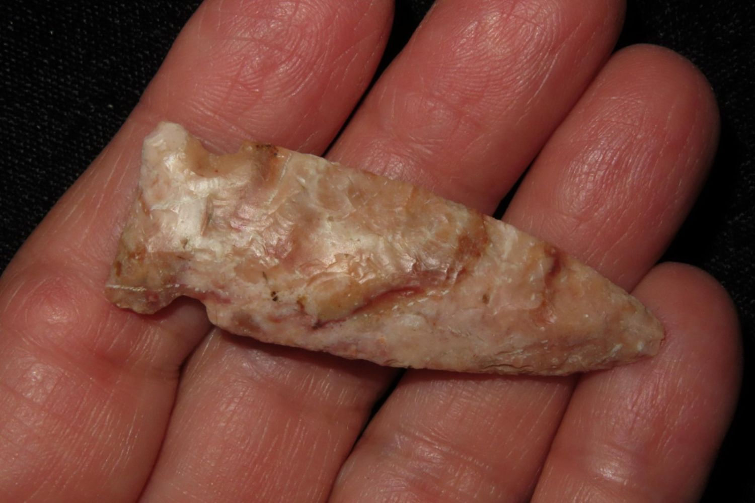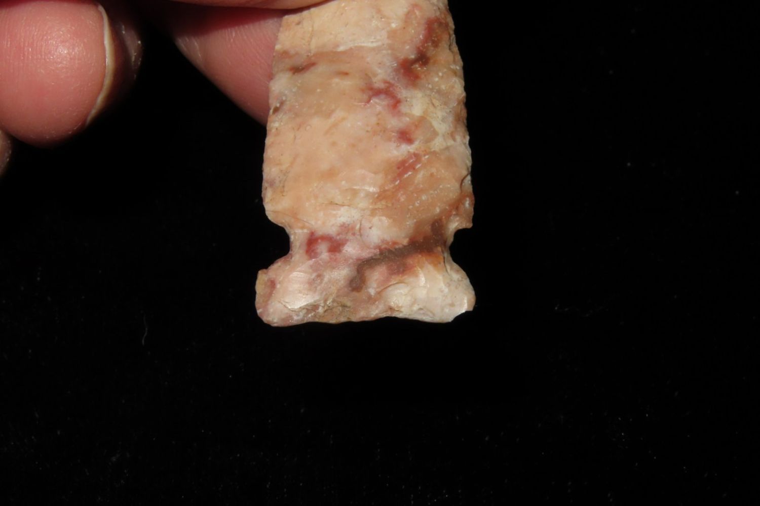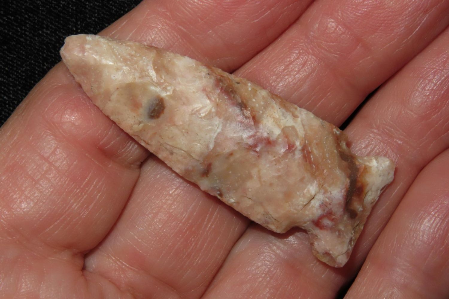 2" Matanzas, creek found and extremely colorful. From the James and Joe George Collection. Joe George was an avid collector and finder of Native American artifacts in the greater St Louis Missouri area. Joe collected his entire life. Upon his passing he turned his collection over to his son James. James was also a very avid collector. He enjoyed walking various waterways and attending artifact shows. James is looking forward to passing down his collection to the relic community for caretaking.