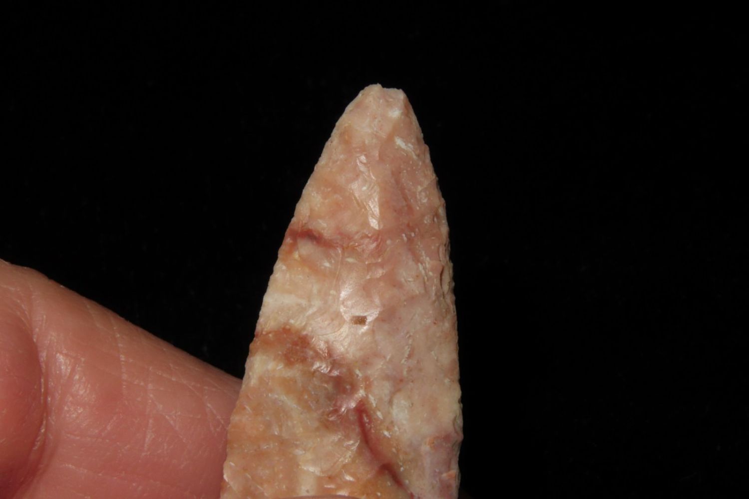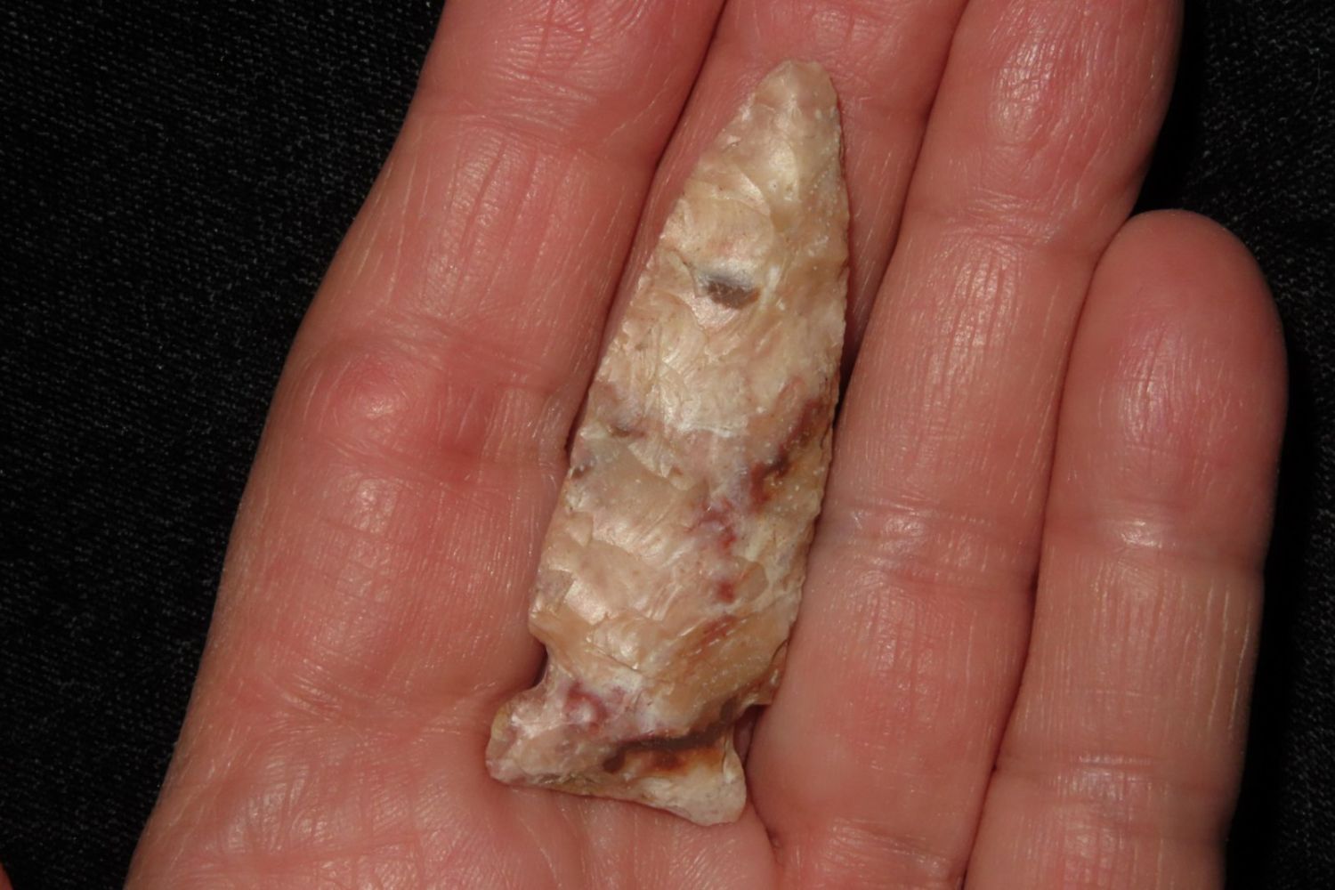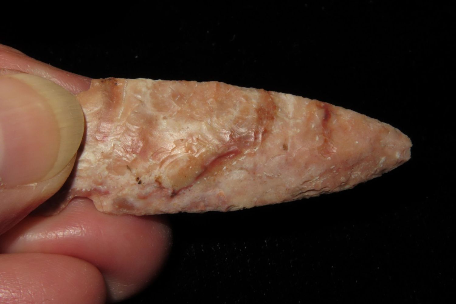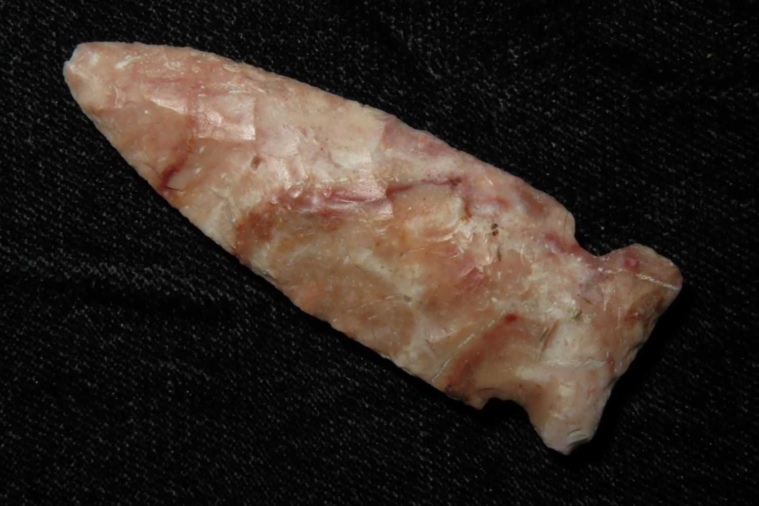 2" Matanzas, creek found and extremely colorful. From the James and Joe George Collection. Joe George was an avid collector and finder of Native American artifacts in the greater St Louis Missouri area. Joe collected his entire life. Upon his passing he turned his collection over to his son James. James was also a very avid collector. He enjoyed walking various waterways and attending artifact shows. James is looking forward to passing down his collection to the relic community for caretaking.