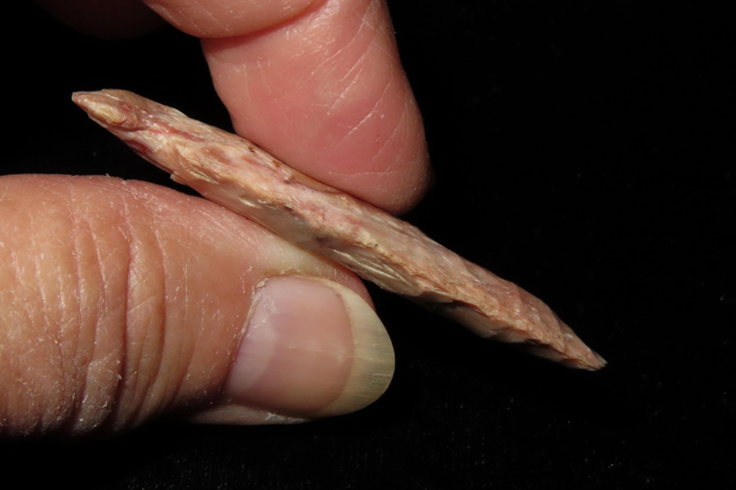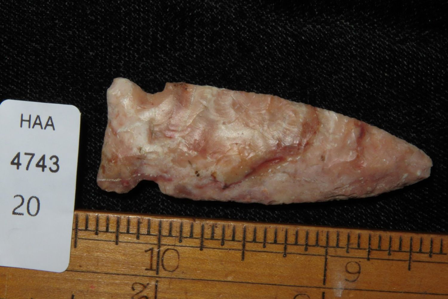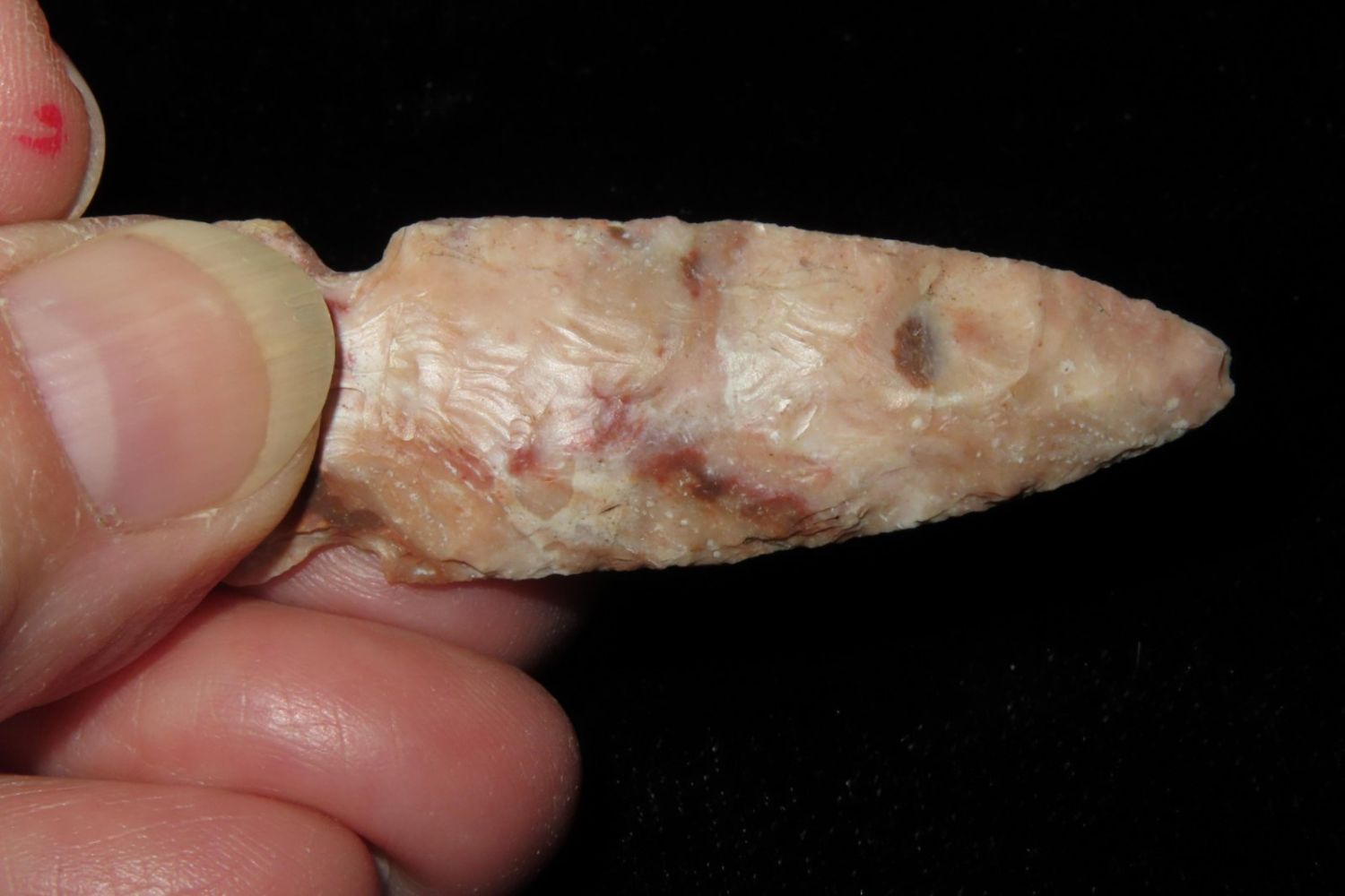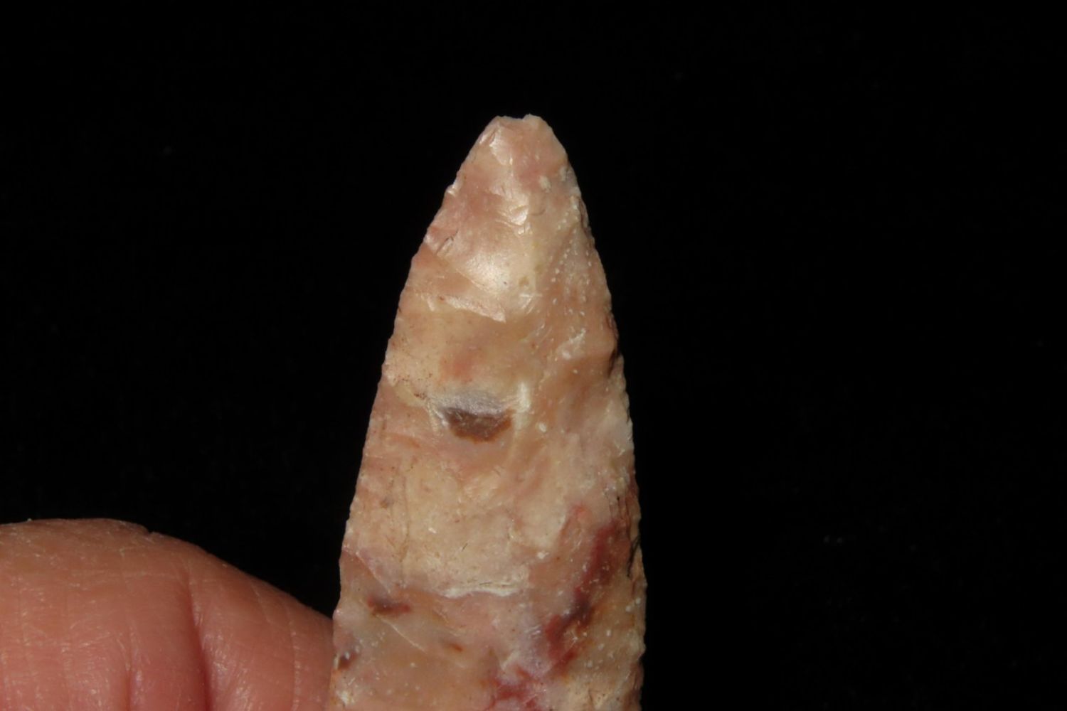 2" Matanzas, creek found and extremely colorful. From the James and Joe George Collection. Joe George was an avid collector and finder of Native American artifacts in the greater St Louis Missouri area. Joe collected his entire life. Upon his passing he turned his collection over to his son James. James was also a very avid collector. He enjoyed walking various waterways and attending artifact shows. James is looking forward to passing down his collection to the relic community for caretaking.
