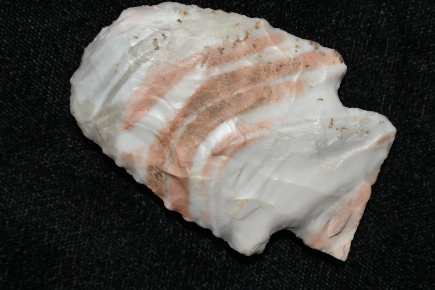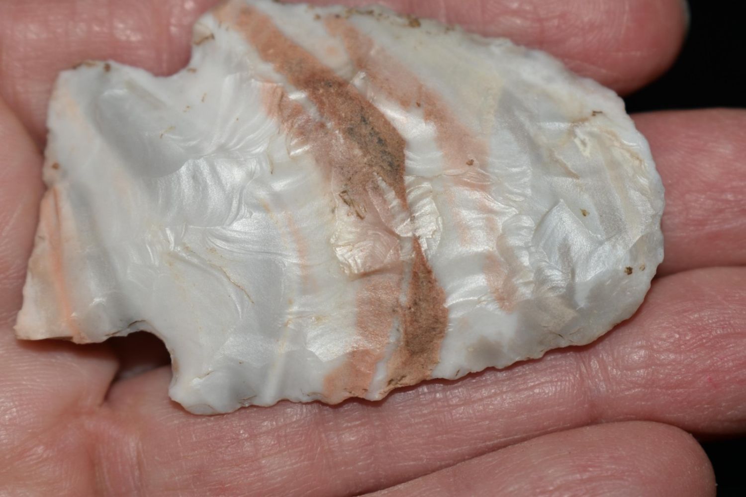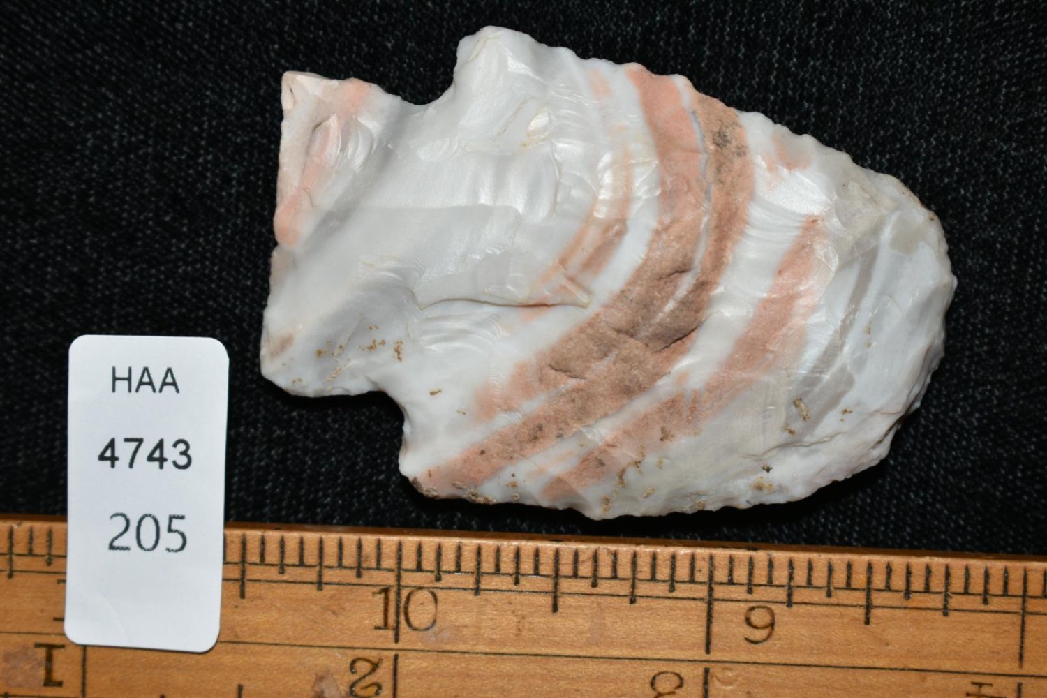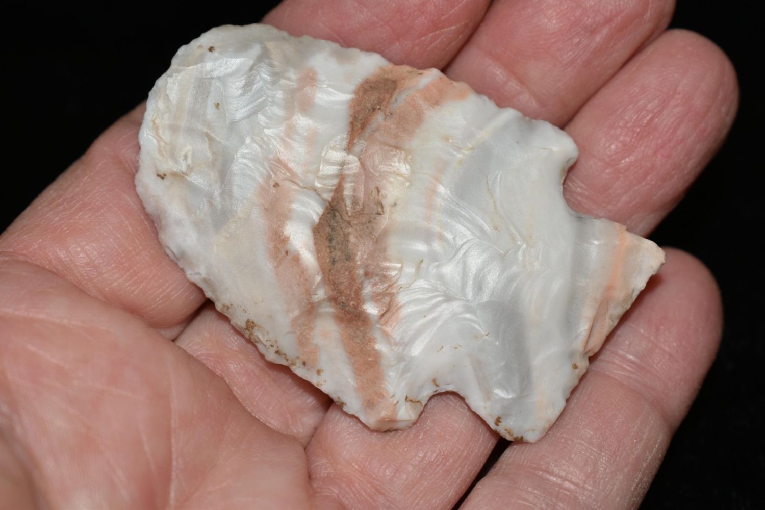 2 1/4" Very Colorful Hafted Scraper. From the James and Joe George Collection. Joe George was an avid collector and finder of Native American artifacts in the greater St Louis Missouri area. Joe collected his entire life. Upon his passing he turned his collection over to his son James. James was also a very avid collector. He enjoyed walking various waterways and attending artifact shows. James is looking forward to passing down his collection to the relic community for caretaking.