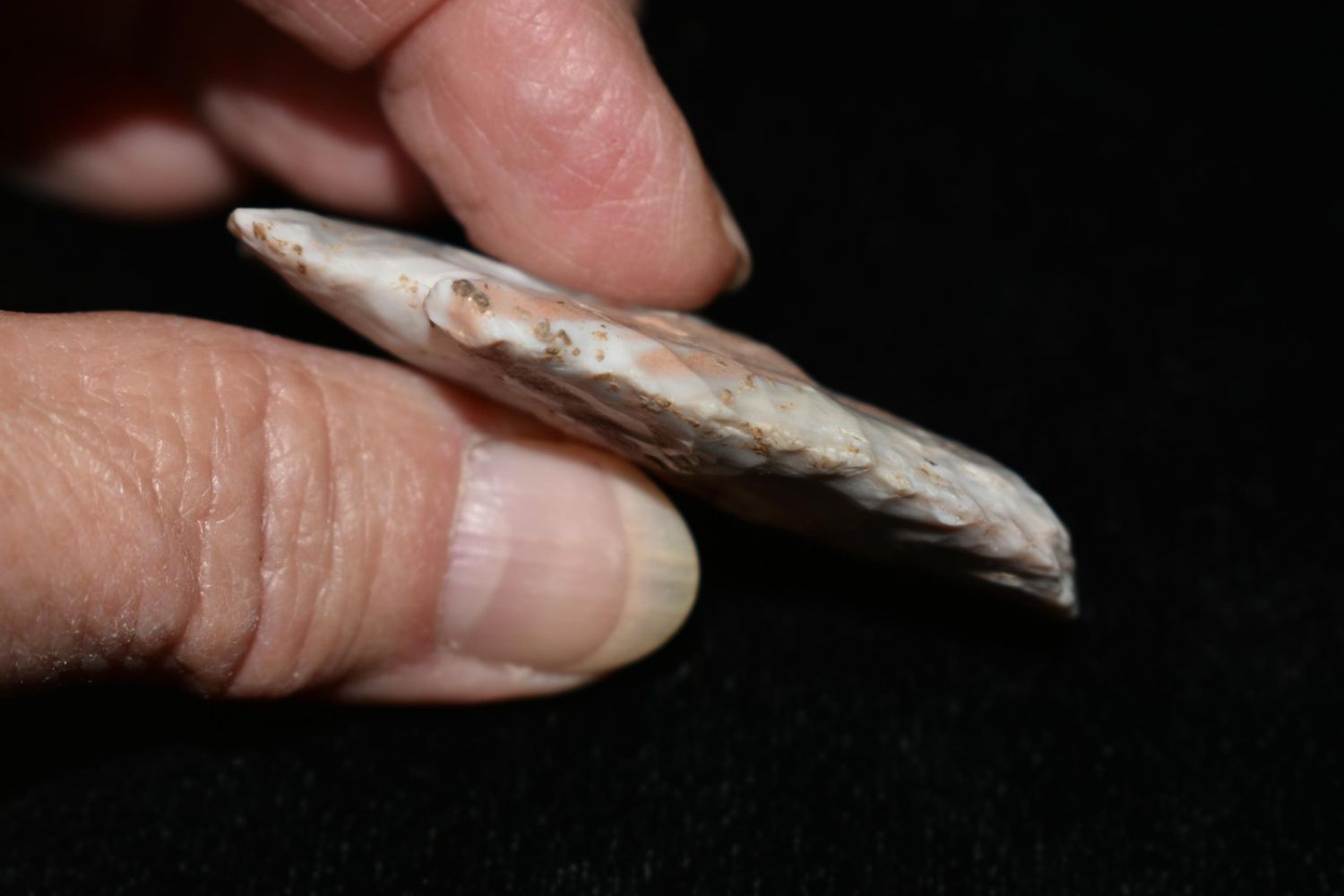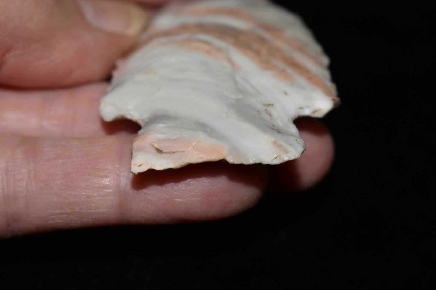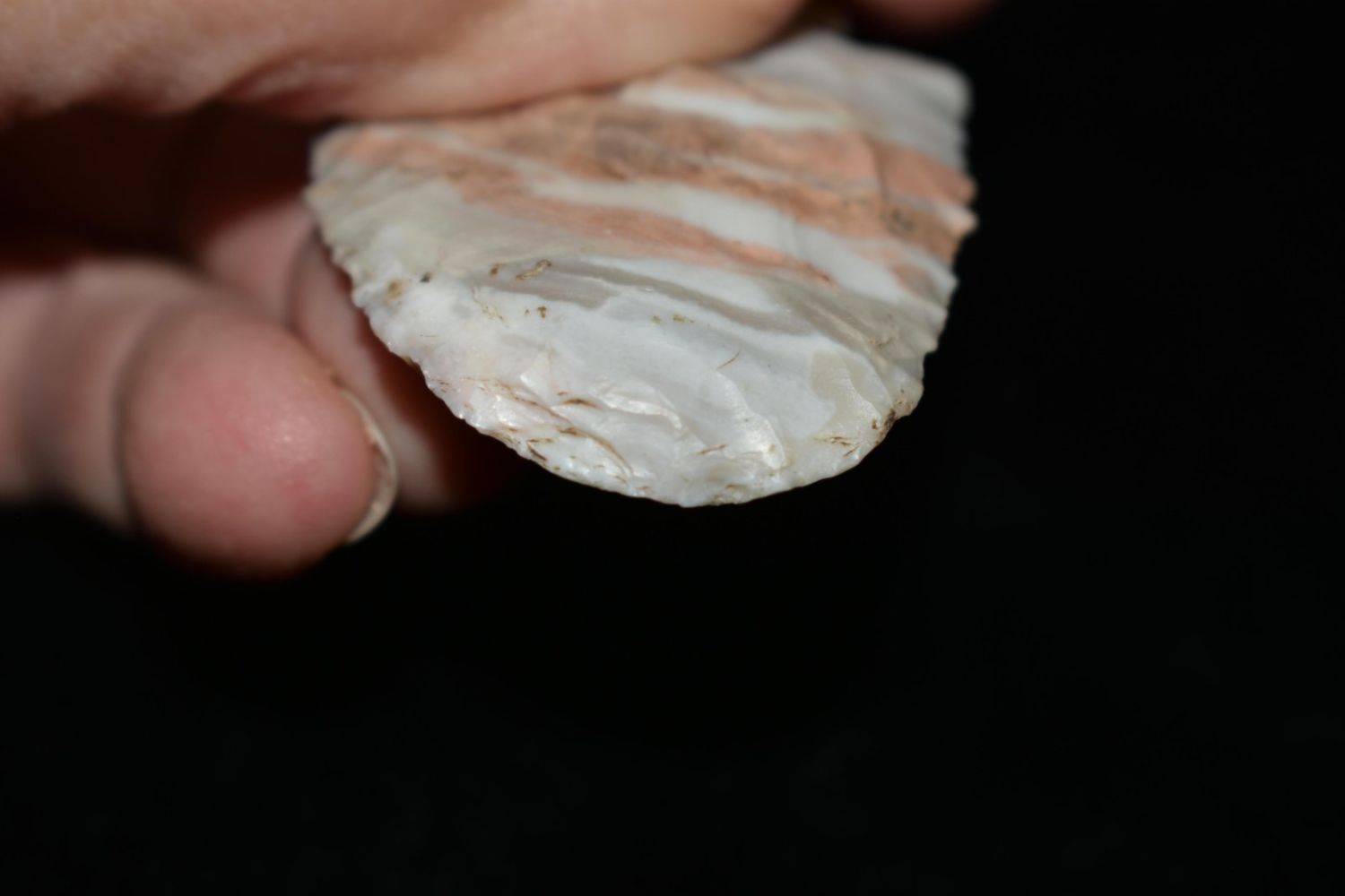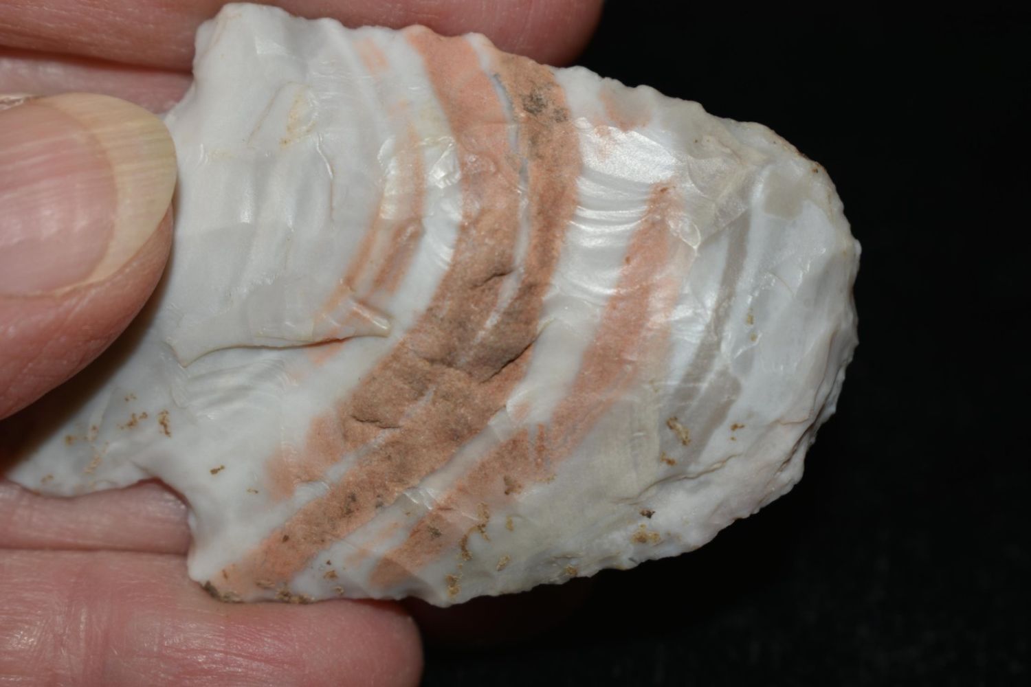 2 1/4" Very Colorful Hafted Scraper. From the James and Joe George Collection. Joe George was an avid collector and finder of Native American artifacts in the greater St Louis Missouri area. Joe collected his entire life. Upon his passing he turned his collection over to his son James. James was also a very avid collector. He enjoyed walking various waterways and attending artifact shows. James is looking forward to passing down his collection to the relic community for caretaking.