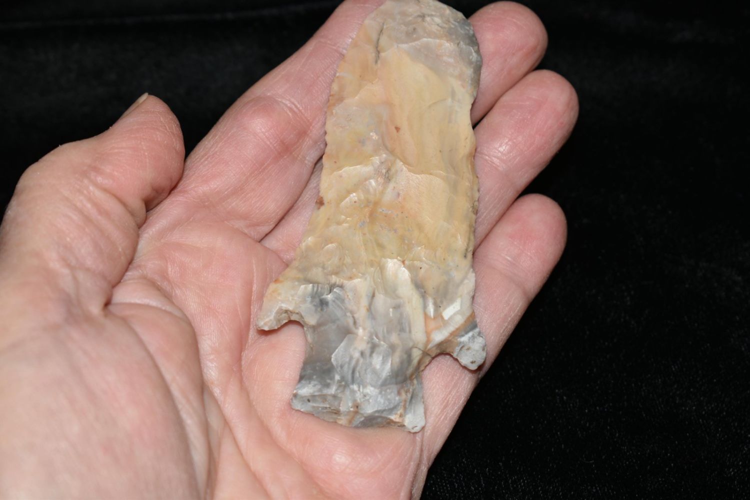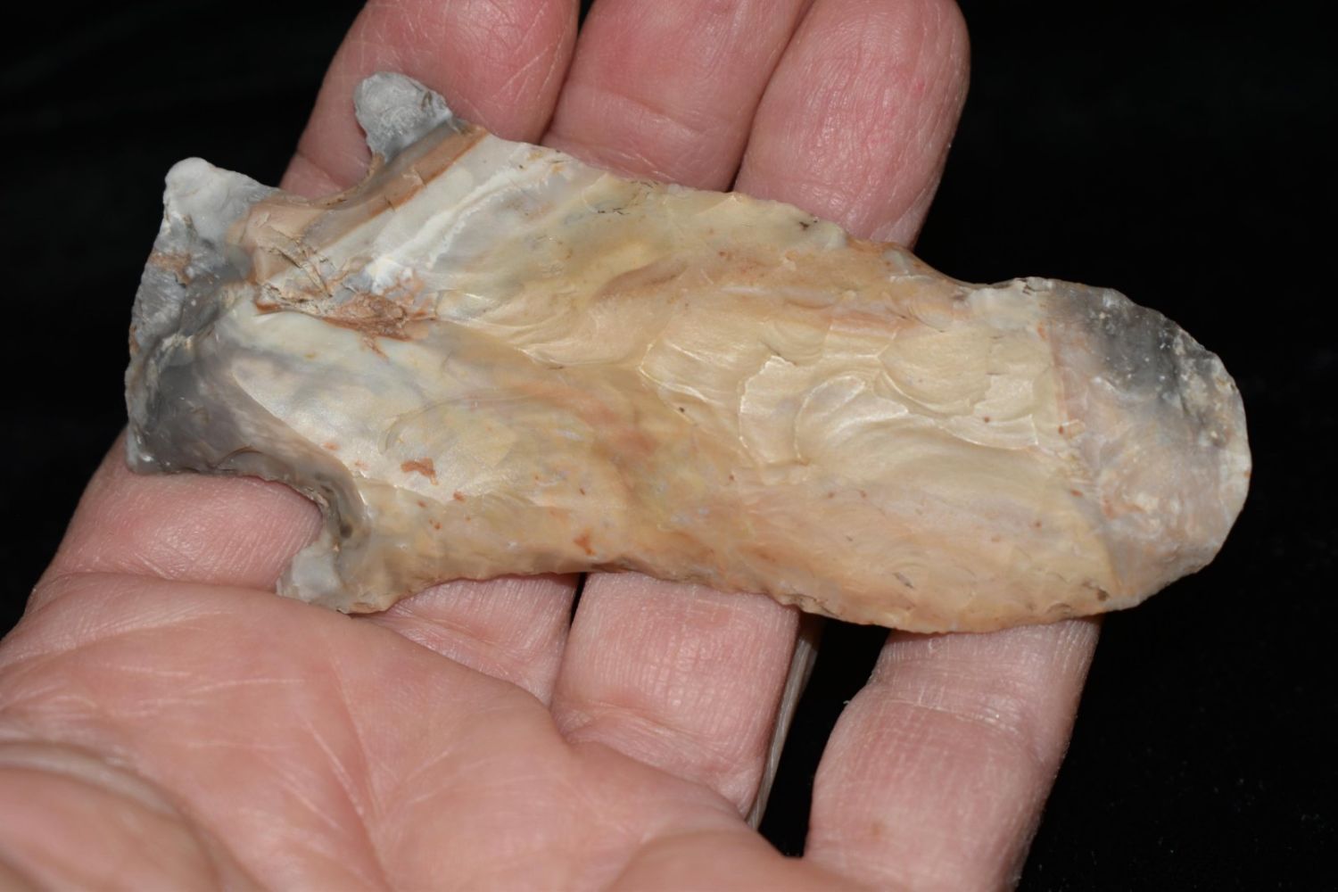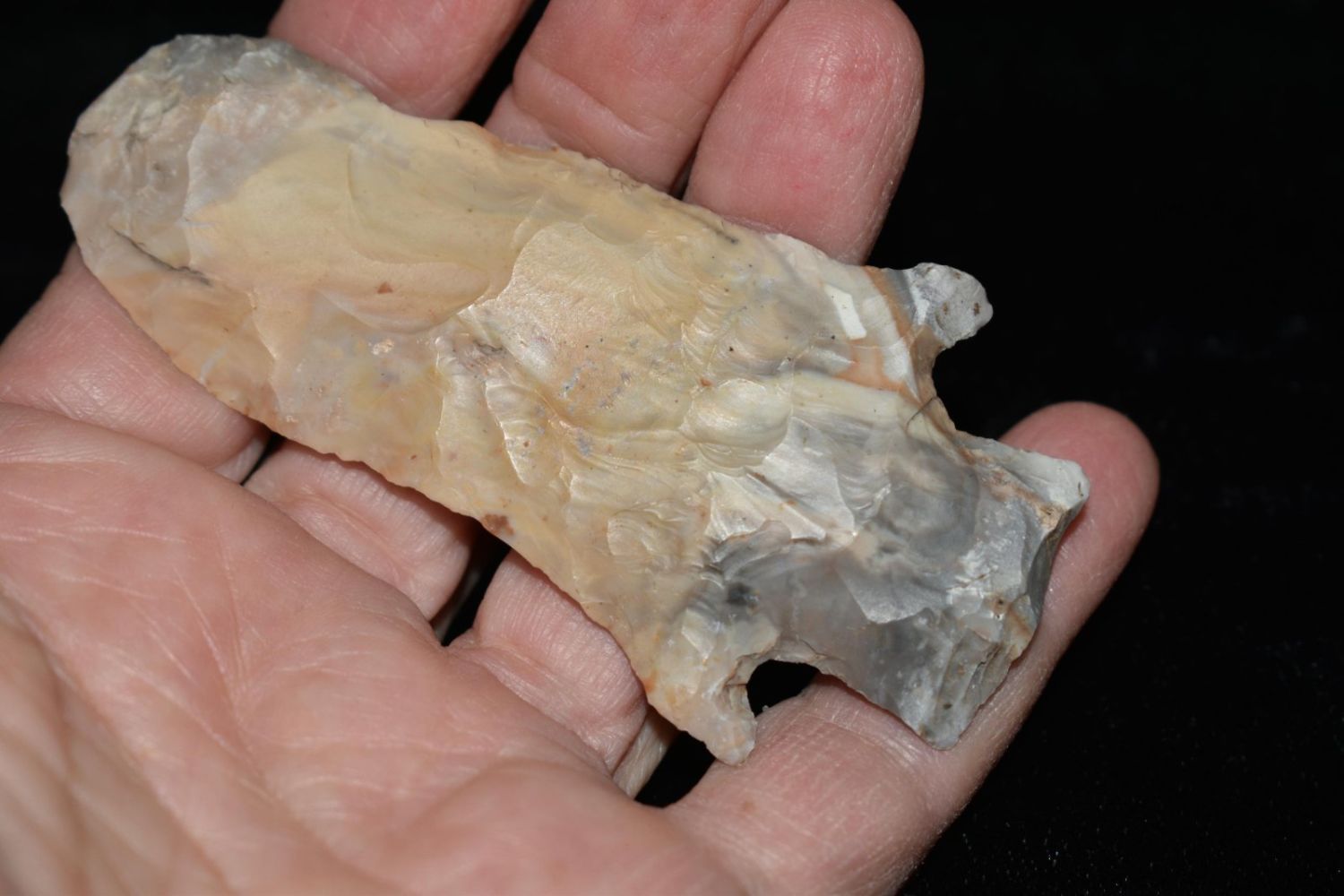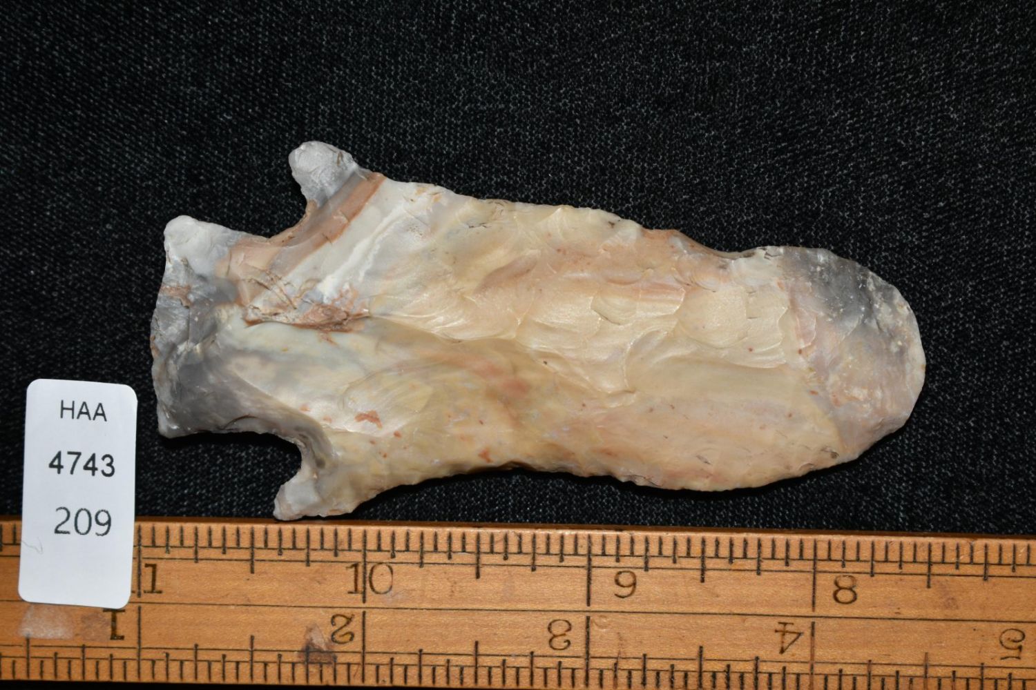 3 3/8" Etley. From the James and Joe George Collection. Joe George was an avid collector and finder of Native American artifacts in the greater St Louis Missouri area. Joe collected his entire life. Upon his passing he turned his collection over to his son James. James was also a very avid collector. He enjoyed walking various waterways and attending artifact shows. James is looking forward to passing down his collection to the relic community for caretaking.