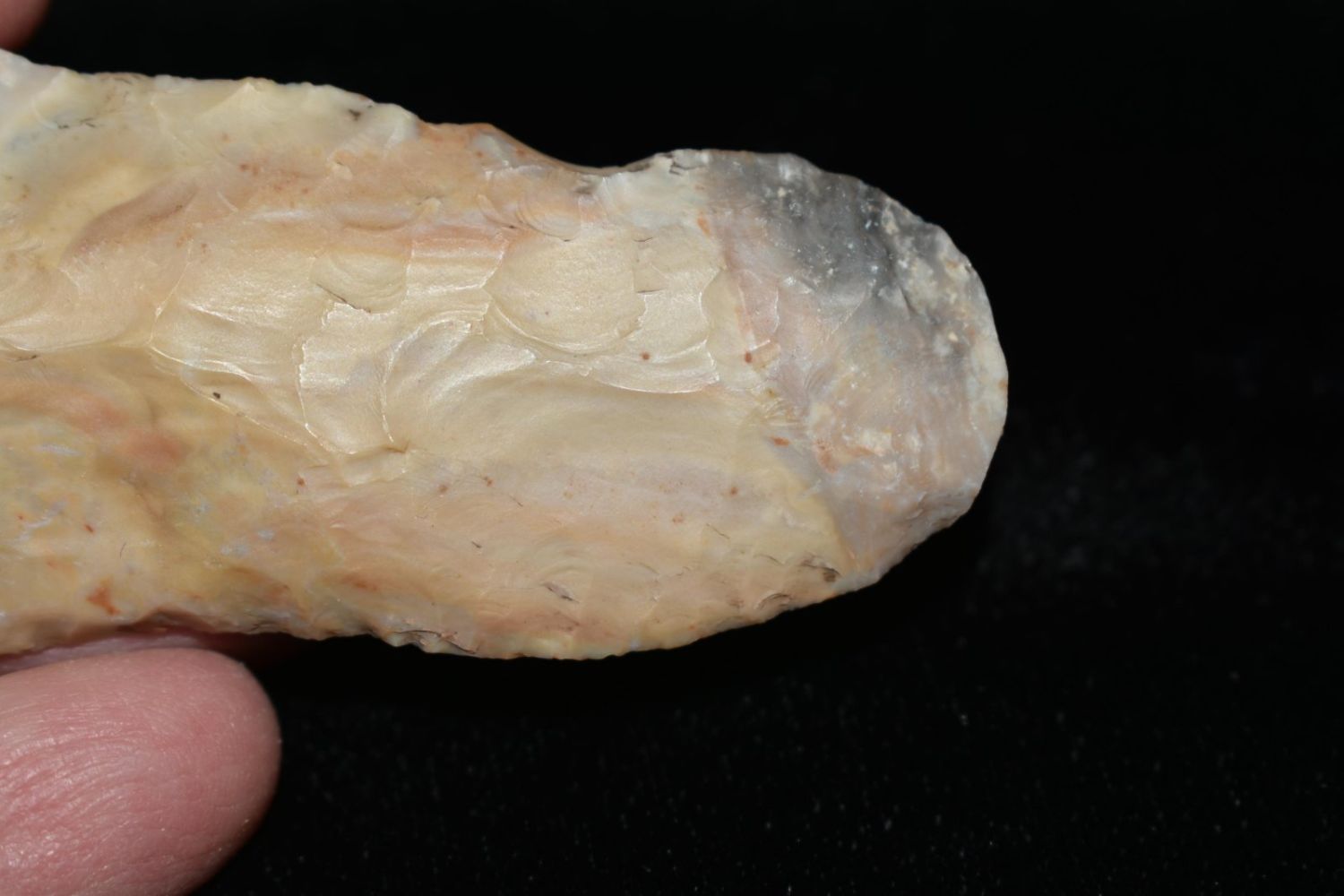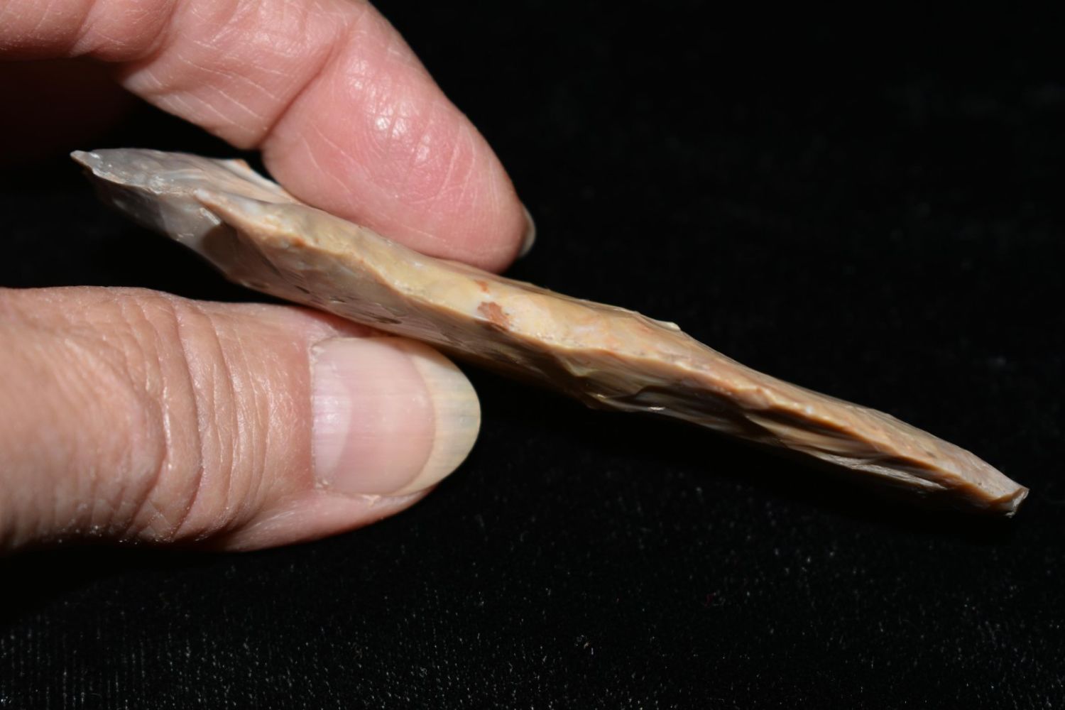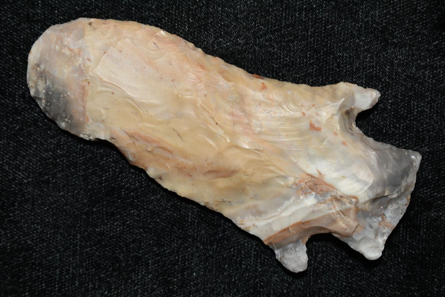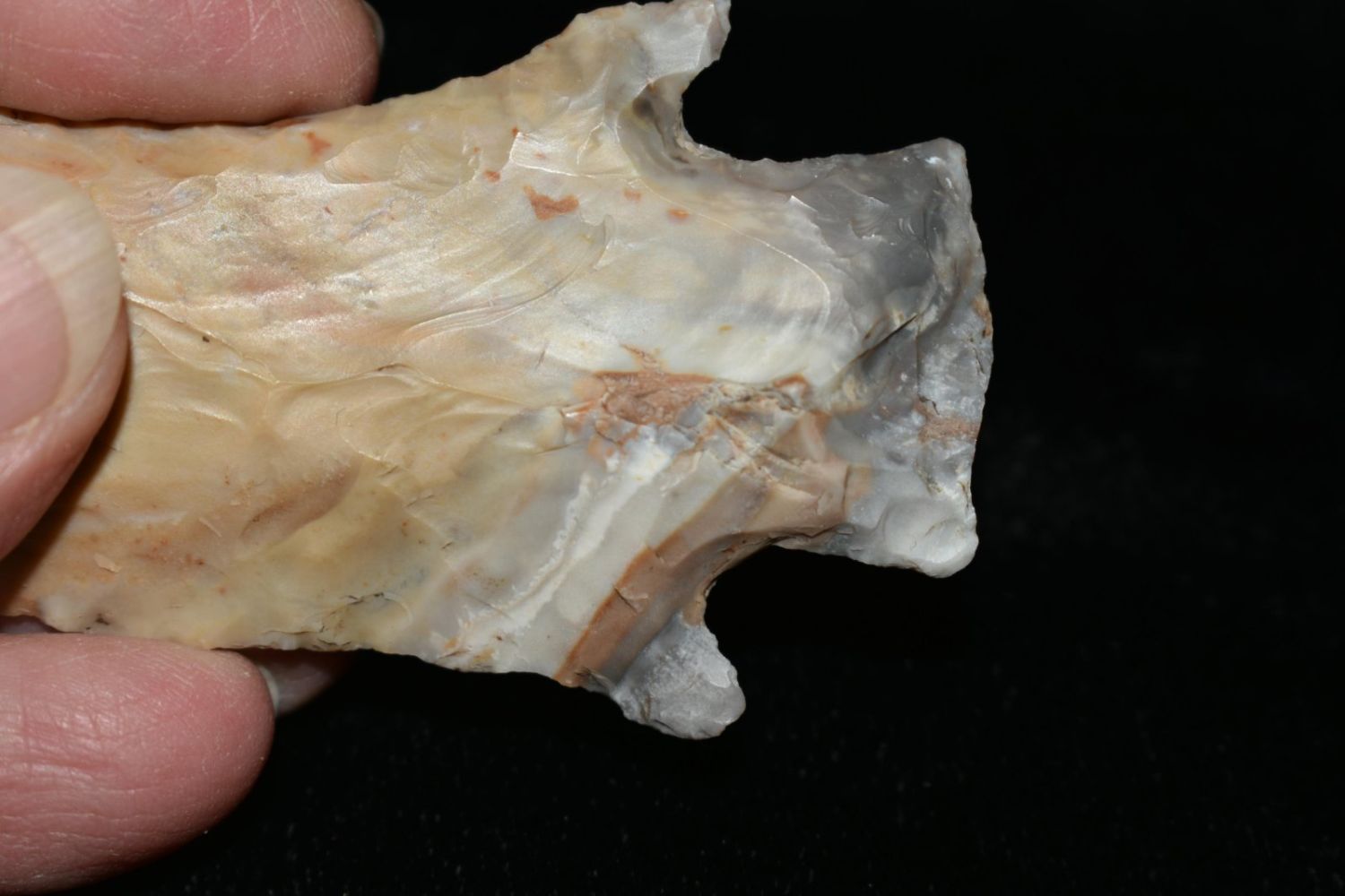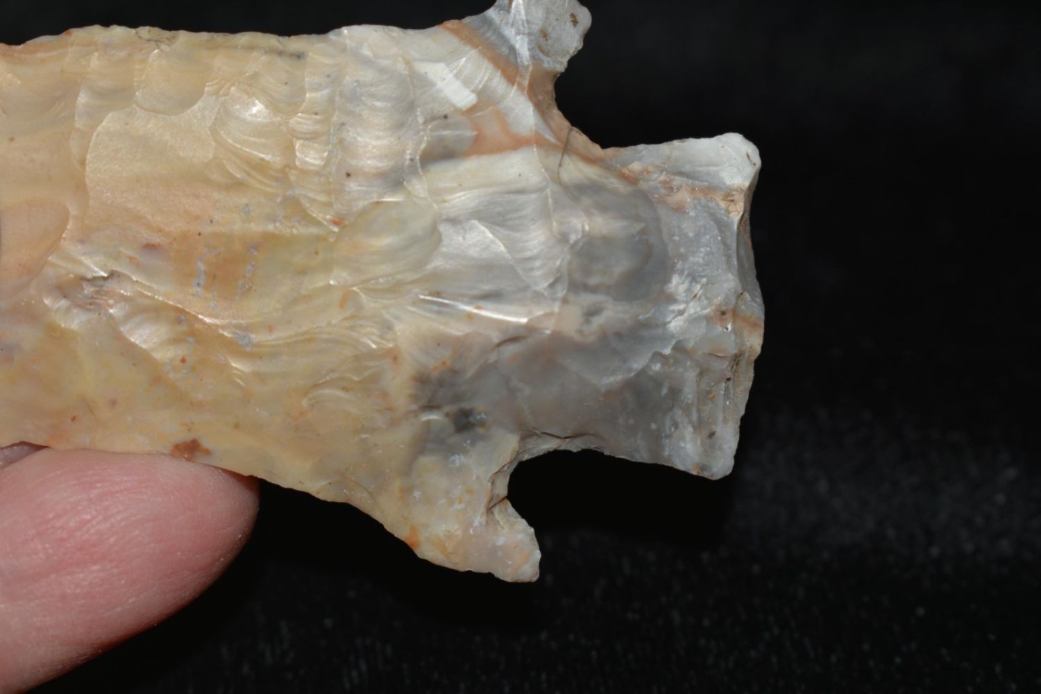 3 3/8" Etley. From the James and Joe George Collection. Joe George was an avid collector and finder of Native American artifacts in the greater St Louis Missouri area. Joe collected his entire life. Upon his passing he turned his collection over to his son James. James was also a very avid collector. He enjoyed walking various waterways and attending artifact shows. James is looking forward to passing down his collection to the relic community for caretaking.