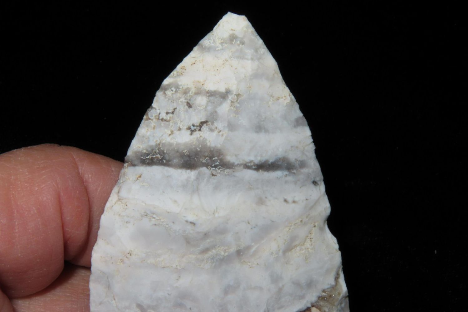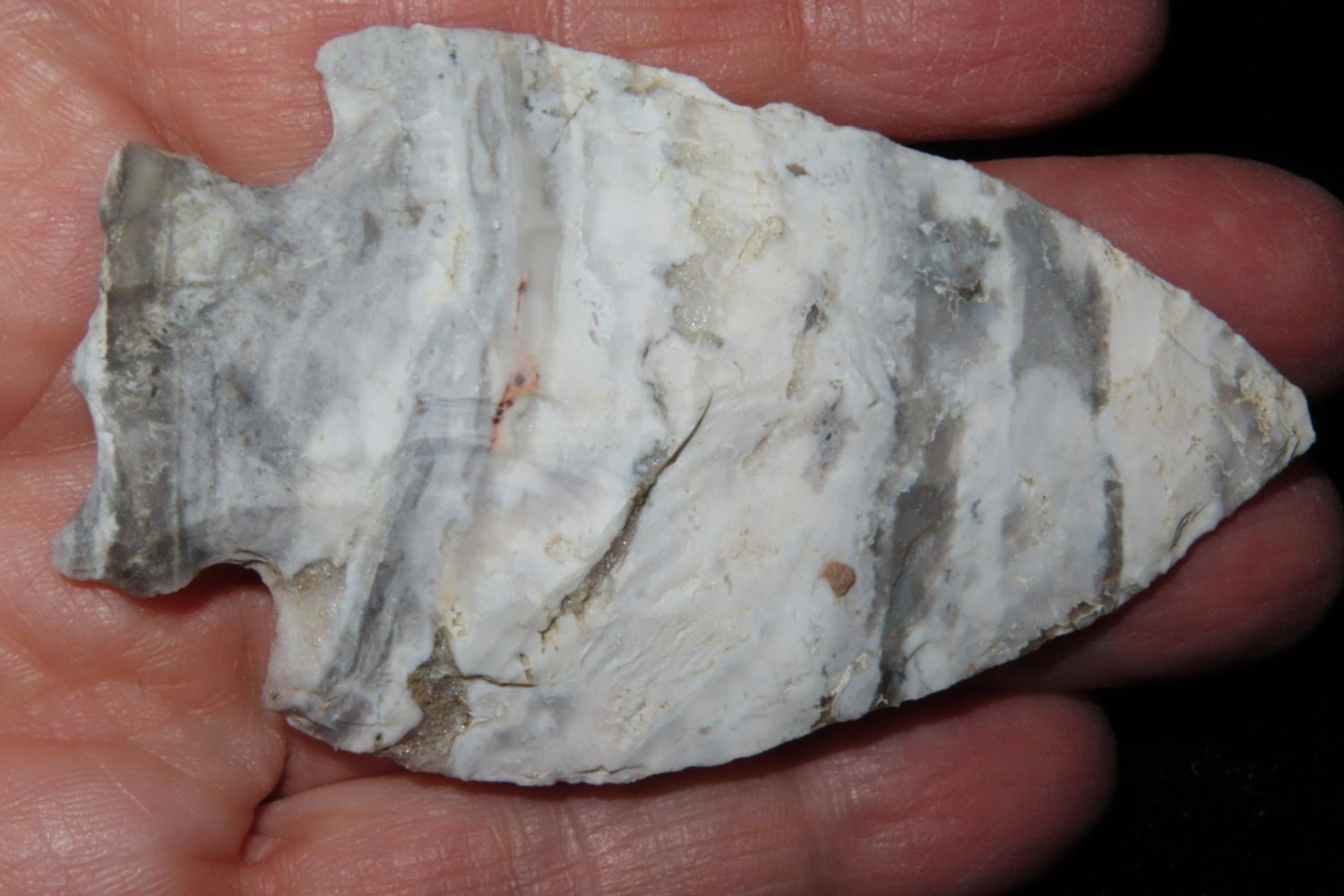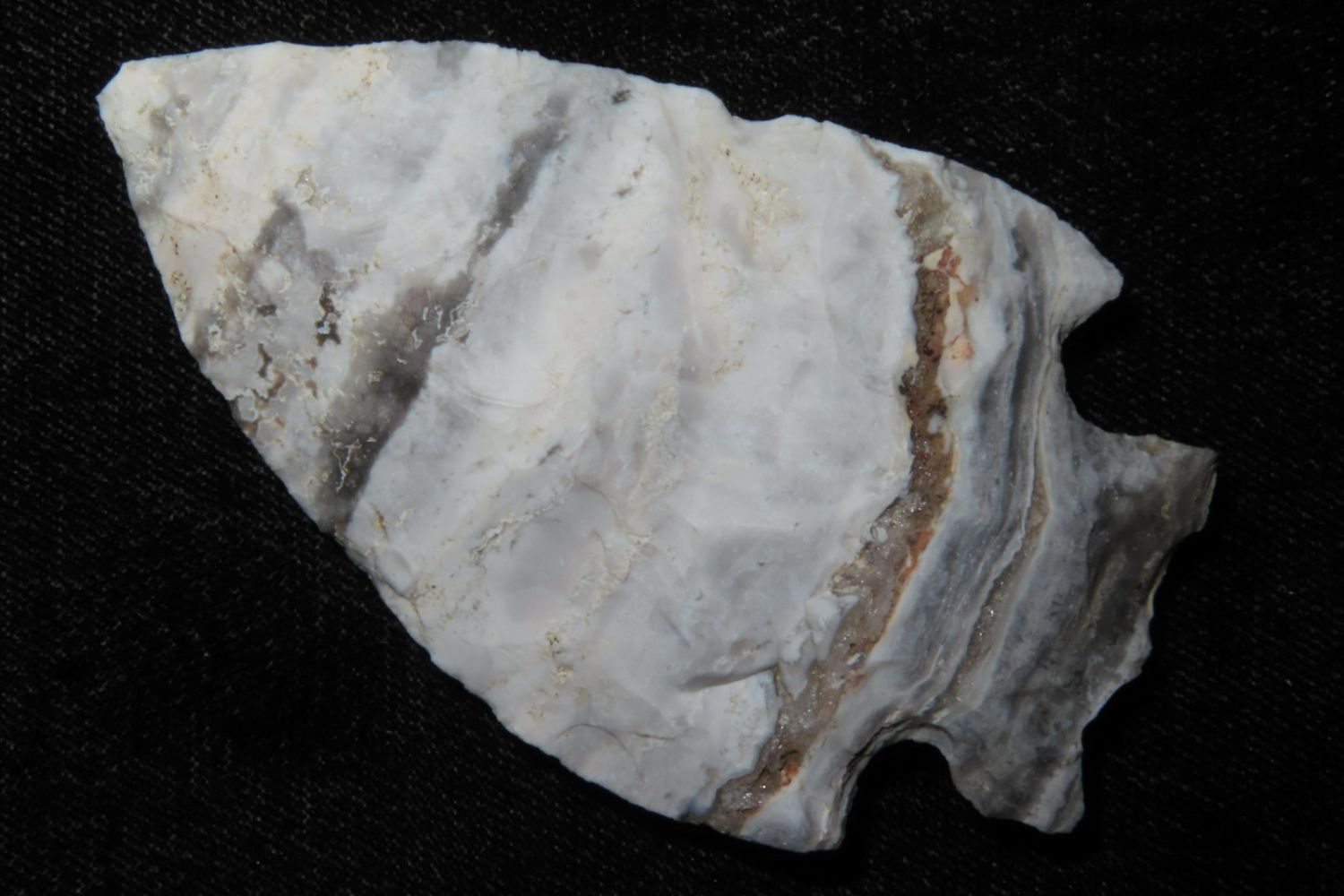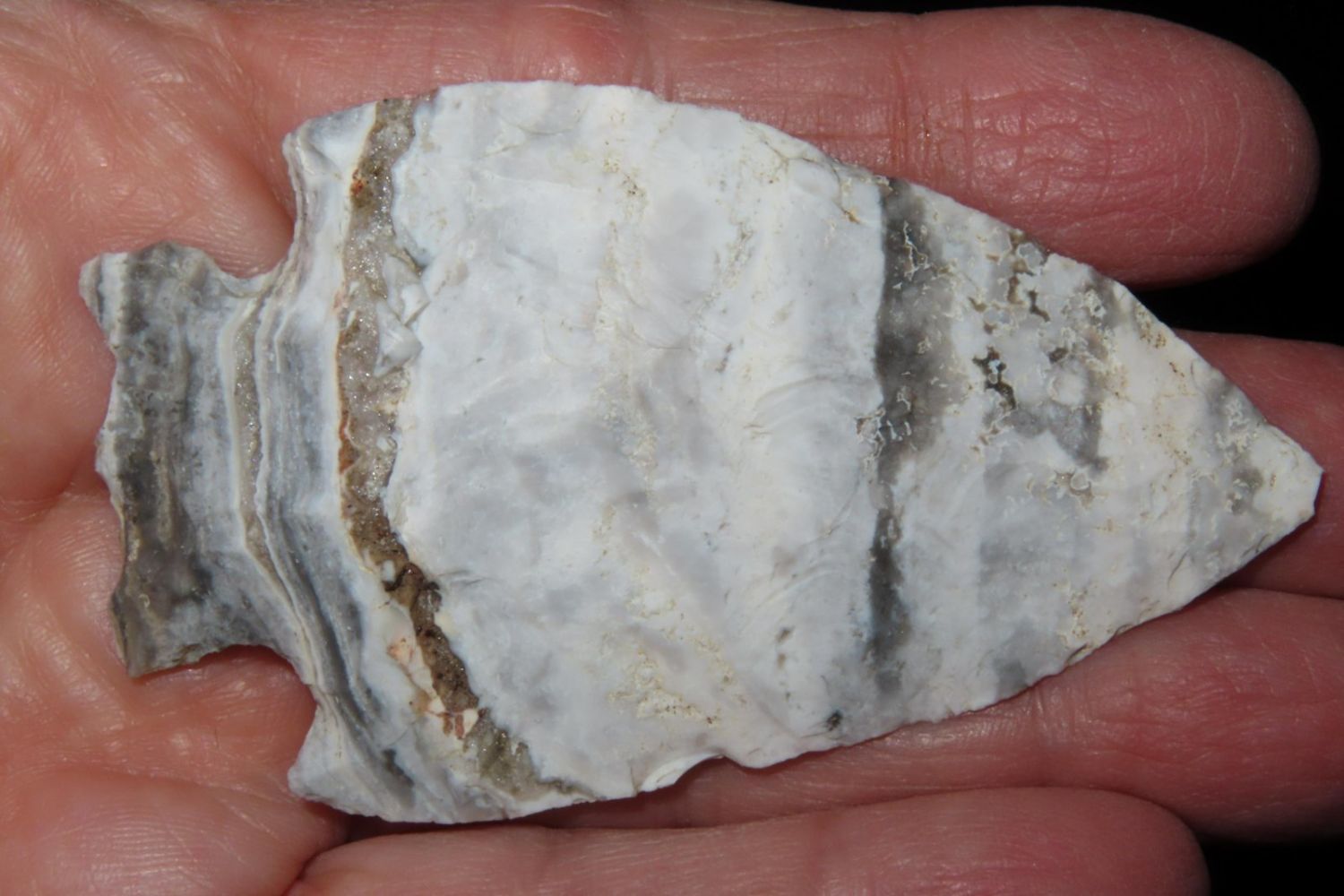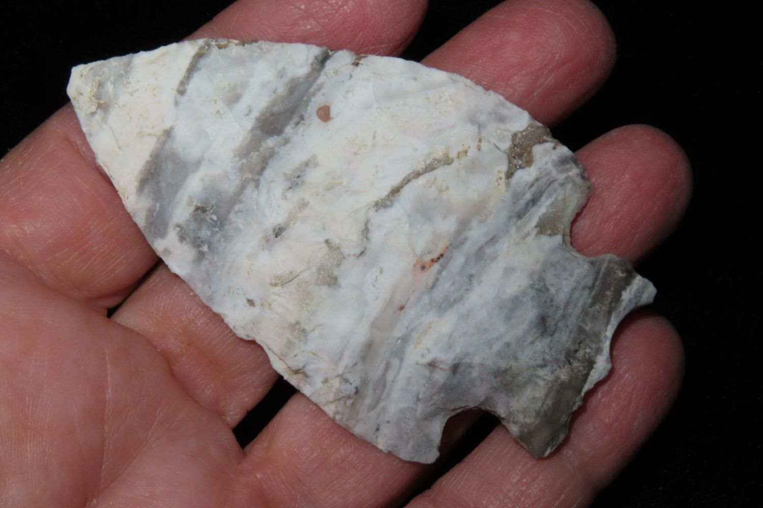 2 7/8" Snyders. Wonderful Mozarkite with geode inclusion. From the James and Joe George Collection. Joe George was an avid collector and finder of Native American artifacts in the greater St Louis Missouri area. Joe collected his entire life. Upon his passing he turned his collection over to his son James. James was also a very avid collector. He enjoyed walking various waterways and attending artifact shows. James is looking forward to passing down his collection to the relic community for caretaking.