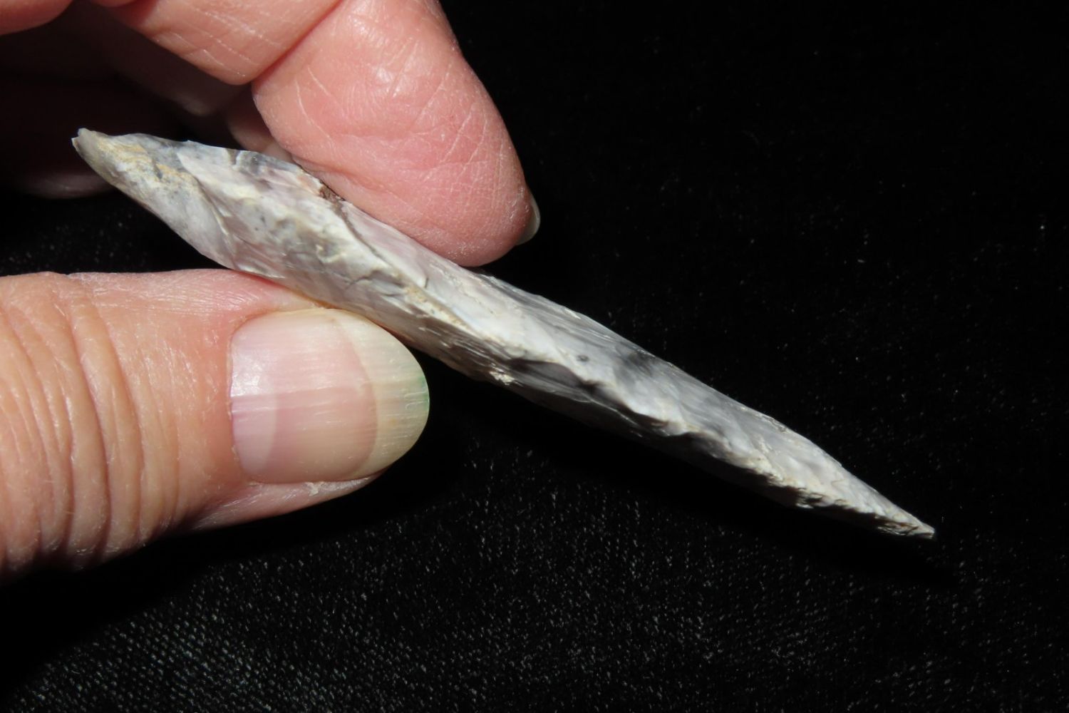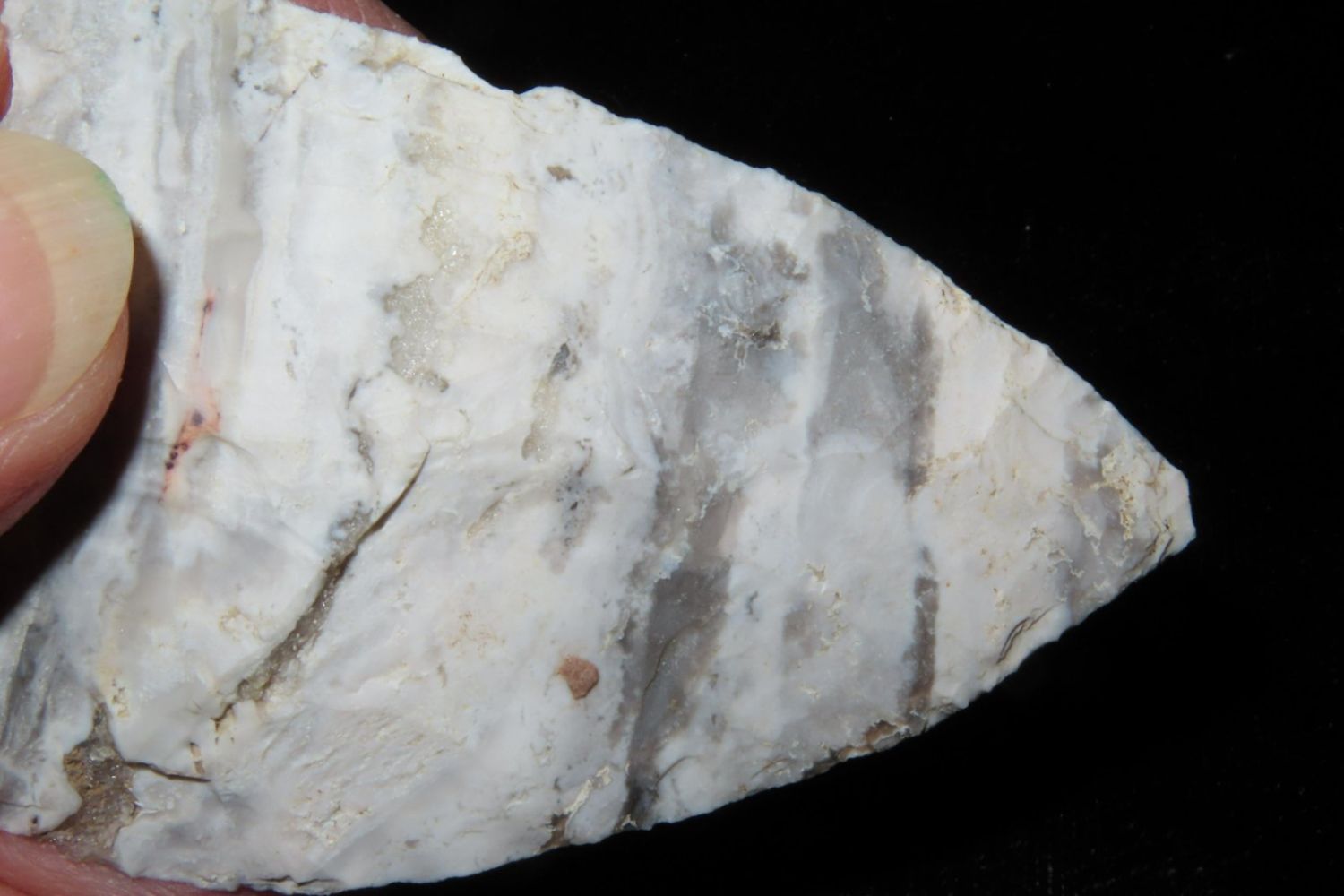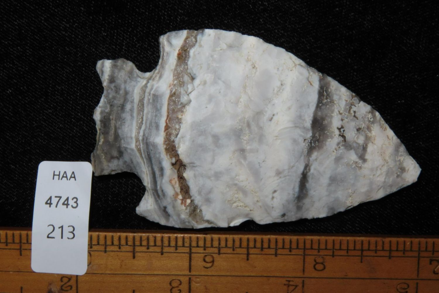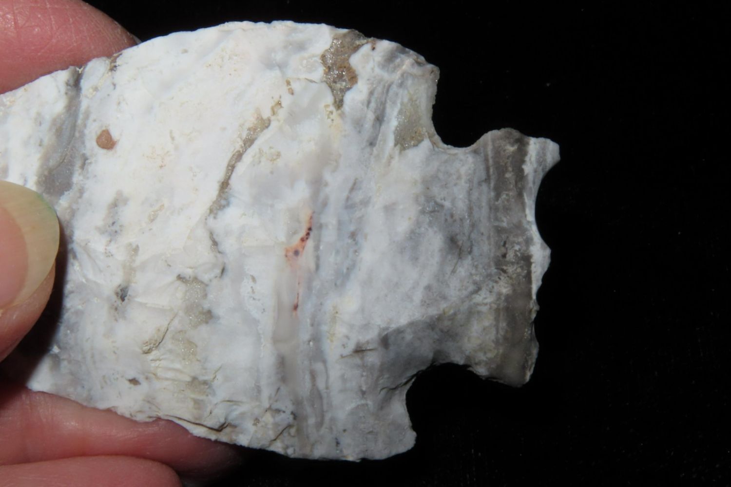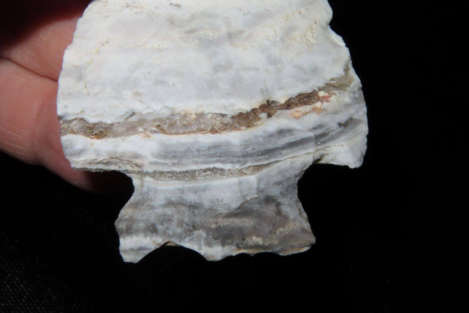 2 7/8" Snyders. Wonderful Mozarkite with geode inclusion. From the James and Joe George Collection. Joe George was an avid collector and finder of Native American artifacts in the greater St Louis Missouri area. Joe collected his entire life. Upon his passing he turned his collection over to his son James. James was also a very avid collector. He enjoyed walking various waterways and attending artifact shows. James is looking forward to passing down his collection to the relic community for caretaking.