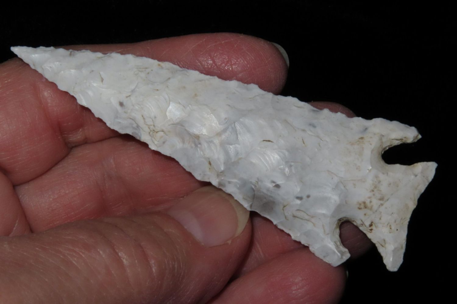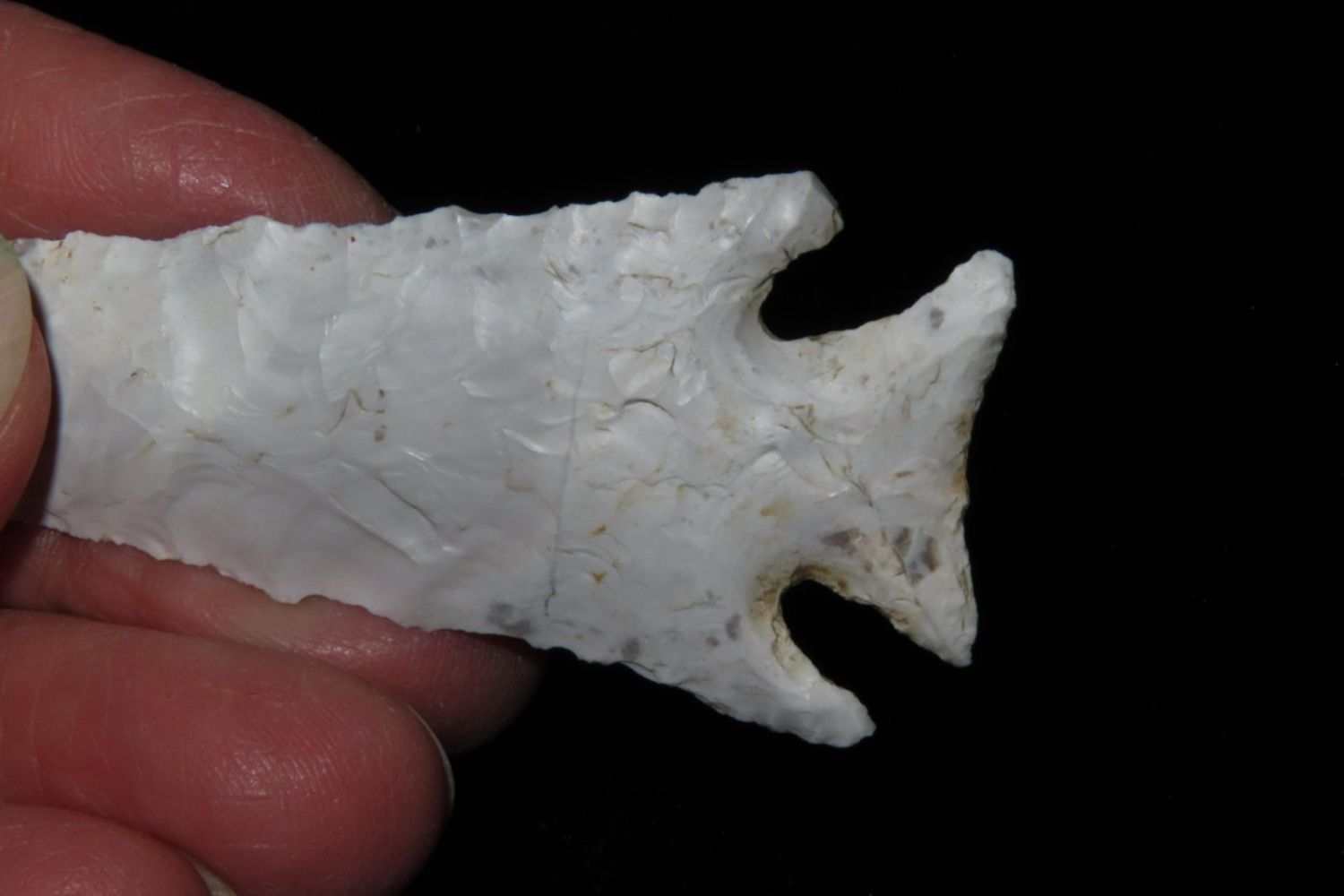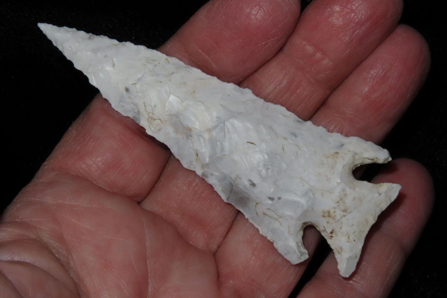 3 1/4" Kings Corner Notch found by Richard Whittle in Miller County, MO. From the James and Joe George Collection. Joe George was an avid collector and finder of Native American artifacts in the greater St Louis Missouri area. Joe collected his entire life. Upon his passing he turned his collection over to his son James. James was also a very avid collector. He enjoyed walking various waterways and attending artifact shows. James is looking forward to passing down his collection to the relic community for caretaking.