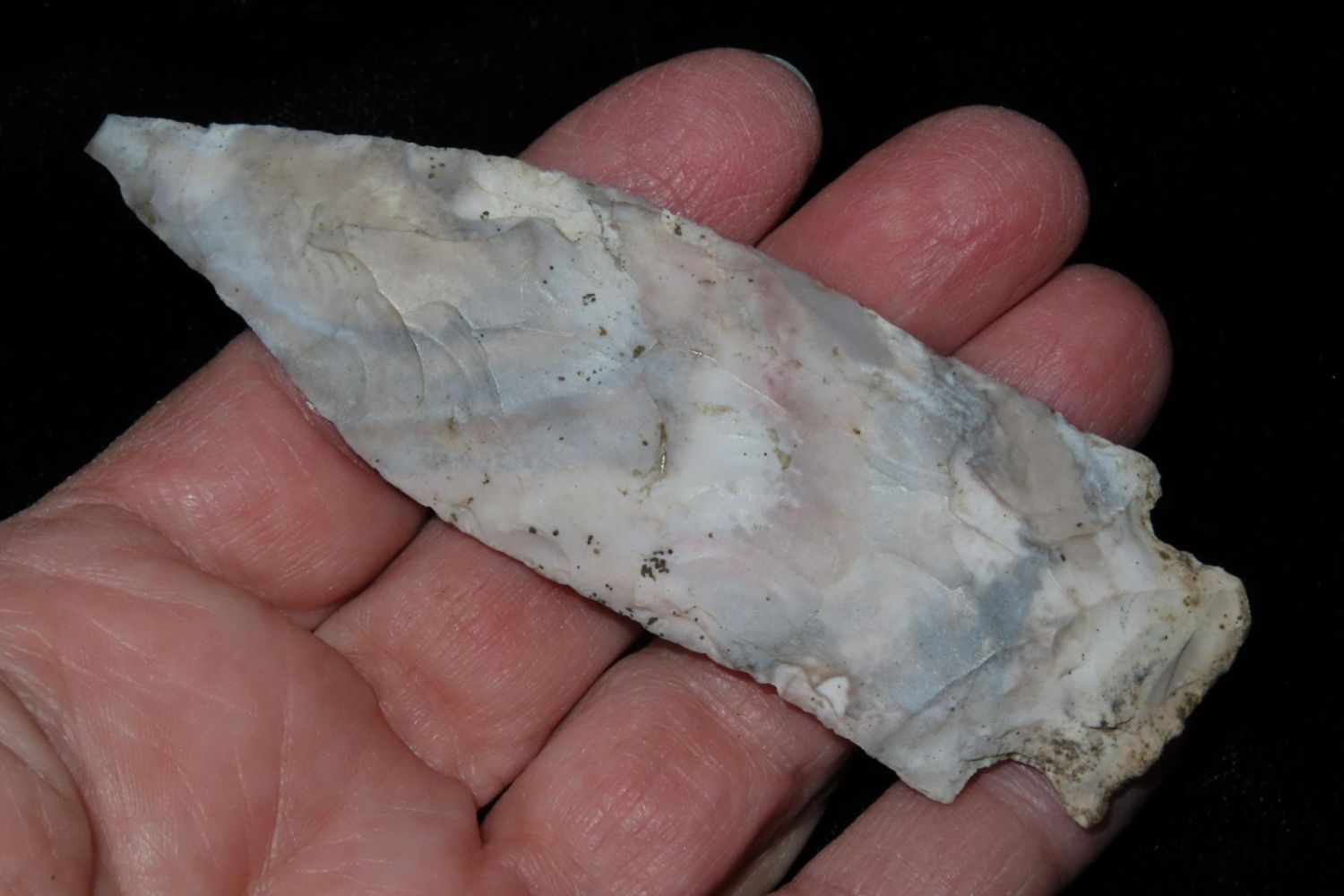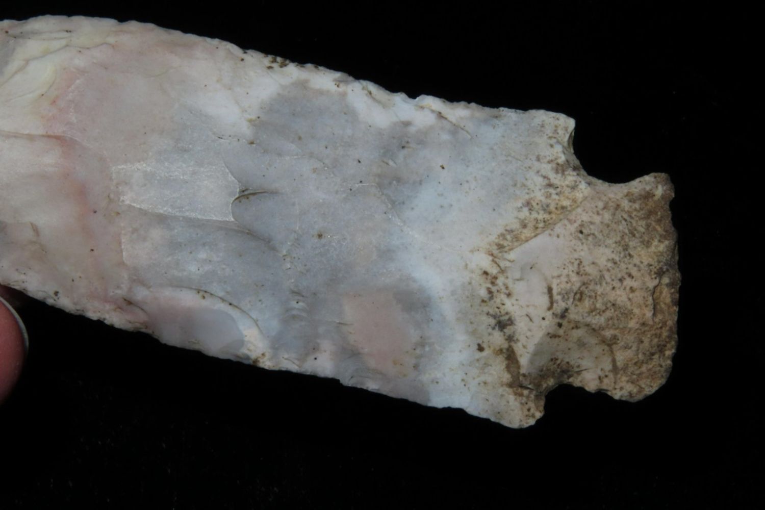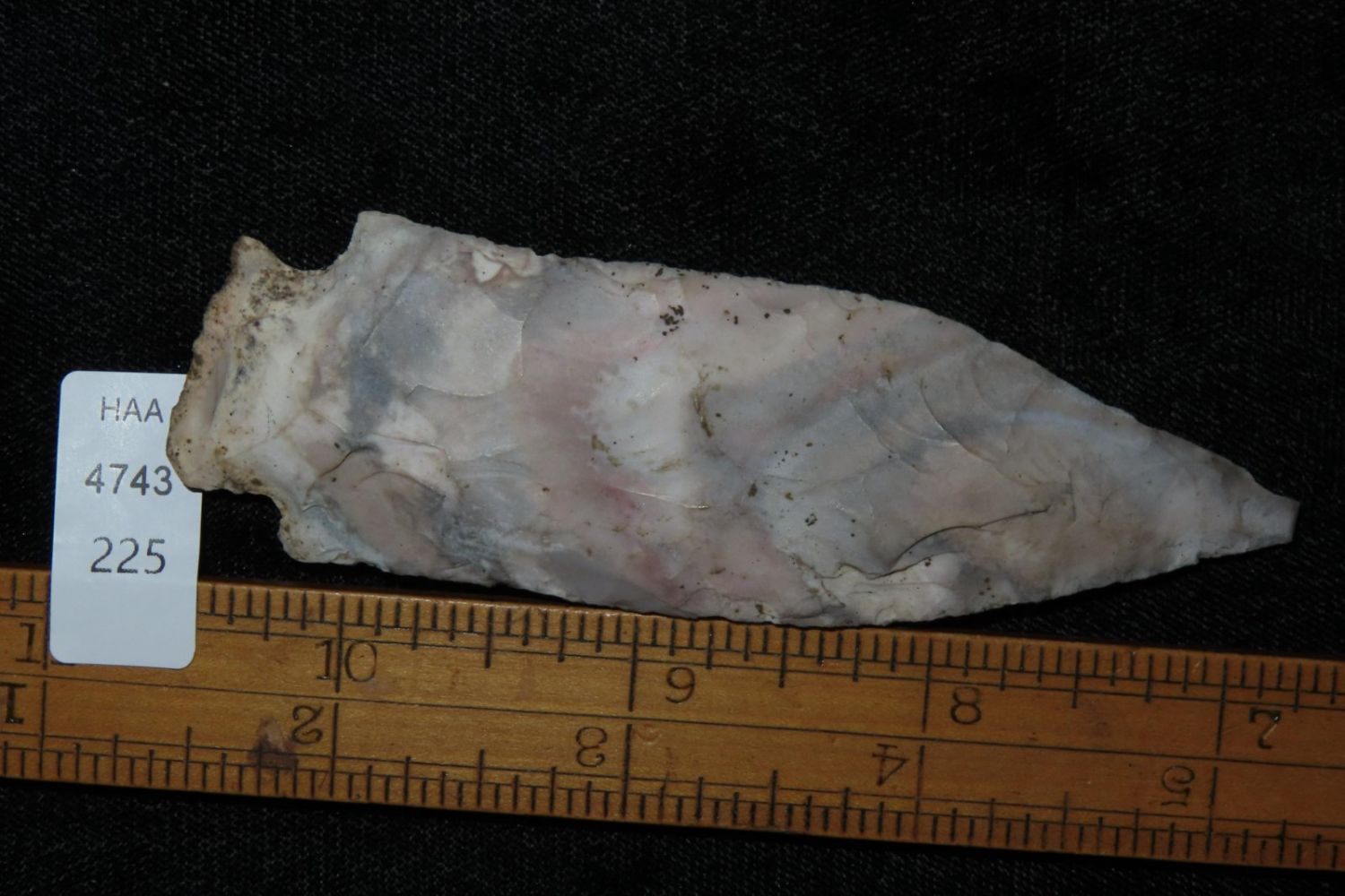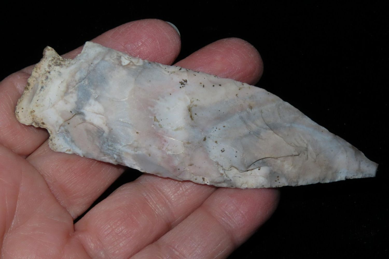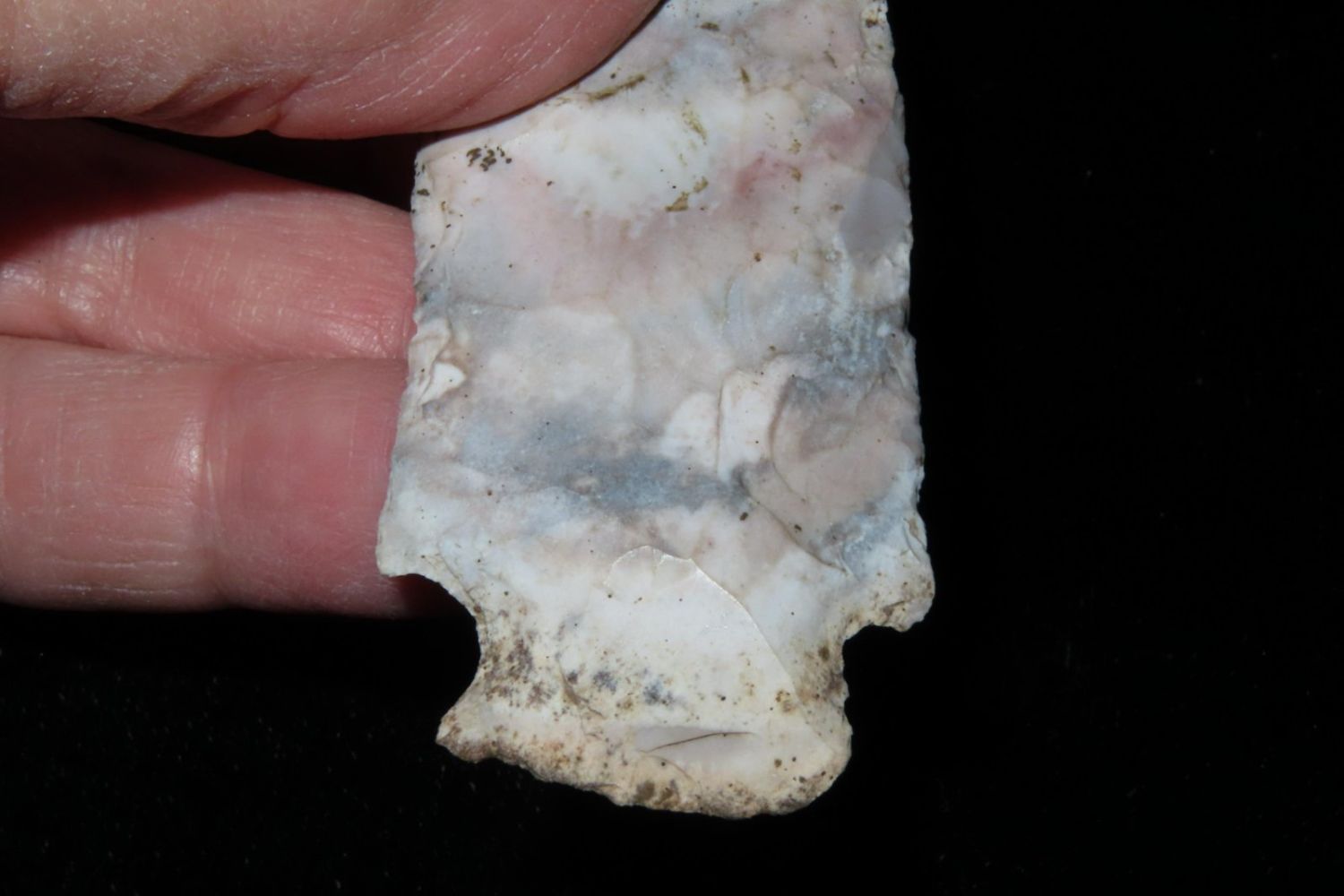 3 7/8" Etley. Multi color Mozarkite. From the James and Joe George Collection. Joe George was an avid collector and finder of Native American artifacts in the greater St Louis Missouri area. Joe collected his entire life. Upon his passing he turned his collection over to his son James. James was also a very avid collector. He enjoyed walking various waterways and attending artifact shows. James is looking forward to passing down his collection to the relic community for caretaking.