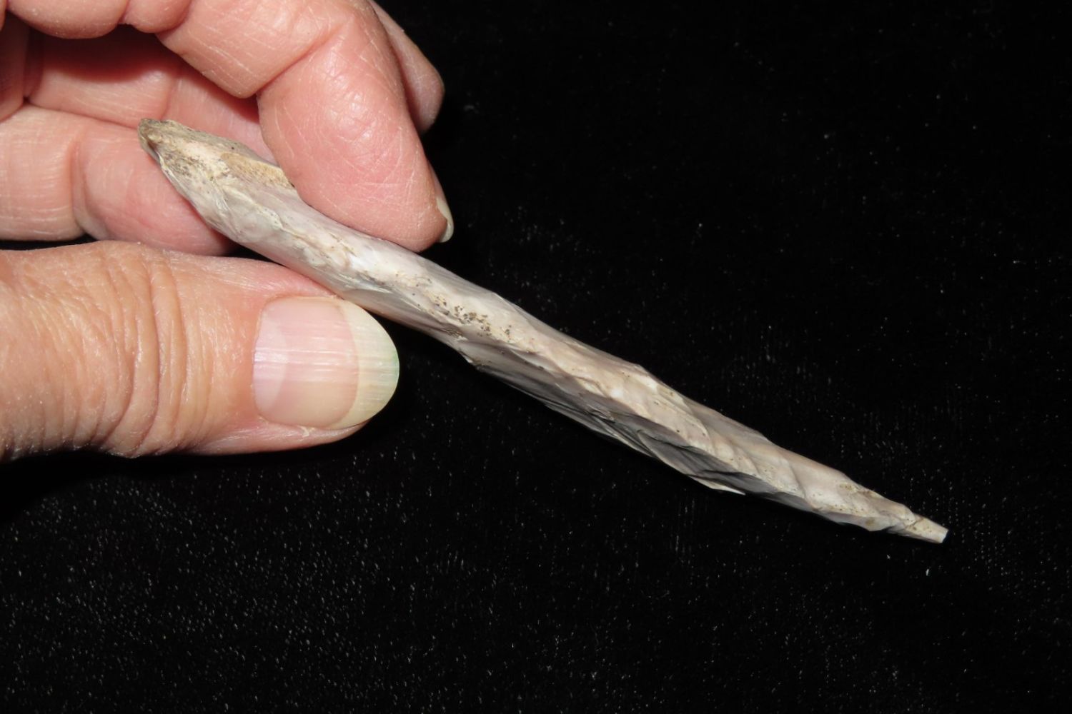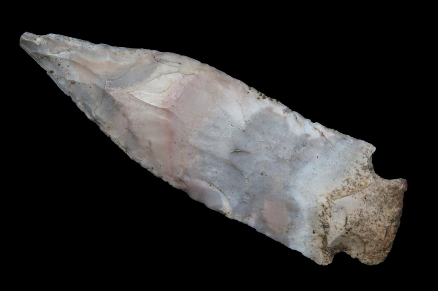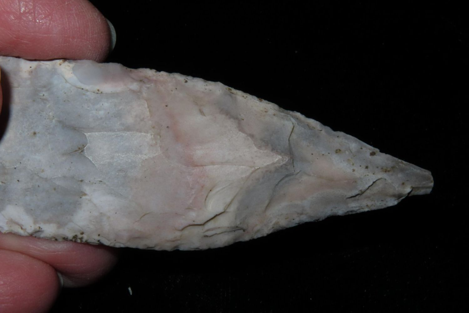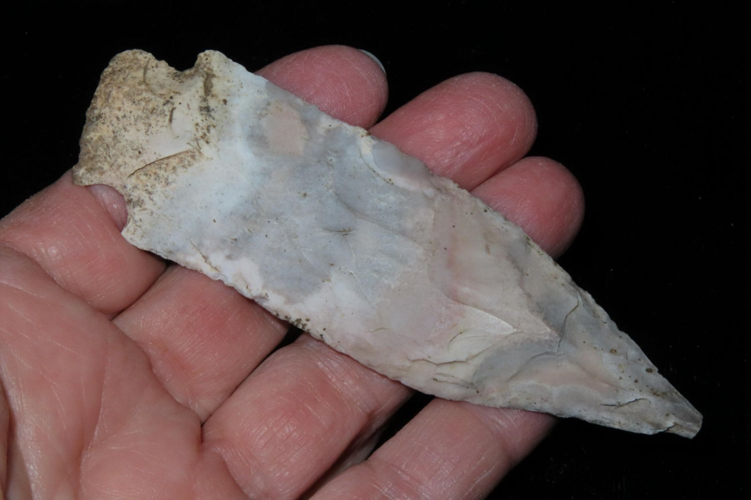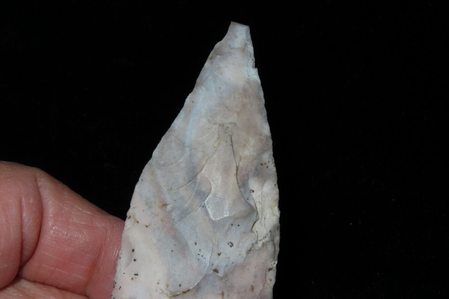 3 7/8" Etley. Multi color Mozarkite. From the James and Joe George Collection. Joe George was an avid collector and finder of Native American artifacts in the greater St Louis Missouri area. Joe collected his entire life. Upon his passing he turned his collection over to his son James. James was also a very avid collector. He enjoyed walking various waterways and attending artifact shows. James is looking forward to passing down his collection to the relic community for caretaking.