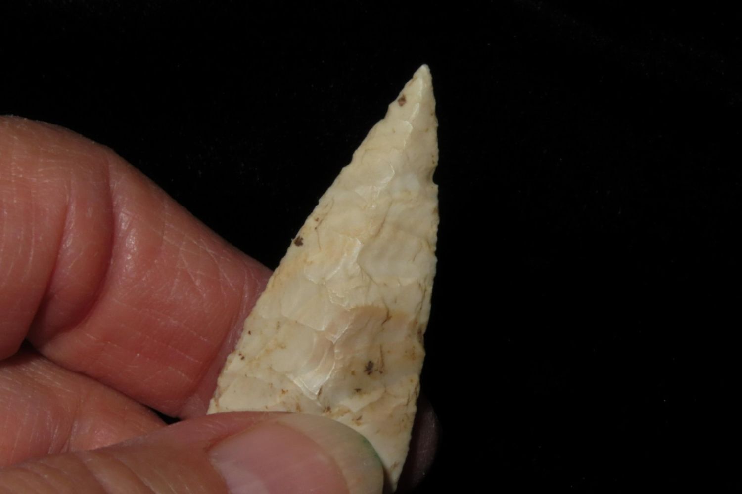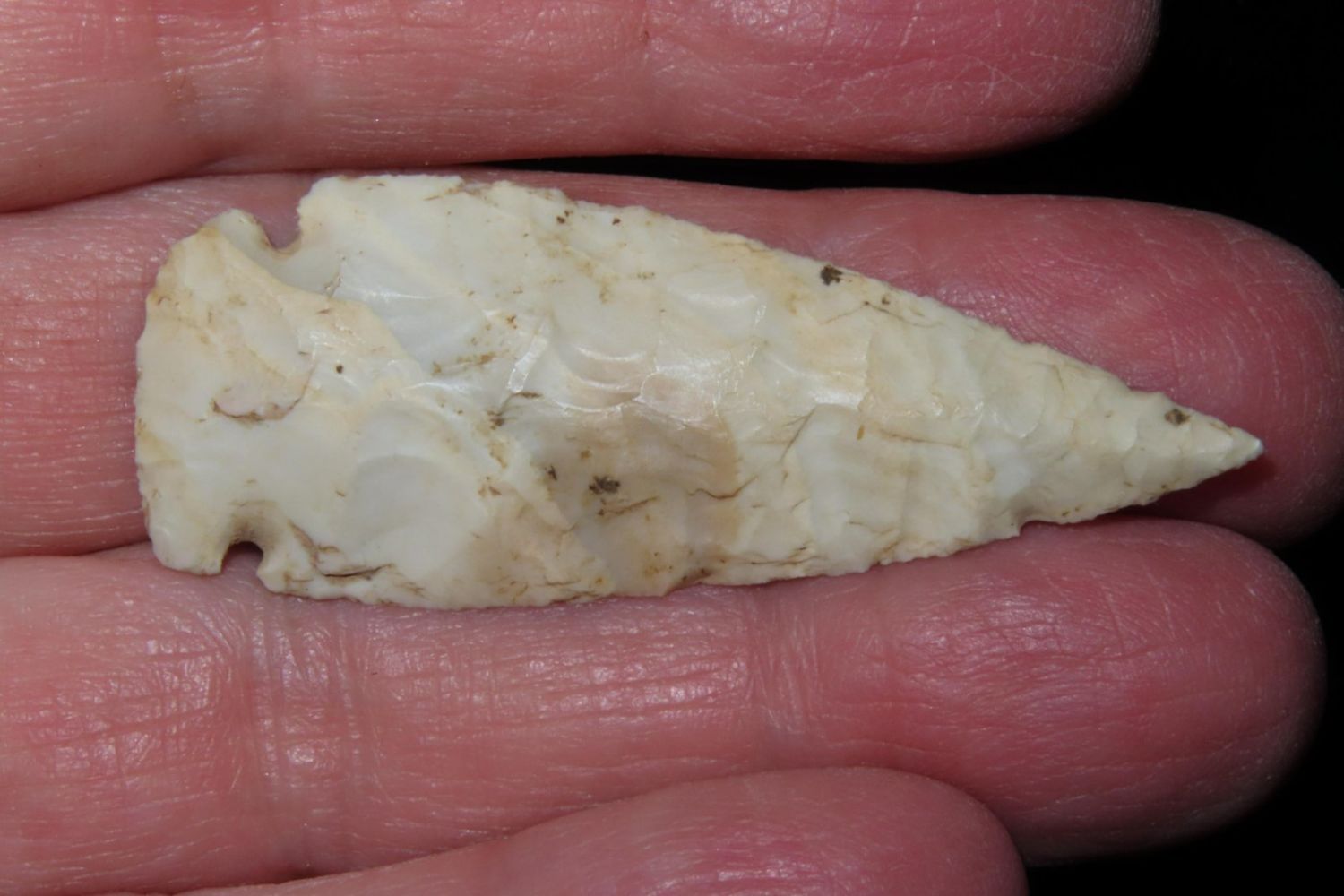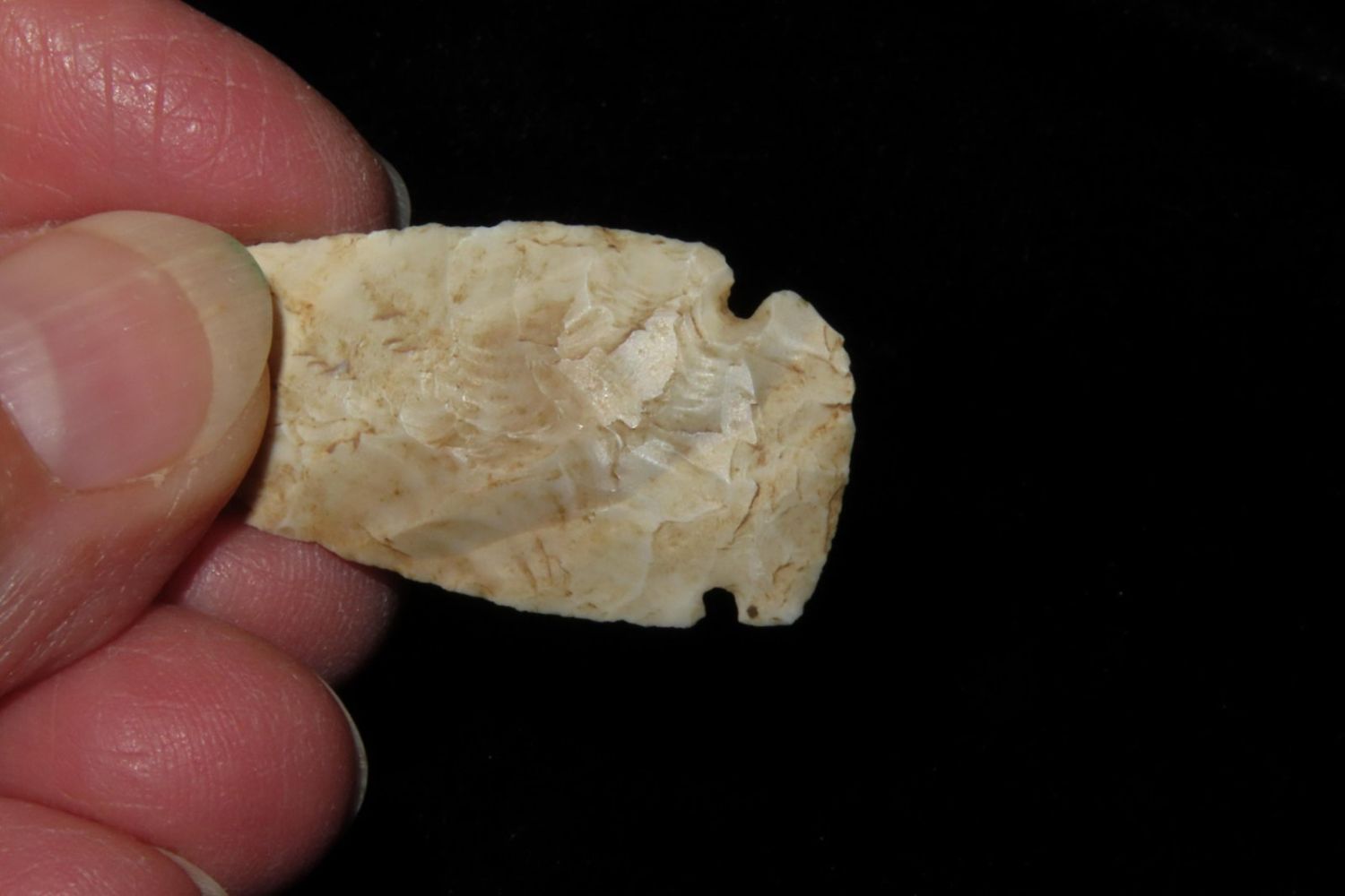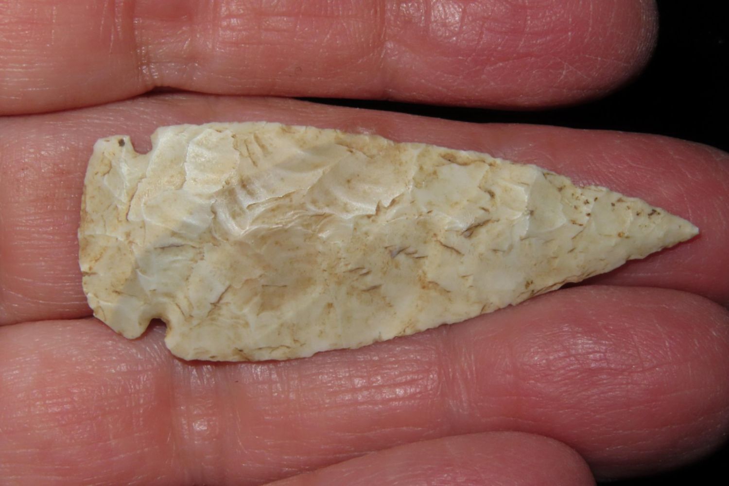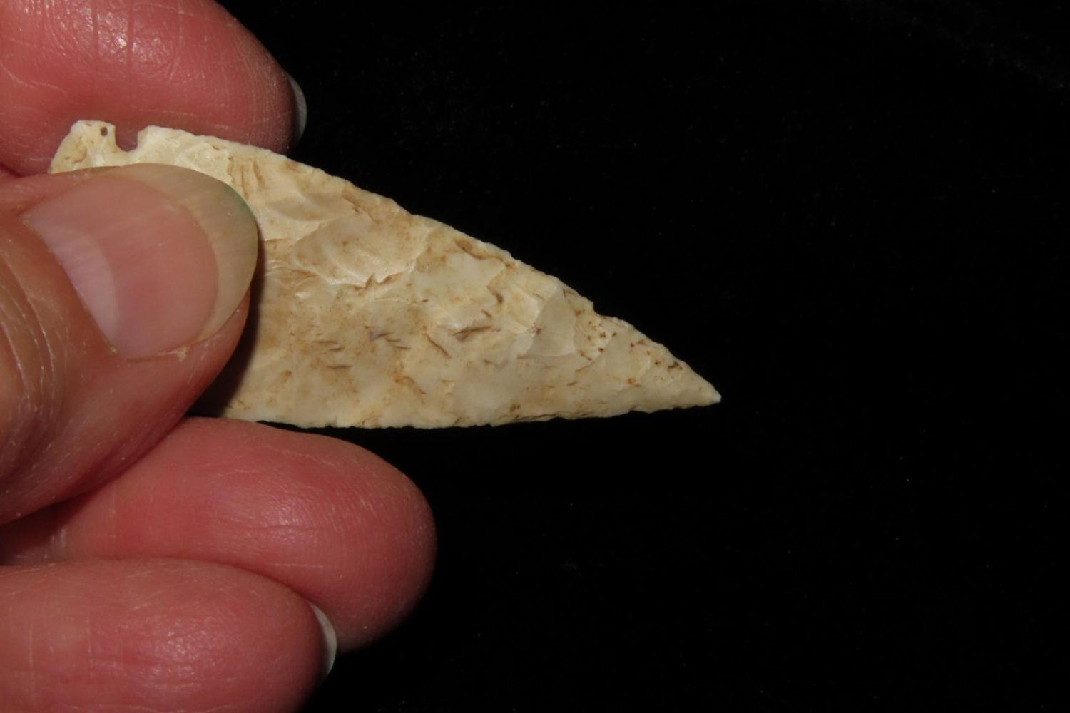 2" Micro Notch Howard County. Extremely fine and thin. Well made rare type. From the James and Joe George Collection. Joe George was an avid collector and finder of Native American artifacts in the greater St Louis Missouri area. Joe collected his entire life. Upon his passing he turned his collection over to his son James. James was also a very avid collector. He enjoyed walking various waterways and attending artifact shows. James is looking forward to passing down his collection to the relic community for caretaking.