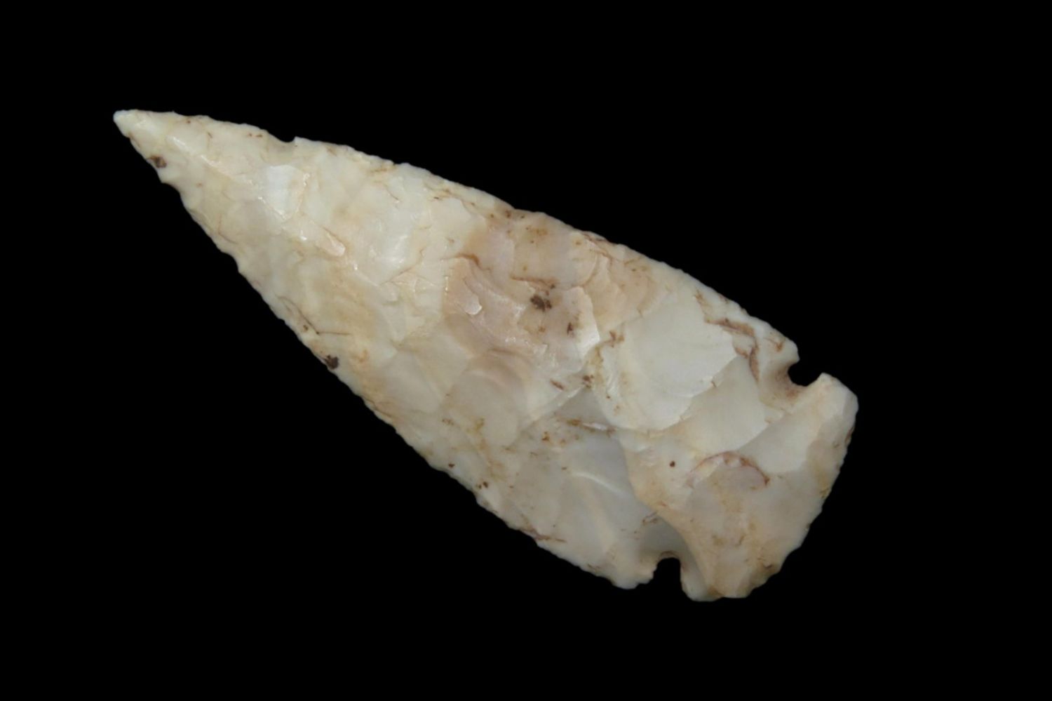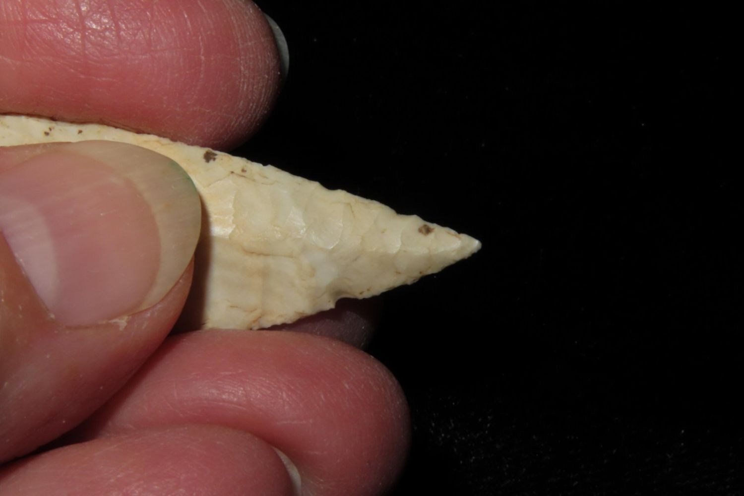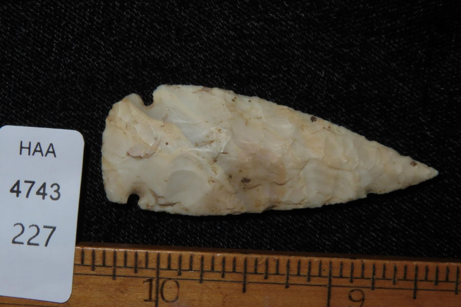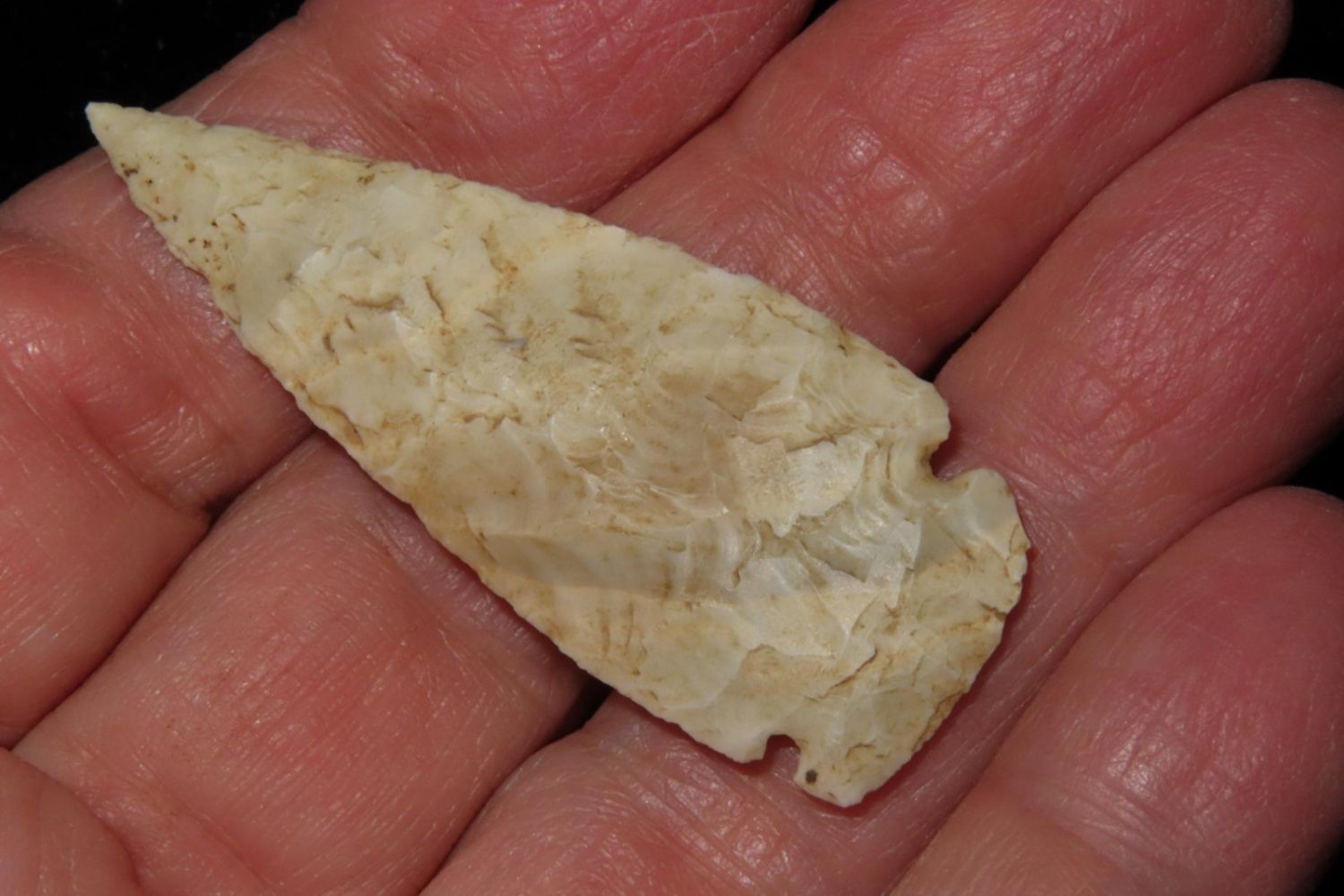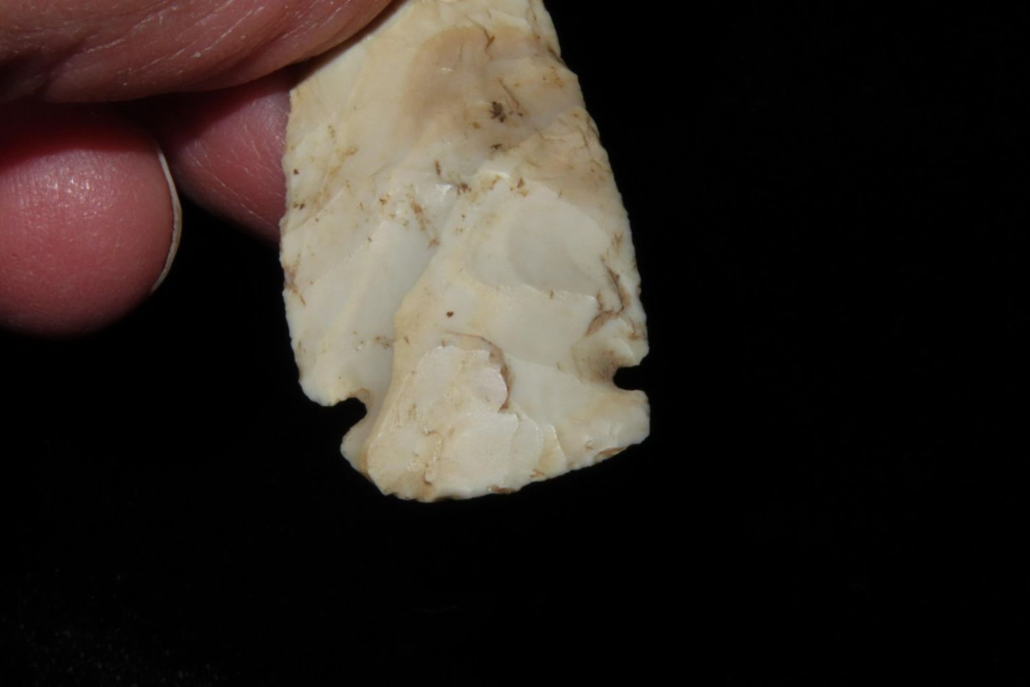 2" Micro Notch Howard County. Extremely fine and thin. Well made rare type. From the James and Joe George Collection. Joe George was an avid collector and finder of Native American artifacts in the greater St Louis Missouri area. Joe collected his entire life. Upon his passing he turned his collection over to his son James. James was also a very avid collector. He enjoyed walking various waterways and attending artifact shows. James is looking forward to passing down his collection to the relic community for caretaking.
